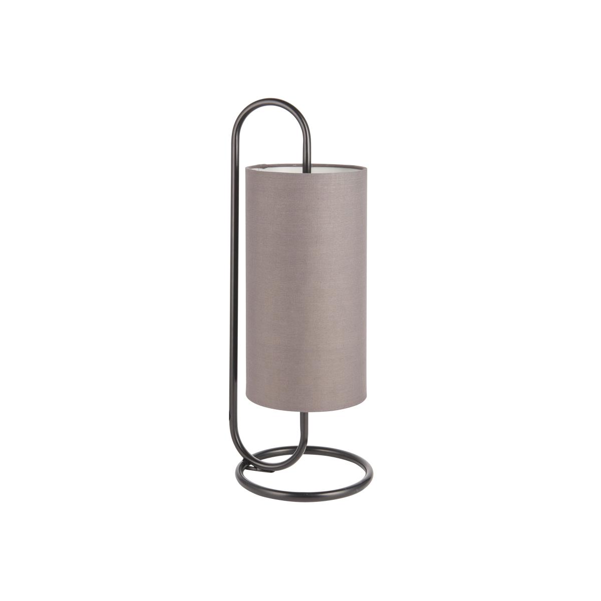 Floating cylinder grey fabric shade encapsulated by the soft curves of matt black painted metal work. A table light perfect for today's contemporary living; matching items and other finishes also available.