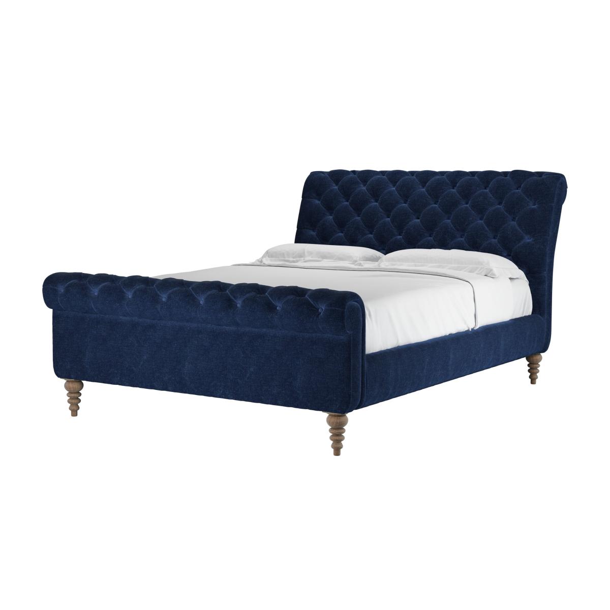 Our Knightsbridge bed is an ultra-luxe design, with a high headboard, turned legs and deep tufting. It is available with or without a scrolled, tufted footboard and has a graceful, curved silhouette which echoes features of a classic Chesterfield design.