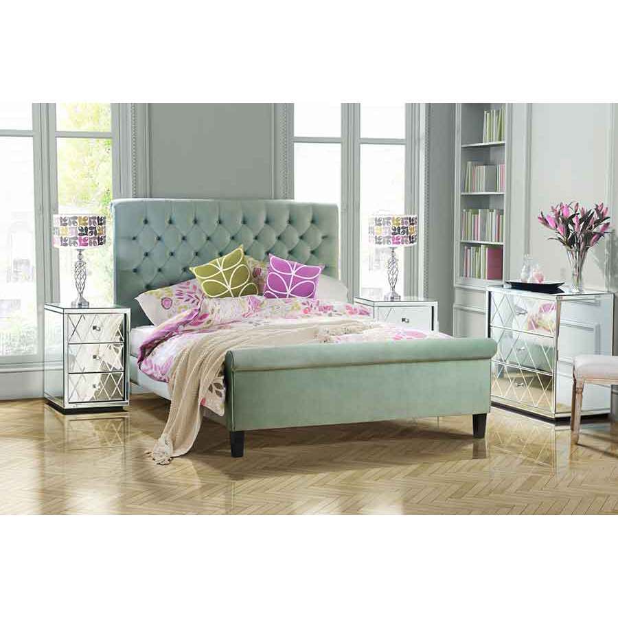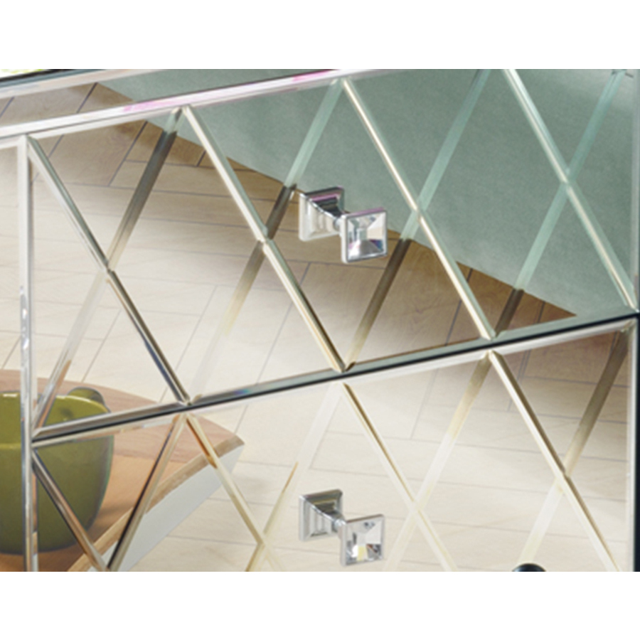 A unique look featuring inter-crossing grooves on the mirrored panels. A slight recess on the drawers, adding charm and character to each piece in the range. Large square diamond shaped handles, a bond of hard crystal and metal for a superior look. The range features bedside table, a dressing console, 3 drawer low chest, 5 drawer tall chest, mirrored stool, and dressing mirror. Exclusively designed and sold by My-Furniture. Shown here: the bedside table in the range, featuring 3 spacious drawers. Delivered fully assembled. 4 mm Bevelled Mirror. Chrome Handles. Weight 30kg each.