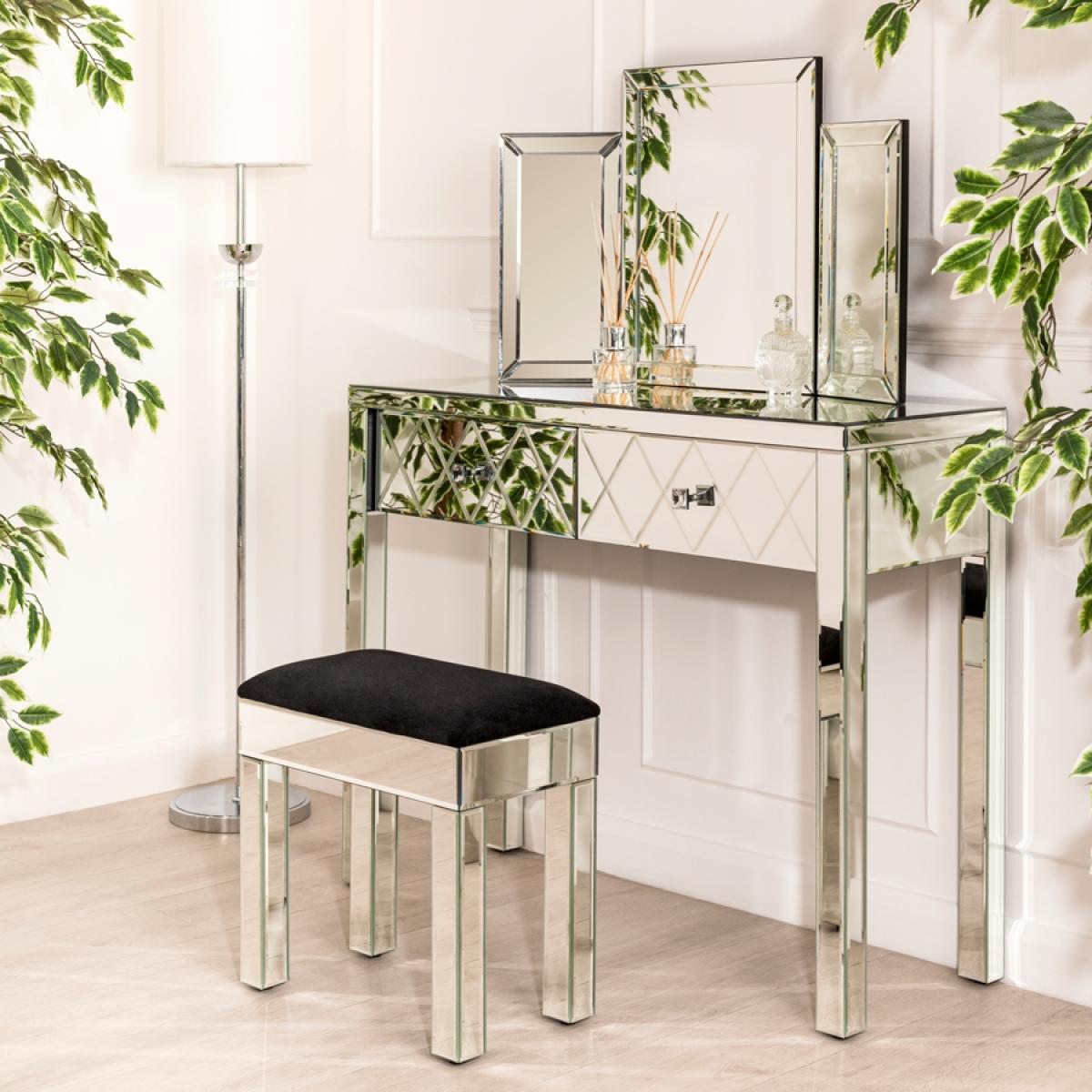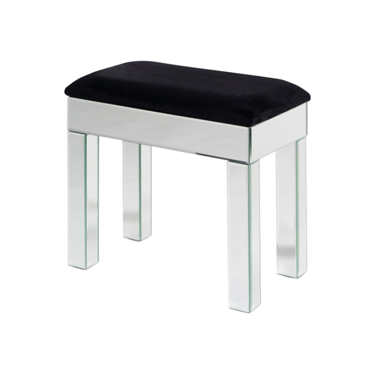 A unique look featuring inter-crossing grooves on the mirrored panels. The range features bedside table, a dressing console, 3 drawer low chest, 5 drawer tall chest, mirrored stool, and dressing mirror. Exclusively designed and sold by My-Furniture. Shown here, the mirrored stool - light but sturdy. Requires minor assembly ( 5 mins one persons). It comes flat packed and requires minimal assembly. HAVE OUR STOOL COVERED IN YOUR FABRIC. BESPOKE COVERING SERVICE AVAILABLE CONTACT US FOR DETAILS.