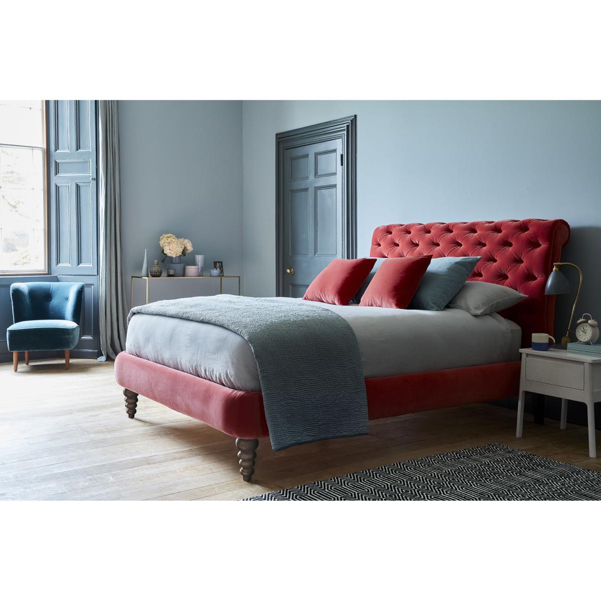 Our Knightsbridge bed is an ultra-luxe design, with a high headboard, turned legs and deep tufting. It is available with or without a scrolled, tufted footboard and has a graceful, curved silhouette which echoes features of a classic Chesterfield design.