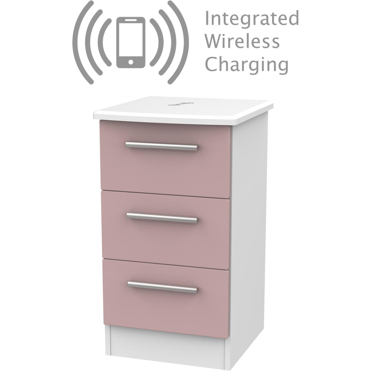 This 3 drawer bedside cabinet is practical and stylish. Perfect for any bedside or as a free standing storage unit. Comes with the advantage of wireless charging,. Constructed from sturdy materials, this stunning range has been designed with today lifestyle in mind. With its clean lines and seductive colour palette, it will add sophistication and contemporary style to your home. All our furniture is made in the United Kingdom, to the highest quality. It is delivered direct to your location of choice by one of our two man delivery teams, and come full assembled (although legs may be removed to prevent damage in transit).
