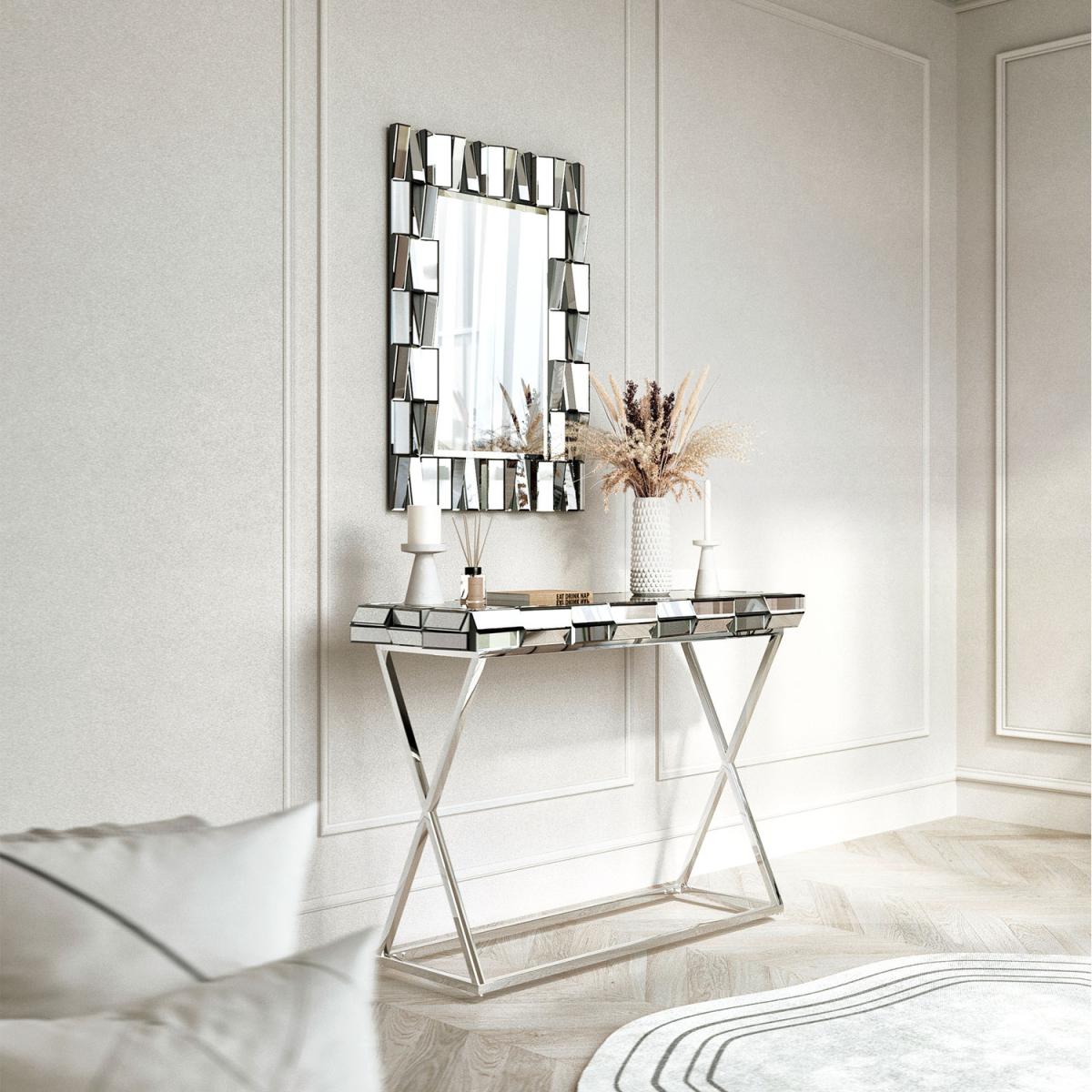 The Knightsbridge collection is designed exclusively by us for us, showcasing the ultimate in contemporary luxury. This combination set comprises of the console table and rectangle wall mirror, both featuring chunky two-tone rosegold silver and grey silver oversized glass in a 3D effect. The chrome legs are a modern crossed design and the tabletop is mirrored. The mirror can be hung either portrait or landscape depending on your preference. This set will be perfect for any living or dining area, and even in the hallway. Also sold as a set with the matching side table.