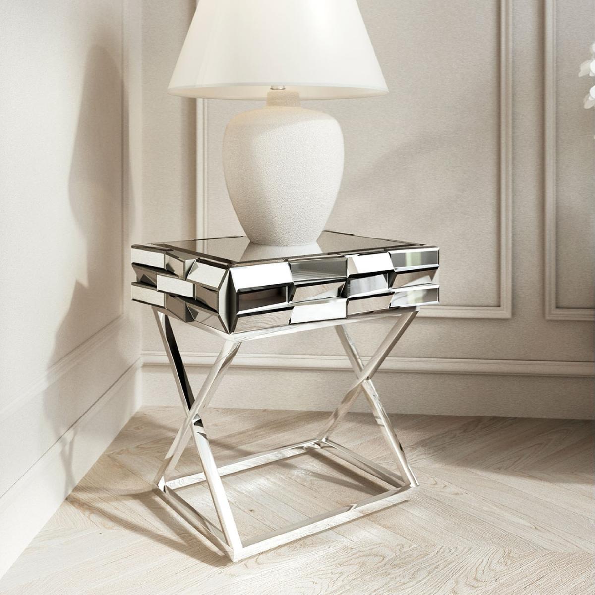 This stunning silver side table boasts contemporary luxury, featuring two-tone silver and grey oversized glass complete with a mirrored table top making this the perfect statement piece in any home. The contemporary chrome crossed leg design creates a focal point in any room and there is a concealed pull-out storage drawer. This striking side table is perfect for any living, dining or hallway area and will add a statement in any home. The perfect piece for a standalone statement or for a coordinated look pair with a matching wall mirror or console table from the Knightsbridge collection.