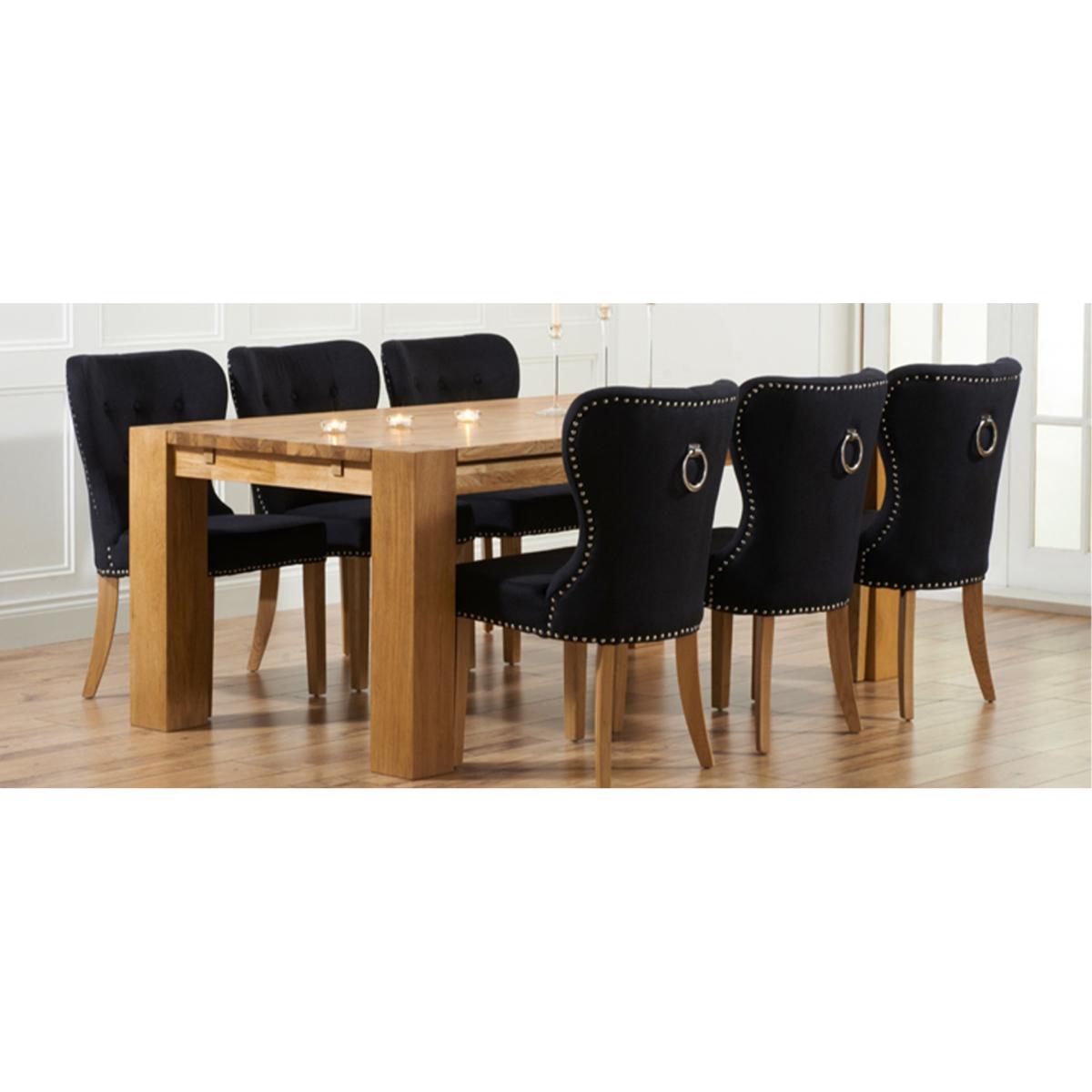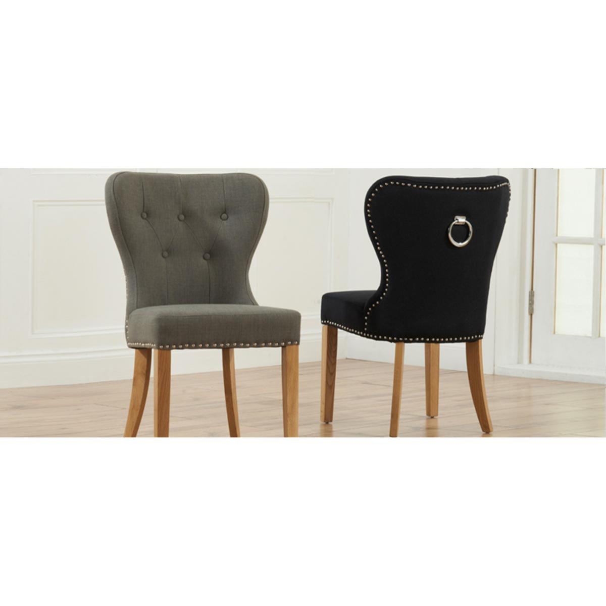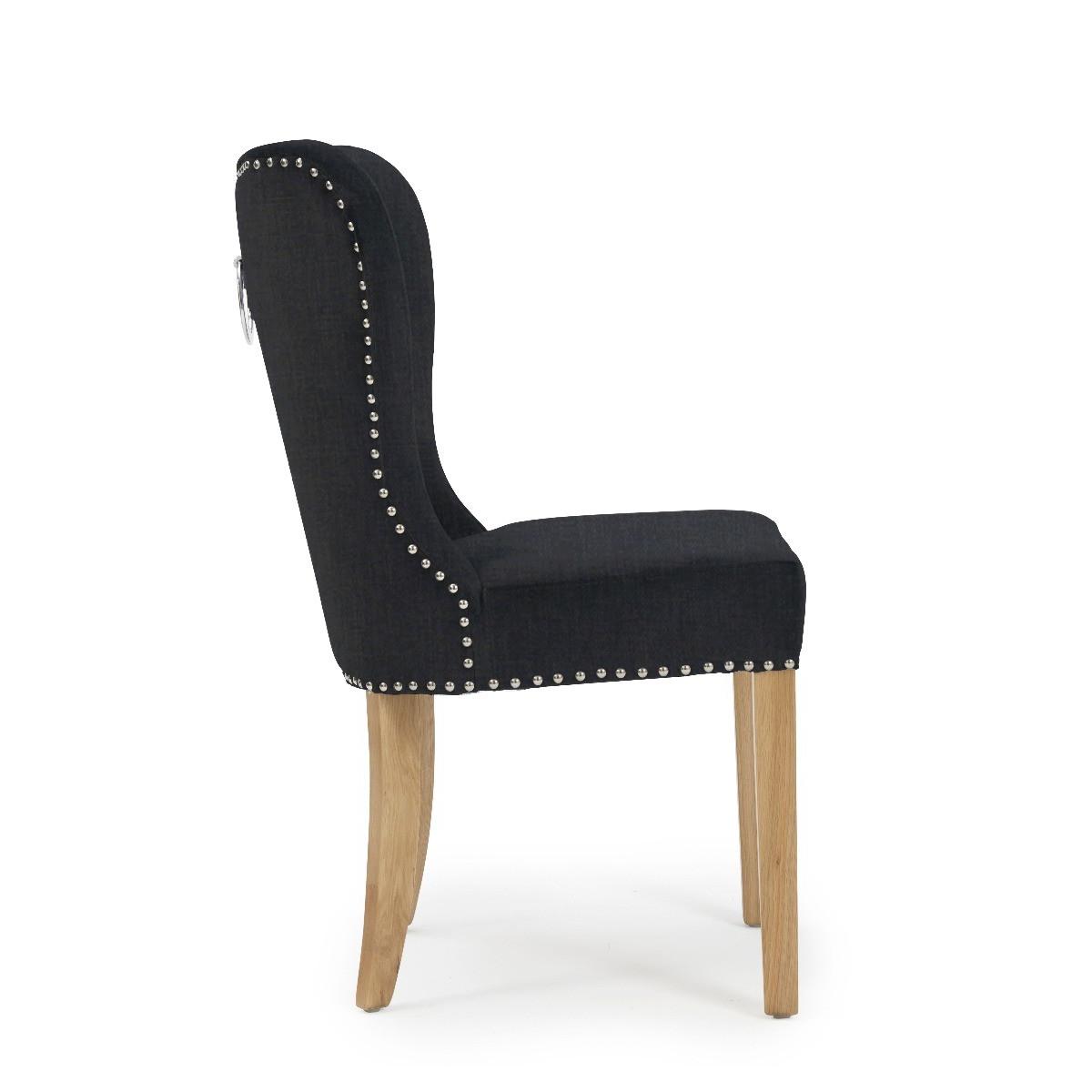 Upholstered in a beautiful black fabric with a chrome knocker detail to the backrest, the Knightsbridge chairs are a distinctly elegant addition to your dining suite. A stunning alternative to leather or faux leather chairs, the Knightsbridge Dining Chairs feature charming studded detailing and a tufted button design. Complete with solid oak legs. Also available in Grey.