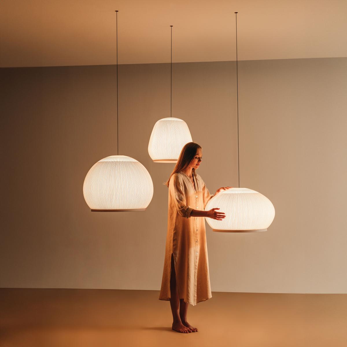 Light and materiality resonate with Knit. This Pendant is characterized by the quality of the light emitted by its knitted textile Lampshade: a soft luminous effect that makes for a warm atmosphere. Knit bathes the surrounding space in a soft 360-degree glow. This Pendant illustrates the work of German designer Meike Harde, who is constantly exploring the fundamental properties and performance of materials. In the case of Knit, Harde was looking for a textile material capable of filtering light, while playing with tones and textures.