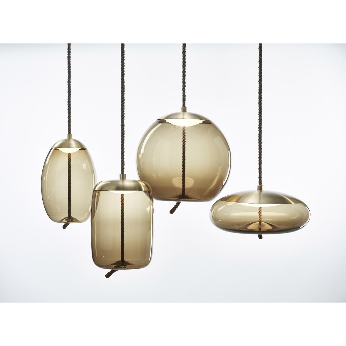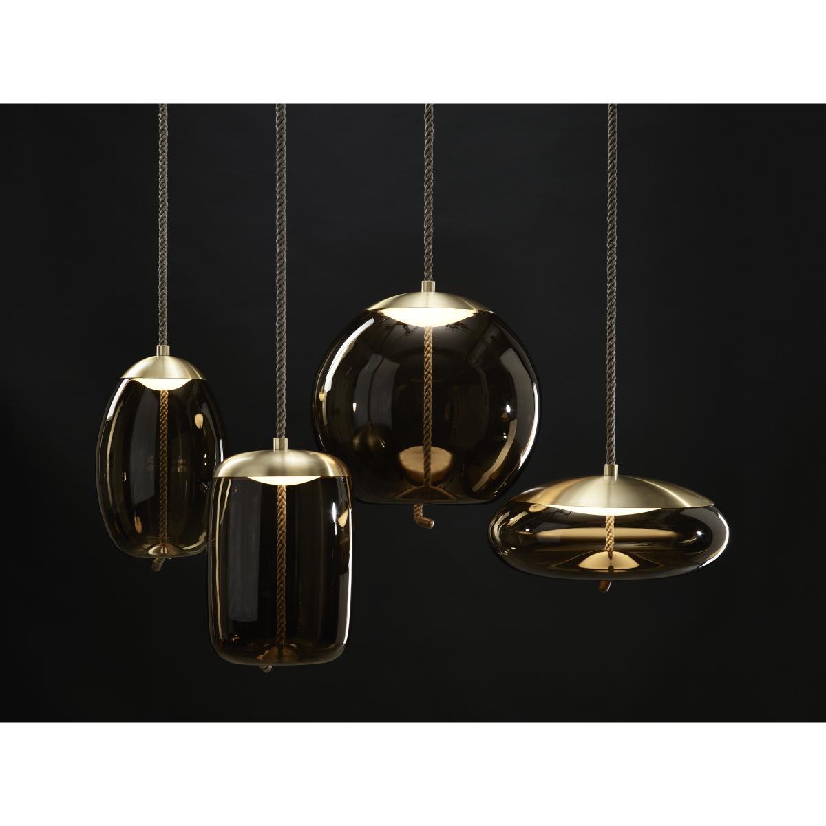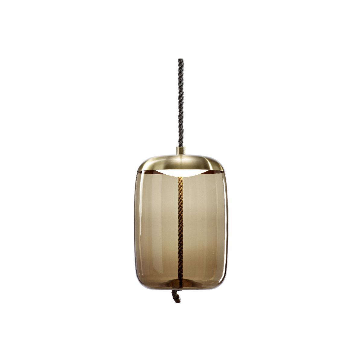 Poetic and refined, this pendant boasts a pure and graphic presence. It offers a surprising contrast between rigidity and flexibility, robustness and lightness. A large rope pulled taut runs through the blown glass sphere, tracing a strict, vertical line in space. The rope’s raw material makes its visible way through the centre of the glass’ transparency. The full, round shapes of the sphere are severed by the strong, straight cable, which appears to distort the glass bottom creating a plastic, elastic effect. The knot located at the end of the cable, beneath the lampshade, is an aesthetic element characteristic of the collection. The glass dome is topped with an elegant brass cap. The Knot is worked with great attention to detail; the end of the rope and the ceiling rose are also in brass. The LED source is situated in the opal glass diffuser, beneath the metal cap. When the light shines inside the glass dome, it casts an almost supernatural glow. Within the glass bubble, the light is magnified, protected and sheltered. It emits a warm and vibrant light created by the superb hues of the glass.