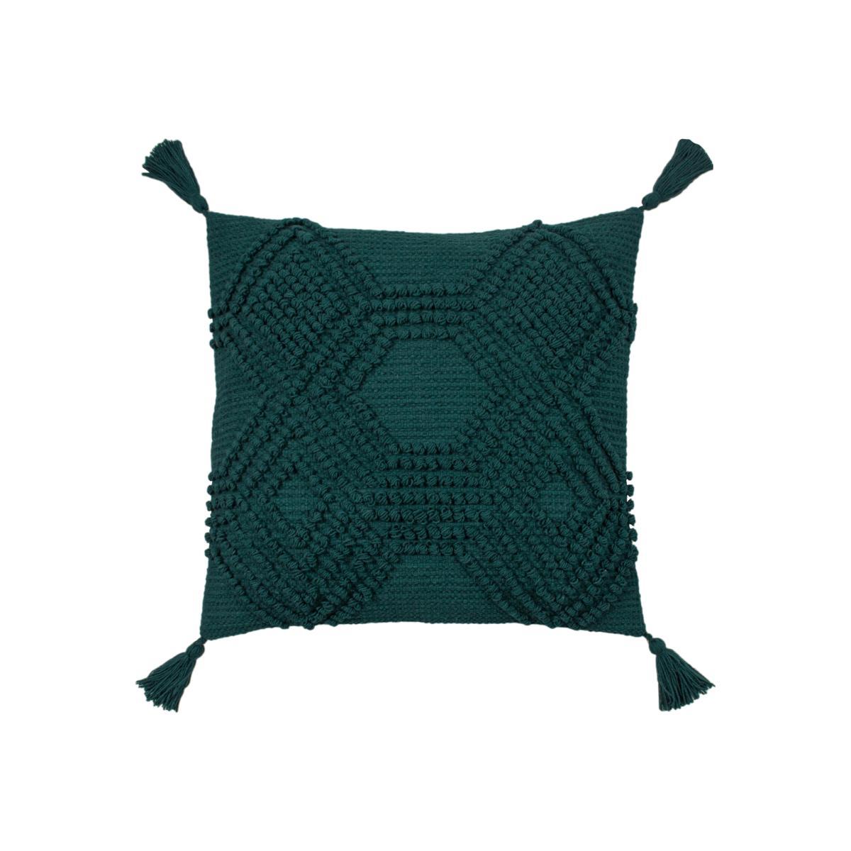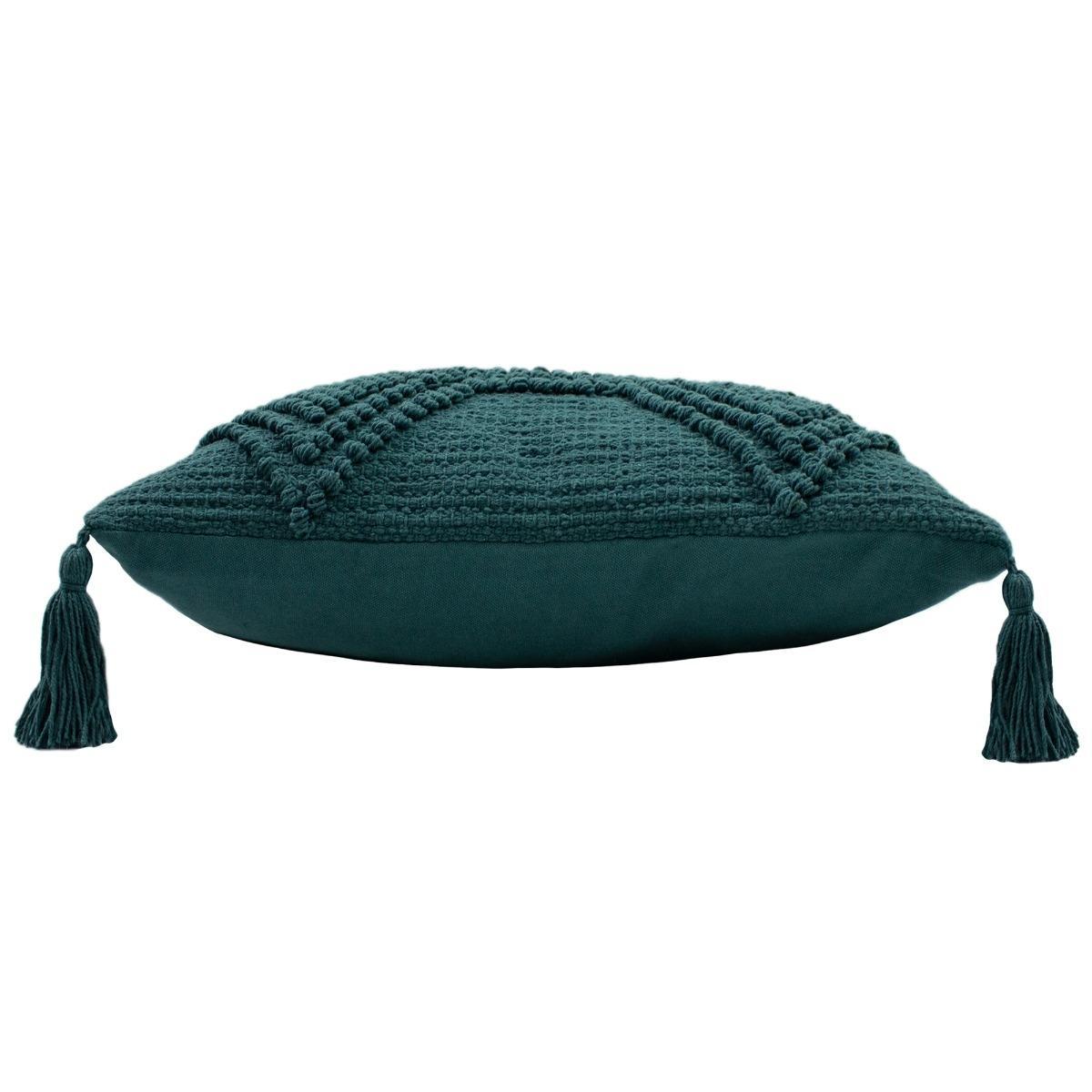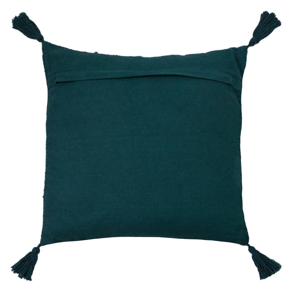 Design. Add texture to your space with the Knotted Teal Cushion, an Aztec inspired tactile print to the front of the cushion provides a unique look without being overly fussy. Its tranquil teal colour is an elegant choice and will look great in a range of rooms in your home. Tufted features at each corner are the perfect finishing touch to this bohemian yet minimalist cushion. Place on a sofa, chair or bed to add instant style to your home.