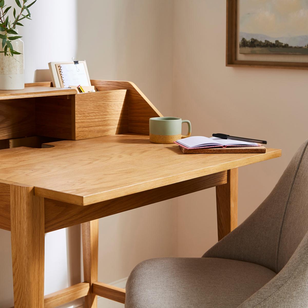 This desk redefines functionality, featuring a larger drawer underneath the worktop, offering ample storage space for all your essentials while keeping the surface clutter-free. The extending worktop provides flexibility, adapting to your needs seamlessly. What sets this desk apart are the lift-up storage compartments on either side, ingeniously designed to accommodate your monitor, ensuring optimal viewing height and freeing up valuable desk space. Additionally, the desk incorporates smart cable management at the back, keeping wires organised and out of sight, enhancing the overall tidiness of your workspace. Crafted with precision and attention to detail, this Compact Desk combines practicality with a sleek, contemporary design, making it a perfect fit for modern living. Embrace the efficiency of smart storage solutions and maximise your space without compromising on style with our Compact Desk – your ultimate companion for productivity and organisation in compact settings.