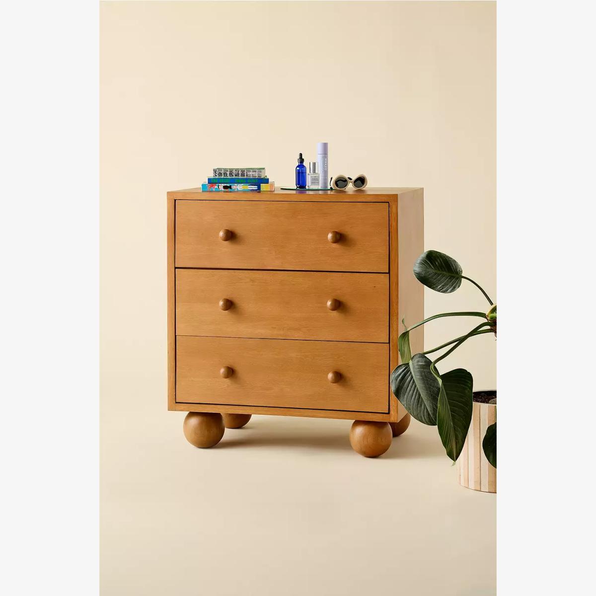 Blending retro and modern design, this low-slung wooden dresser features three spacious drawers propped on bulbed legs. Each drawer is accented with two classic round knobs for a refined look. Available exclusively at Urban Outfitters. *Online return only. This item cannot be returned instore. Please note furniture items currently cannot be shipped to Northern Ireland or The Republic of Ireland. Delivery of large furniture items may take 1-2 weeks and are therefore not eligible for Next Day Delivery.* **Content + Care** \- MDF, Mango wood, Birch wood \- Wipe clean **Size** \- Dimensions: L: 76 x W: 46 x H: 84 cm \- Leg height/Clearance: 12 cm removable \- Drawer dimensions: L: 66 x W: 35 x H: 16.8 cm \- Weight limit: 11.2 lbs per drawer \- Weight: 145.9 lbs \- Shipping package dimensions: L: 86 x W: 56 x H: 81 cm \- Shipping package weight: 158.4 lb