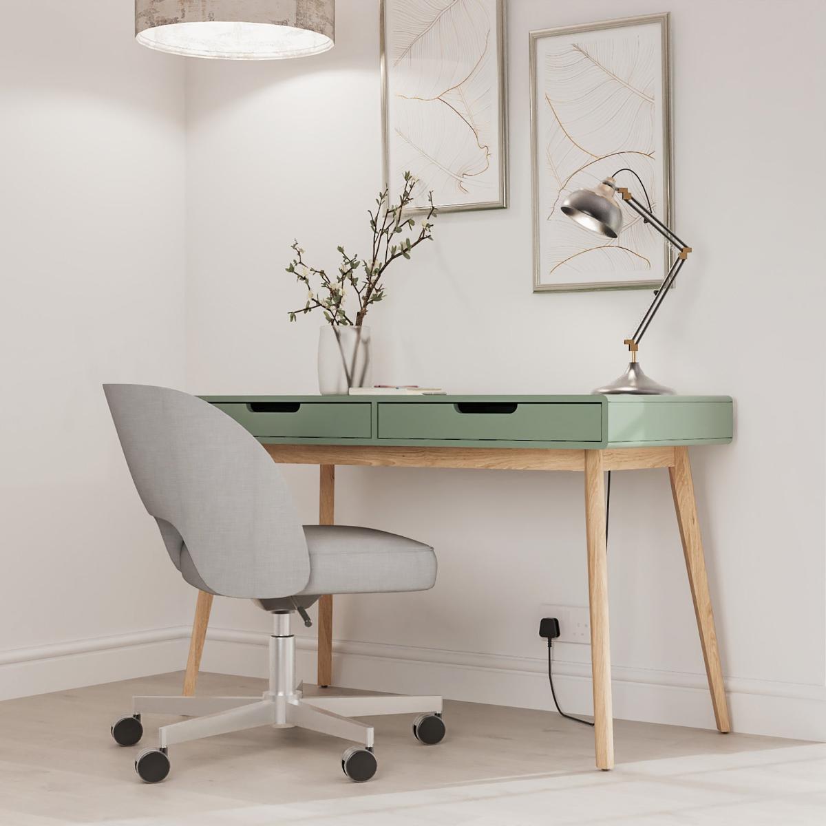 I love how the Knut desk in this shot combines practical functionality with a clean, fresh aesthetic. Its soft green hue makes it a versatile centrepiece that works particularly well in Scandinavian-inspired or modern minimalist interiors, adding a touch of colour without overwhelming the space. Style it with slimline accessories and a tidy surface to keep the look sleek, or add some greenery and textured items to bring warmth and personality. Practical tips include using wall-mounted organisers or adding beneath-desk storage to optimise space, especially in smaller rooms. This desk is perfect for a home office or creative corner, where its calm colour promotes focus while blending seamlessly into a variety of interior styles.