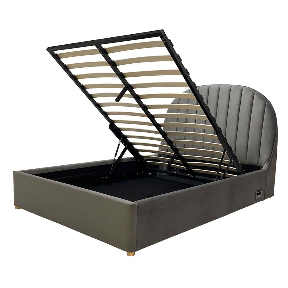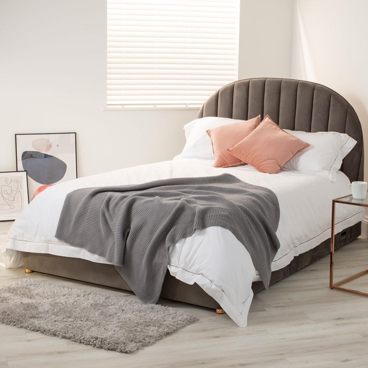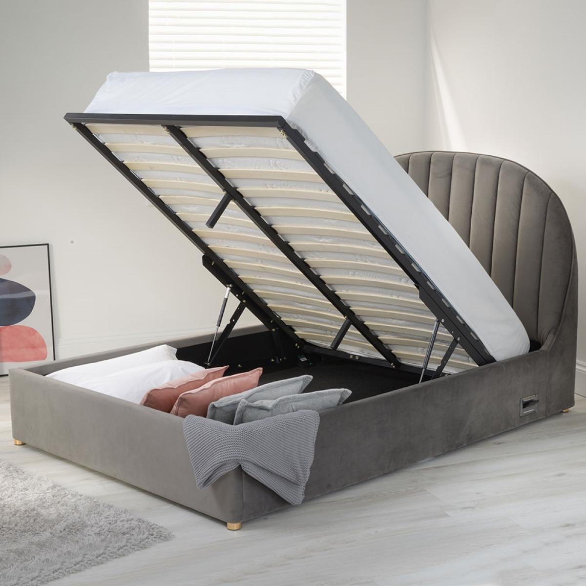 With all the features included in the Freya Smart Ottoman Bed from Koble, you may never want to get out! Available in either a double or a king size, the upholstered bed frame features handy wireless charging pockets on both sides, allowing you to charge your phone whilst sleeping without the annoyance of tangled cables! Plus, with USB ports, even if your phone isn't compatible you can still charge your phone. Styled in gorgeous grey velvet, the large rounded headboard will be oh so comfy to lean against when enjoying breakfast in bed and with the hidden Bluetooth speakers, connect your smartphone or tablet and fall asleep to an audiobook or wake up to music. What's more, with the built-in under bed storage, this bed is perfect for those short on space. With other Smart designs available from Koble, update your home with their range of multifunctional desks and side tables!.