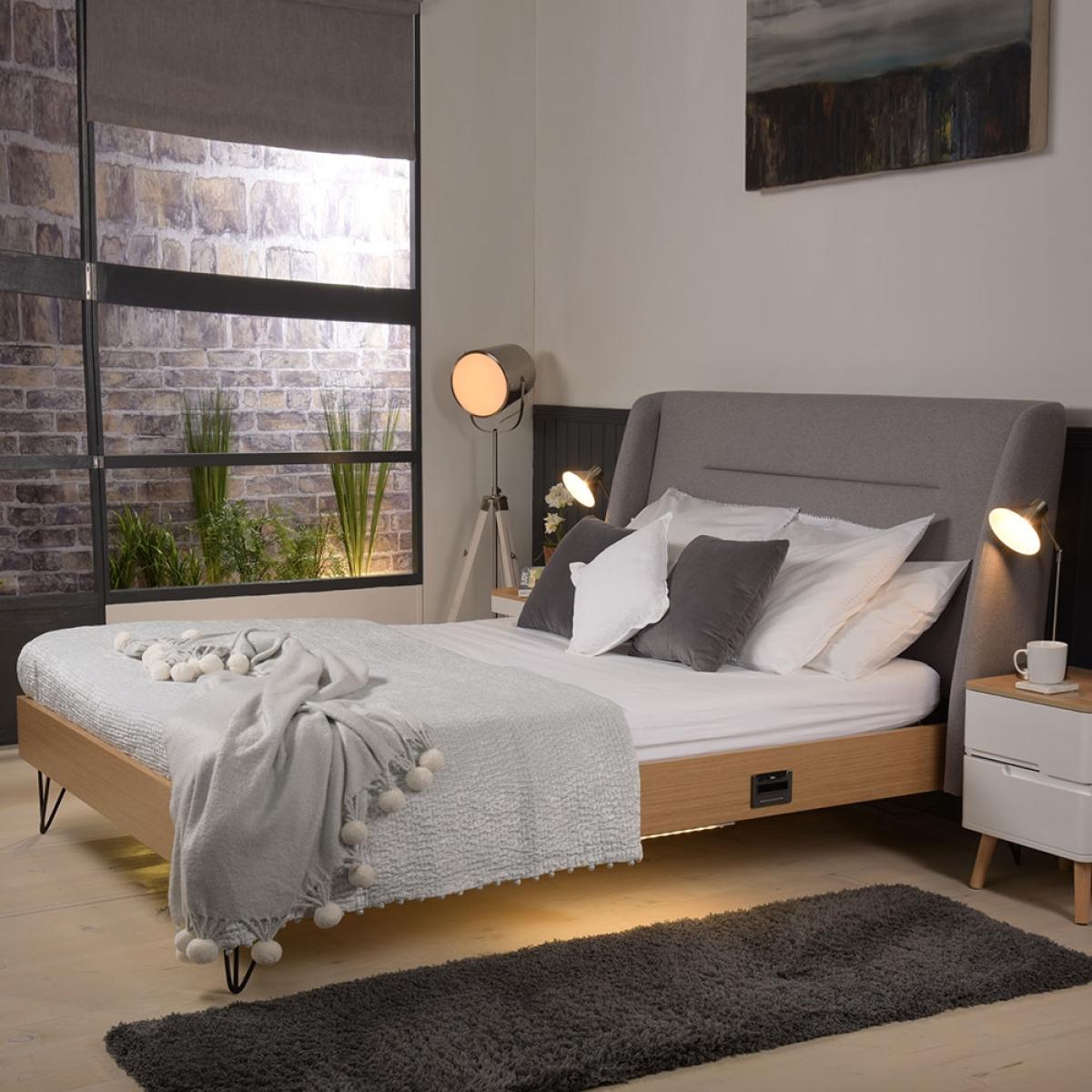 Available in 2 sizes, the Koble Snor Smart Bed has some innovative features that'll make life a little easier! On both sides of the bed Koble have included handy wireless charging pockets so your smart phones can quickly recharge while you recharge! And even if your device isn't compatible, there are USB points you can make use of! Connect your smartphone or tablet to the premium Bluetooth speakers hidden in the headboard and wind down with audiobooks and podcasts,wake up to music or why not connect your TV and experience exceptional sound while watching your favourite shows in the comfort of your Snor bed! And if you need to get up in the night, the soft, motion sensor underbed lights will guide you back to bed. Not forgetting the whole point is to get a good nights sleep; the Snor Smart bed is of course comfortable too! With a cushioned, upholstered headboard and wing design, you'll wake up feeling well rested and ready to face the day! Styled in grey with Oak veneer sides and industrial metal legs, this brilliant bed really does tick every box and more. With other Smart designs available from Koble, update your interiors with their range of multifunctional desks and side tables!.