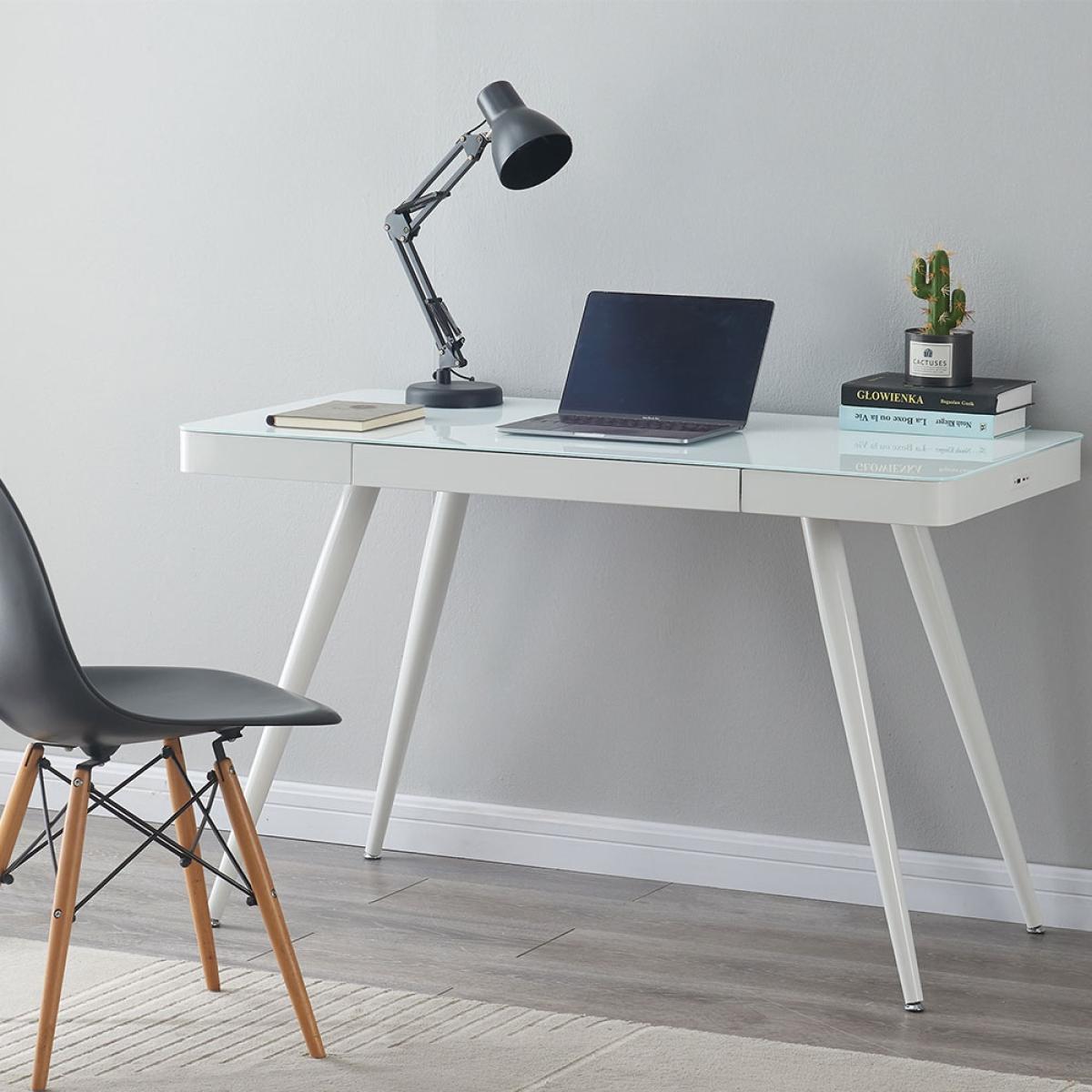 I love this stylish desk for its sleek, modern design and practicality, especially with the built-in speakers and wireless charging feature. It’s perfect for contemporary interiors, whether you’re styling a minimalist home office or a tech-savvy workspace. The clean lines and understated look work well with Scandinavian, industrial, or even eclectic interiors. A tip for styling it: keep the surface clutter-free by pairing it with organised storage solutions or stylish organisers to highlight its contemporary aesthetic. Complement it with a matching chair and soft lighting to create an inviting yet efficient workspace.