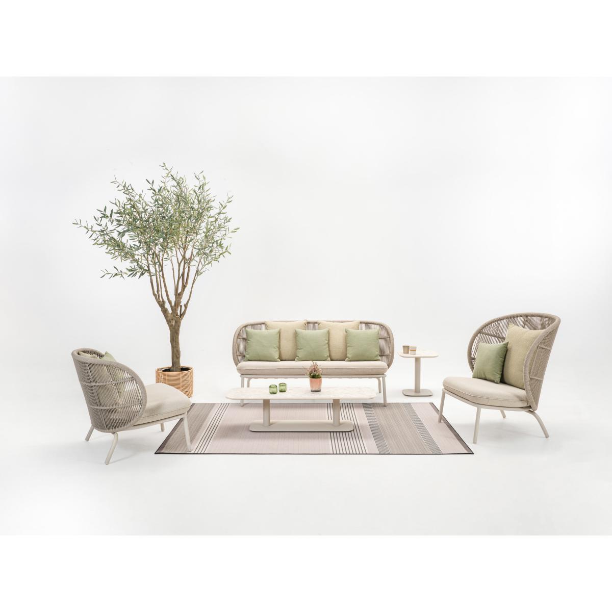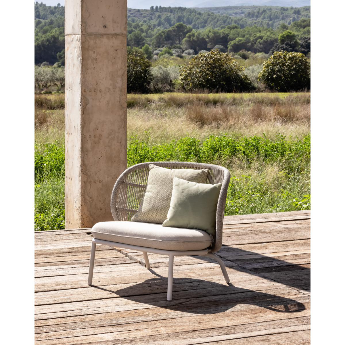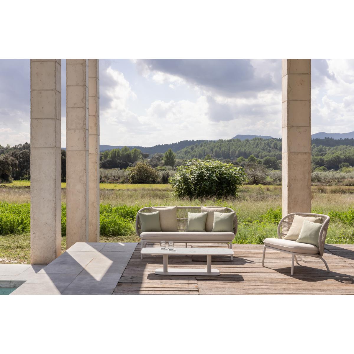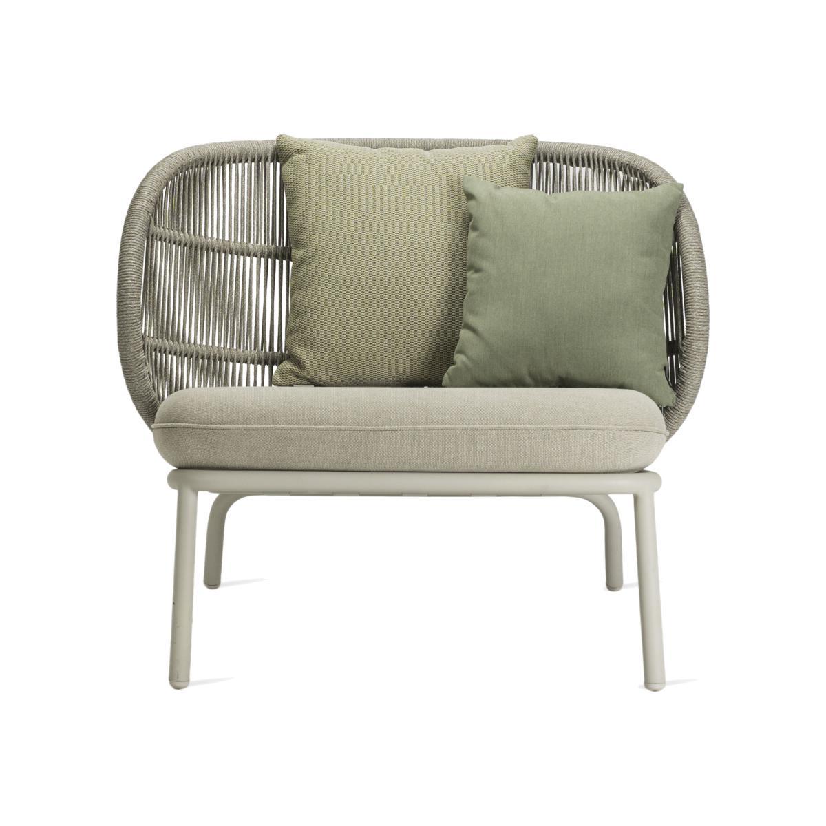 Modern weaving… The Kodo Lounge armchair combines comfort, lightness and modernity. With its sculptural, rounded lines, the Kodo armchair comprises a large, inviting shall made with hand-woven polypropylene cord on an aluminium frame. The high oversized backrest forms a rampart, a private alcove. The flaps on either side of the head further reinforce this sense of intimacy. For total comfort, the shell has added soft cushions. With a high-couture style, the cushions are available in a stunning harmony of fresh colours. Dive into this sumptuously soft cloud! These water-resistant cushions have a removable cover. The Kodo armchair creates a harmonious dialogue between various materials: the braided cords provide a warm, ethnic look while the metal adds modernity and the fabric contributes a cosy style. With its sculptural presence, the Kodo armchair will become the star of the show in your outdoor dining space. It’s also perfect for creating a winter garden-style living room, entrance, dressing room or conservatory, etc. The polypropylene cord shell is handmade in Indonesia. The durable, hard-wearing material perfectly reproduces the warm, authentic aspect typical of natural fibre braiding. Kodo stands out with its attentive, careful design, the refinement of its finishes and its high quality of manufacture. Synonymous with exceptional seating comfort, high quality and durable materials, Vincent Sheppard furniture places craftsmanship at the heart of its DNA. Each Vincent Sheppard piece of furniture is handcrafted in Indonesia by the most highly qualified craftsmen. The knowledge and skills of local artisans elevate these creations to the rank of works of art. The Vincent Sheppard brand guarantees good working conditions and fair pay for all of its employees.