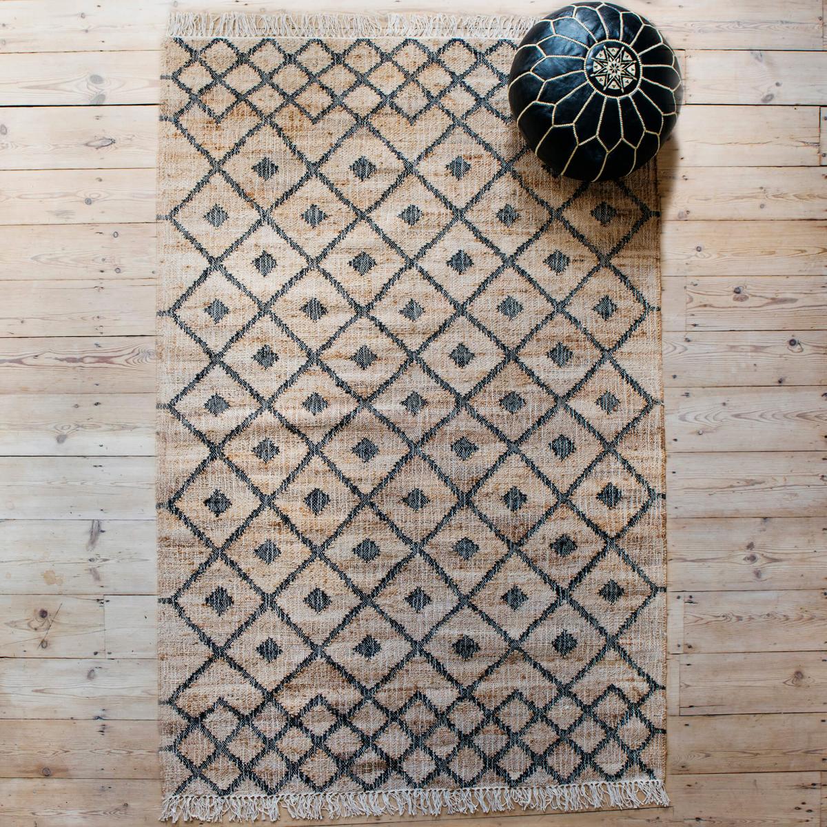 In a natural shade and woven from jute, refresh your kitchen or sitting room with this rug printed with a geometric black design.