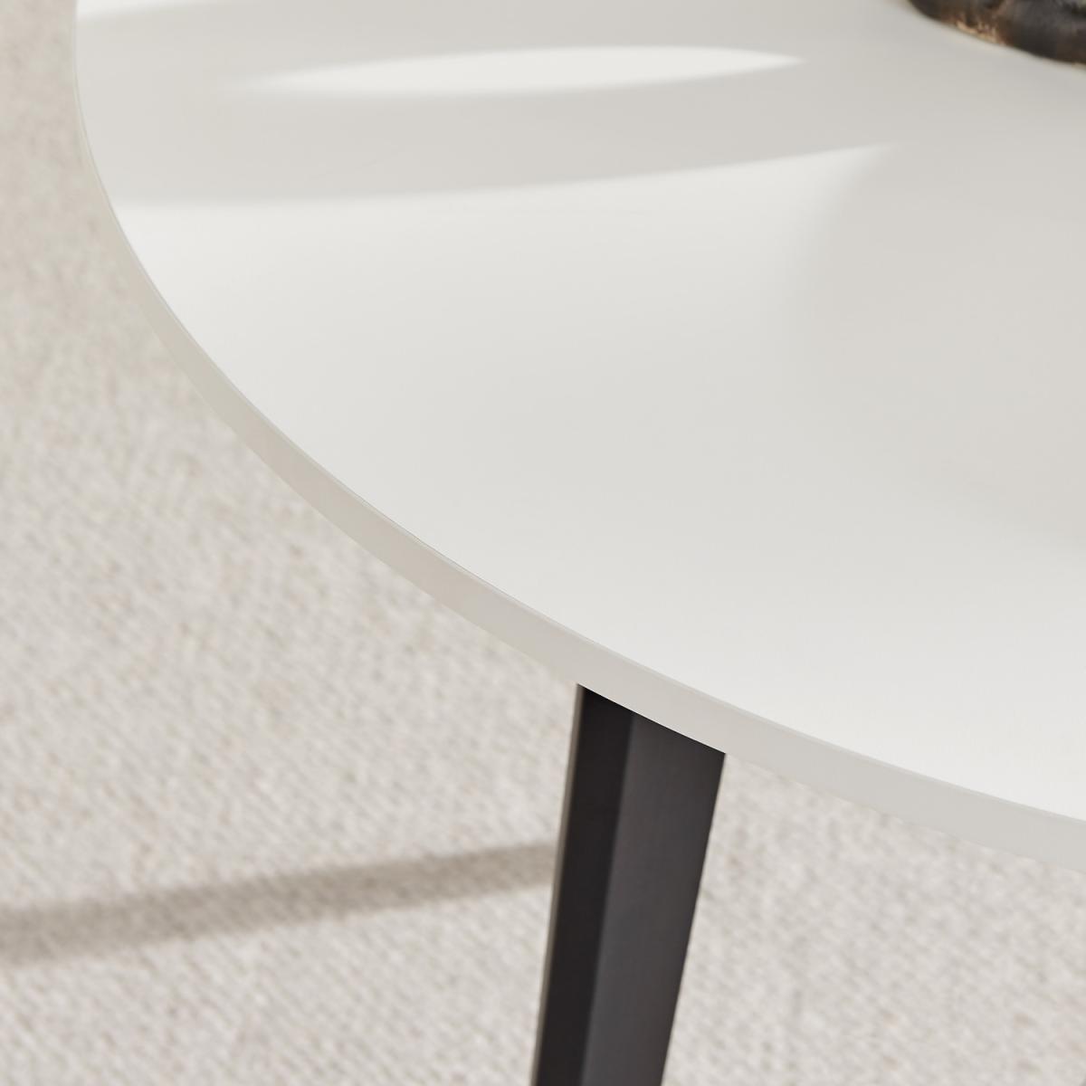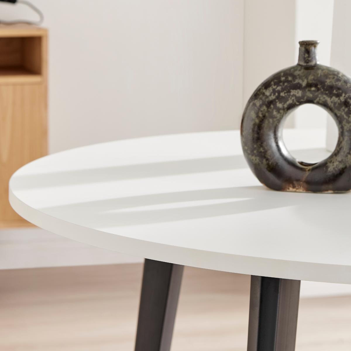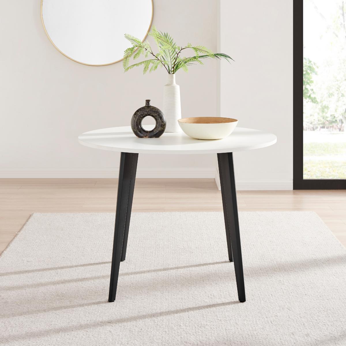Our Koko white round dining table with black legs is a modern and simple small dining table perfect for any dining room. At 100cm diameter, it's compact enough for contemporary open-plan spaces but large enough for a family or guests. The white top and elegantly tapered black legs keep this dinner table looking fresh and bright, and will help keep smaller spaces from feeling too cluttered. The unfussy design and those tapered legs give this lovely bit of dining furniture a clean and Scandi-inspired feel that's versatile enough to keep up with evolving trends. Constructed from strong wood composite covered in a durable, scratch-resistant white melamine veneer, and sat on four sturdy iron tapered legs that are powder-coated in black, this table is designed to last. The black and white creates a gorgeous contrast that will add dimension to your space. Dress it up with modern dining chairs for a contemporary look suitable for any home.
