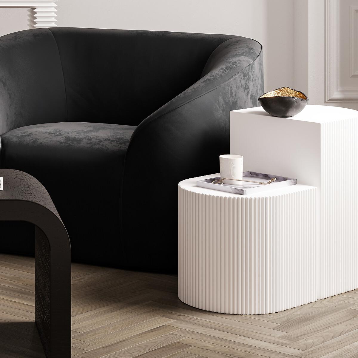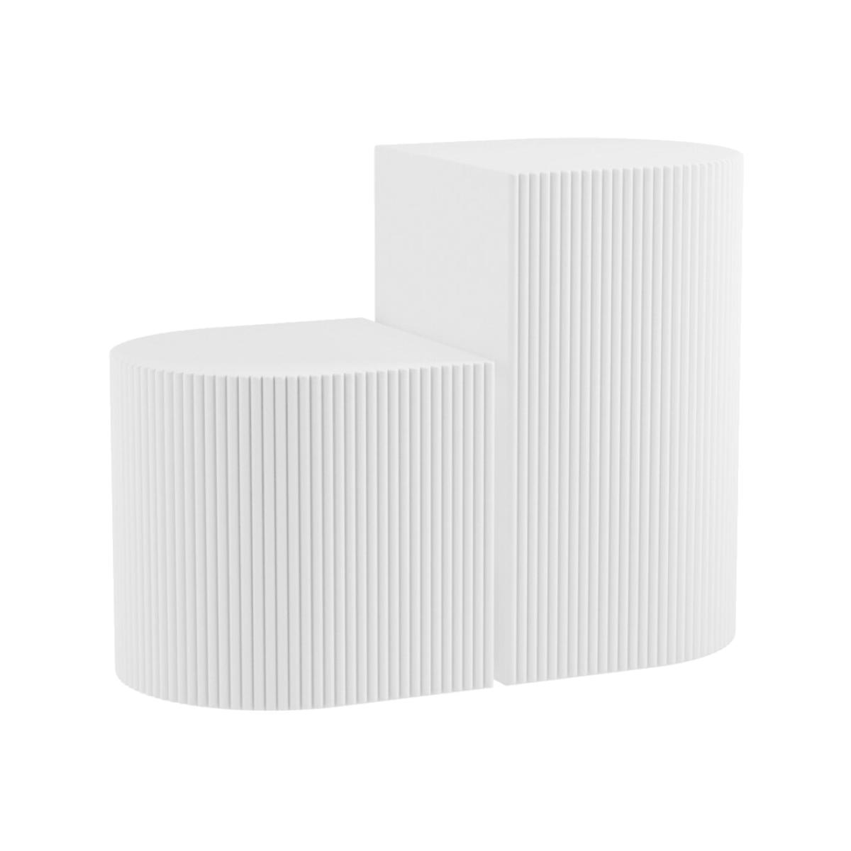 Two sculptural cylindrical tables are both finished in a sleek white lacquer with subtle reeding adding textural interest. The unusual design includes one taller table and one shorter table to create an artistic centrepiece for any living room. Product Details • Set of 2 • Curved shape • Lacquered finish • Delivered fully assembled • Care advice - clean with a soft dry cloth. Product Composition - MDFProduct Dimensions • Big table: L35 x H55.2 x W34.5cm, 6.1KG • Small table: L35 x H35.2 x W34.5cm, 8.7KG Parcel 1 Packaged Dimensions - 200 cm x 43 cm x 43 cm, Weight 10 KGParcel 2 Packaged Dimensions - 151 cm x 43 cm x 43 cm, Weight 7 KGThis product will be dispatched by one of our trusted suppliers. You’ll be contacted by their selected courier about your delivery. Please note: this product cannot be be delivered to all Offshore Islands, Scottish Highlands, Northern Ireland or Republic of Ireland.