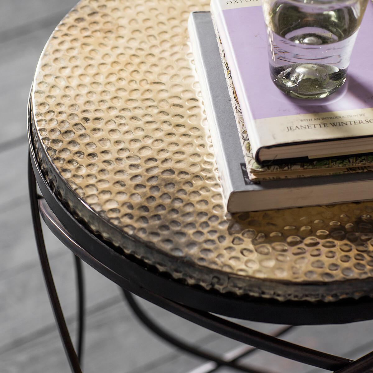 A stylish and practical side table with a gold hammered table top and clean cut metal legs in a curved spiral design, adding a cool and industrial look to your interior. Product details. Beaten metal top Assembly required. Product Composition - Iron. Product Dimensions - 40 cm x 40 cm x 60 cm , Weight - 2.4 KGPackage Dimensions - 68 cm x 44 cm x 44 cm, Weight - 3.85 kg. This product will be dispatched by one of our trusted suppliers. You’ll be contacted by their selected courier about your delivery. Please note: this product cannot be delivered to all Offshore Islands, Northern Ireland or Republic of Ireland. GALLE01