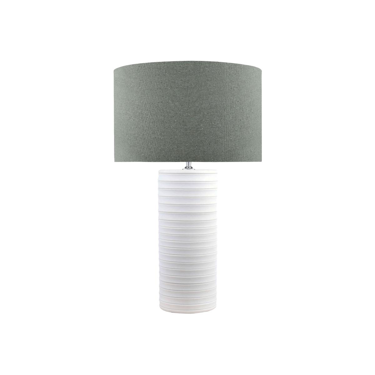 The versatile Koln table lamp looks great on lounge side tables or as an oversized bedside lamp. Why you'll love it Beautiful hand-thrown white ceramic base. Tactile unglazed finish adds texture and detail. Finished with an understated grey linen shade. What you need to know Made from porcelain with a linen shade. Takes 1 x E27 (ES) GLS bulb, max. 60. W. 1.4 metre cable with an inline rocker switch. Dust with a soft, lint-free cloth. Disconnect from power before cleaning. Dimensions Height: 75 cm (30 inches) Width: 40 cm (16 inches) Depth: 40 cm (16 inches) Weight: 3.7 kg