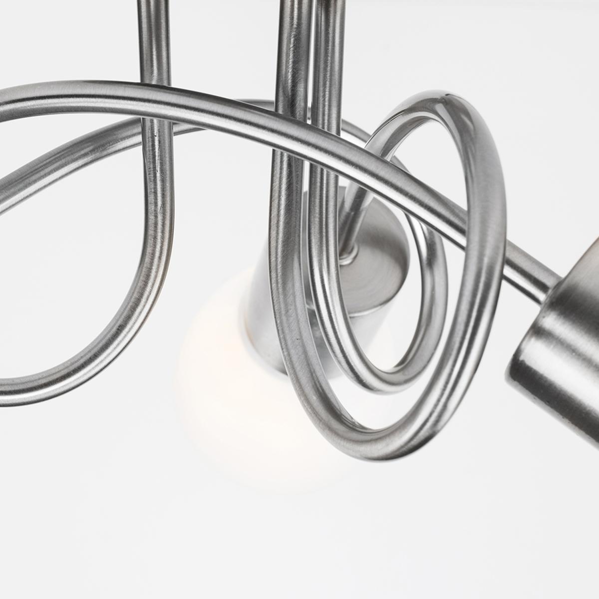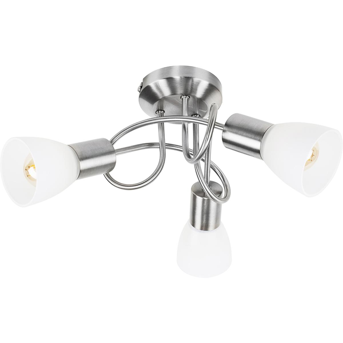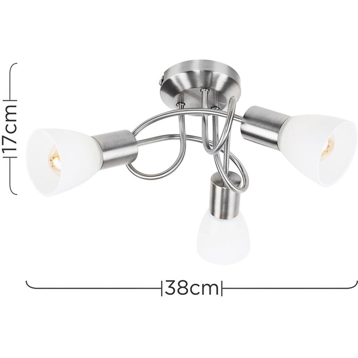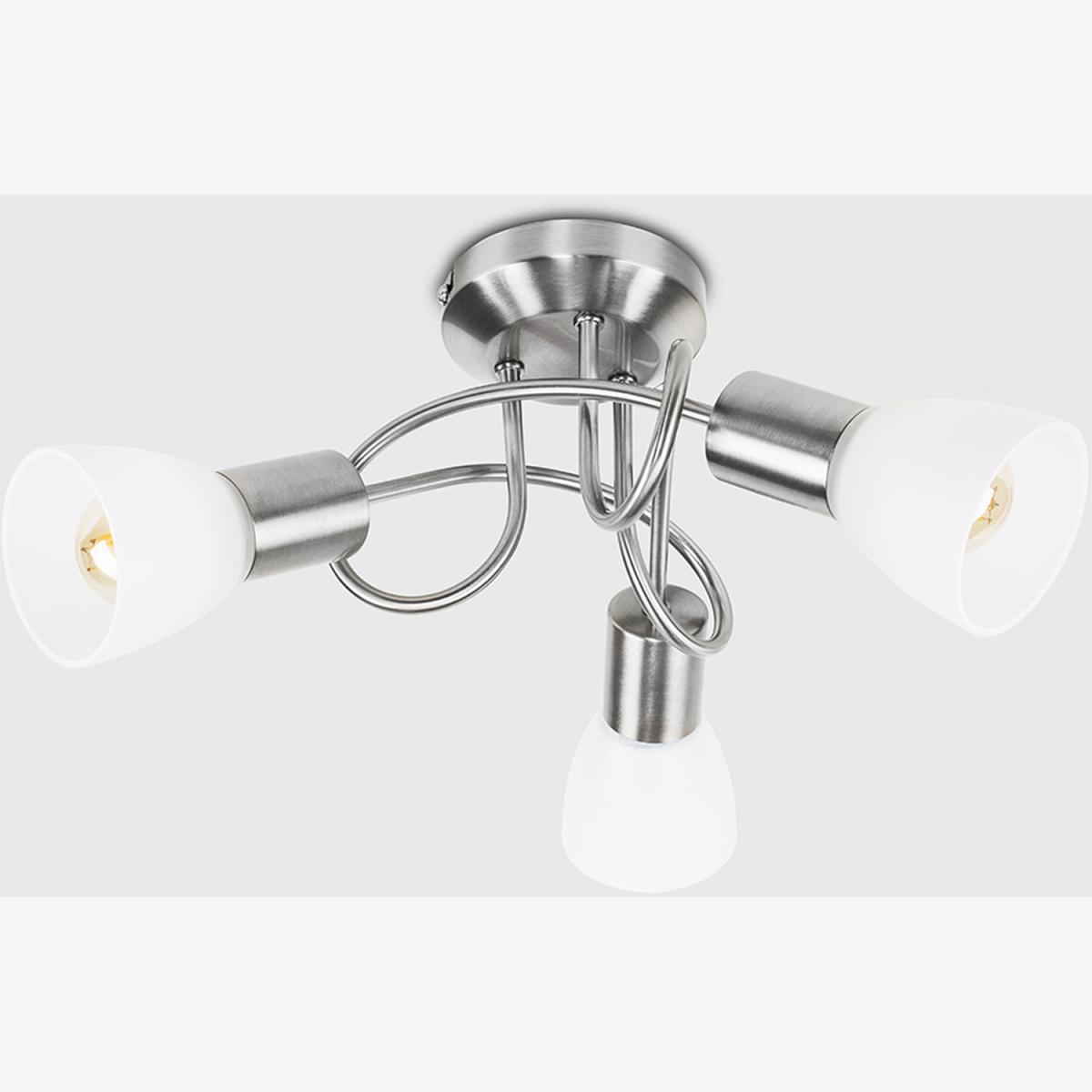 Contemporary modern 3 way flush ceiling light fitting, with a stunning curved design and brushed chrome finish. With beautiful frosted white opal glass trumpet shades - creating a wonderful ambient glow. Ideal for living rooms, dining rooms, bedrooms and hallways, this flush ceiling light would look perfect throughout the home.