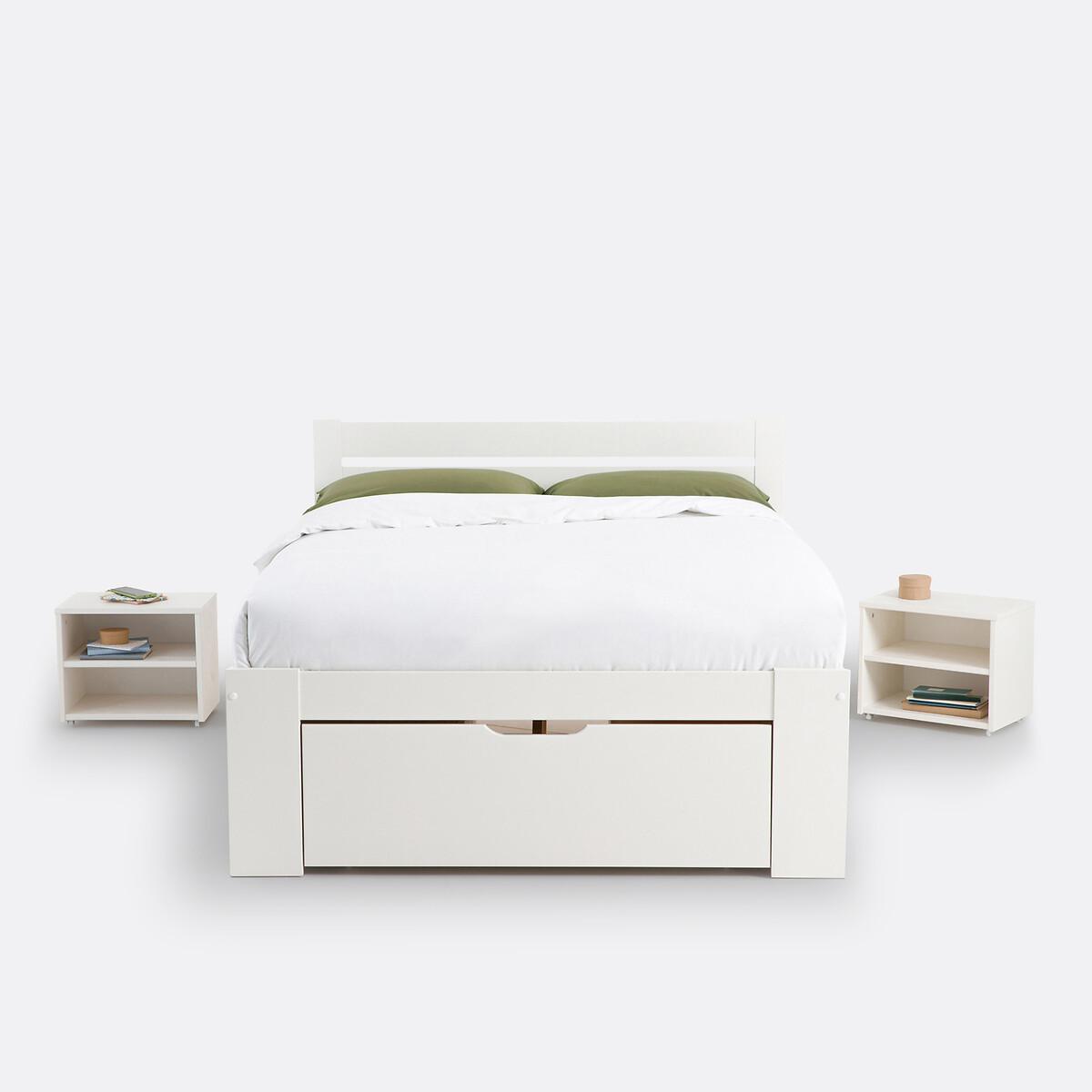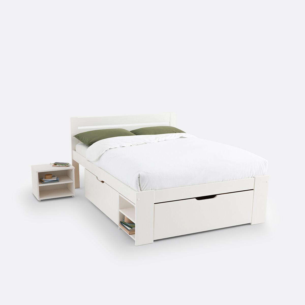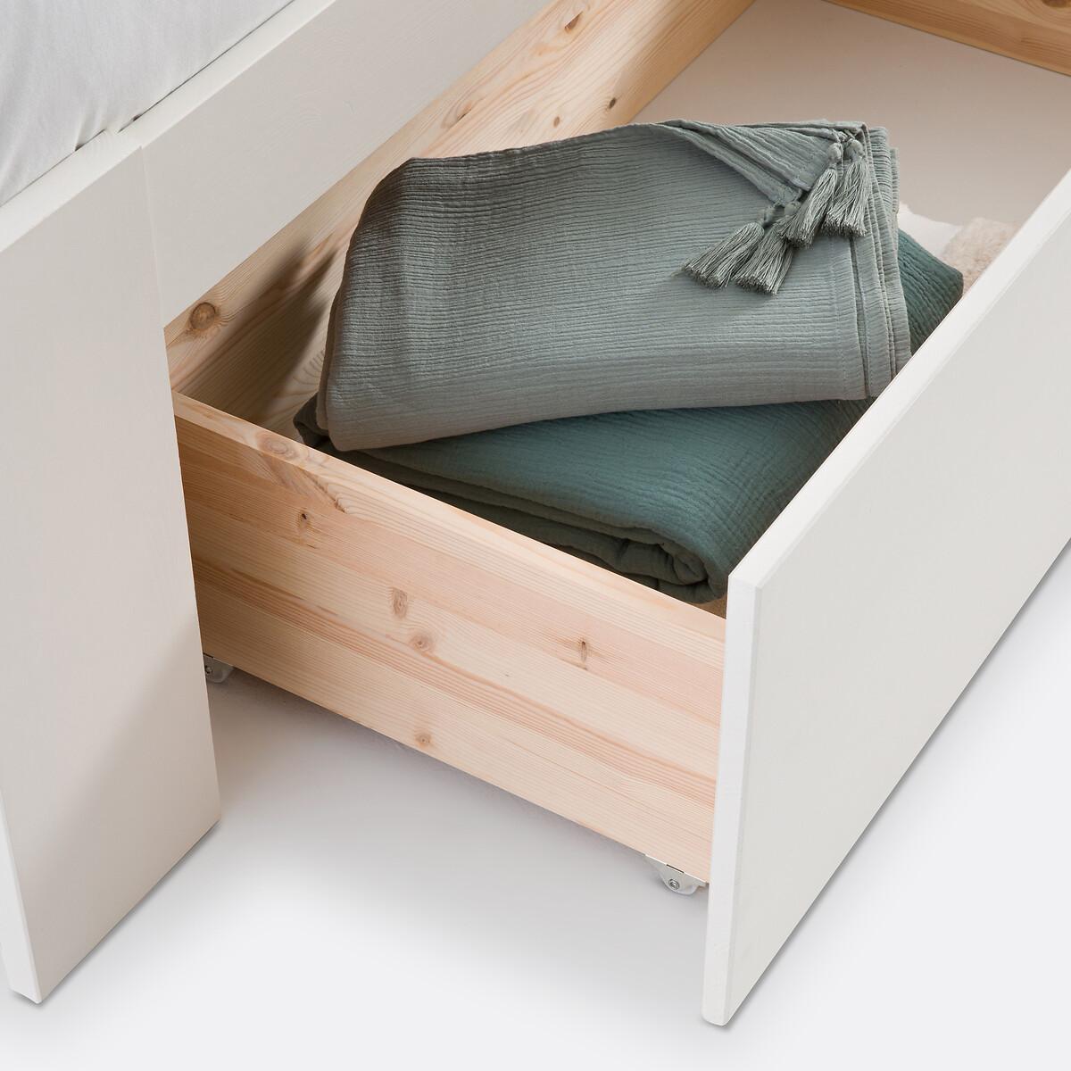 The Konni bed with box spring in FSC® certified solid pine, made in Europe. Clever, compact and contemporary, it offers 2 fixed shelves placed on each side of the bed, 3 storage drawers and 2 bedside tables mounted on easy-to-move casters. Ideal when every square metre counts. Product Details • Structure in solid FSC® pine, acrylic finish • Delivered with raw solid pine slatted base • 2 fixed shelves on each side of the end of the bed in solid FSC® pine lacquered with acrylic finish • 3 drawers mounted on casters in solid FSC® pine, HDF bottoms (1 on each side of the bed + 1 at the end of the bed) • 2 bedside tables with shelf, mounted on casters, in solid FSC® pine lacquered with acrylic finish. To move your bed, we advise you to lift it and not push or pull it. Dimensions Double Size (140 x 190cm)Overall • Width: 146cm • Height: 90cm • Length: 195cm • Height of headboard : 90cm • Height of footboard : 50cm • Weight: 65kg. Usable space • Side drawers: L88.6 x H38 x D48.2cm • Drawer at the end of the bed:L88.6 x H38 x D48.2 cm • 1 shelf compartment: L40 x H14.5 x D15cm • 1 bedside compartment: L40 x H14.5 x D28.6cm. King Size (160 x 200cm)Overall • Width: 166cm • Height: 90cm • Length: 205cm • Height of headboard : 90cm • Height of footboard : 50cm • Weight: 71kg. Usable space • Side drawers: L78.6 x H38 x D48.2cm • Drawer at the end of the bed: L88.6 x H38 x D48.2cm • 1 shelf compartment: L40 x H14.5 x D15cm • 1 bedside compartment: L40 x H14.5 x D28.6cmDelivery:. This product is sold ready to assemble..Note! Please check that all access points are large enough to accommodate your delivery (doors, stairs, lifts). • Made in Europe. • WOOD FROM SUSTAINABLY MANAGED FORESTS. FSC® certified wood comes from forests that are environmentally, socially and economically well managed. Dimensions and weight of parcel4 parcels. Double size • L120 x H14.5 x D36.1cm. 22kg • L204.5 x H9.2 x D25.7cm. 15kg • L149.5 x H13.5 x D25.7cm. 17kg • L104.5 x H5.7 x D61.7cm. 15kg. King size • L140 x H14,5 x P36,1 cm. 24kg • L210 x H9,2 x P25,7 cm. 17kg • L169,5 x H13,5 x P25,7 cm. 20kg • L104,5 x H5,7 x P61,7 cm. 15kg