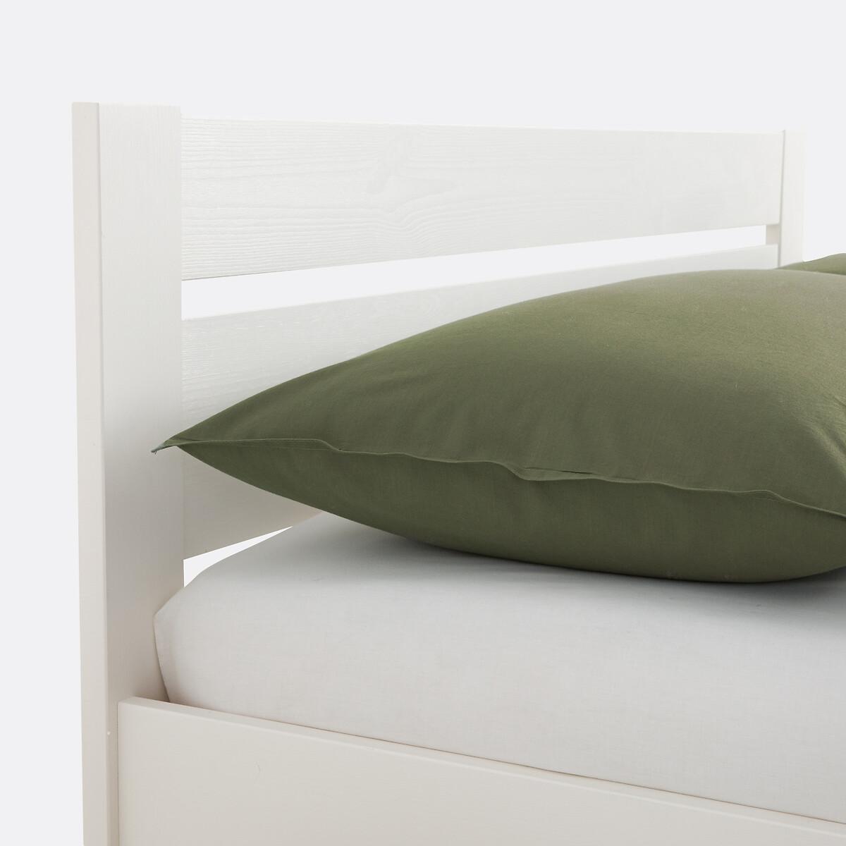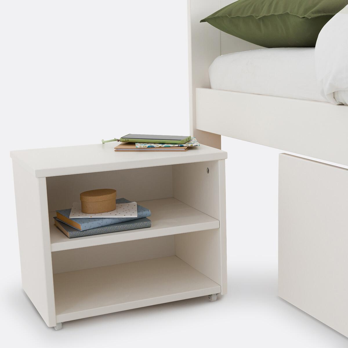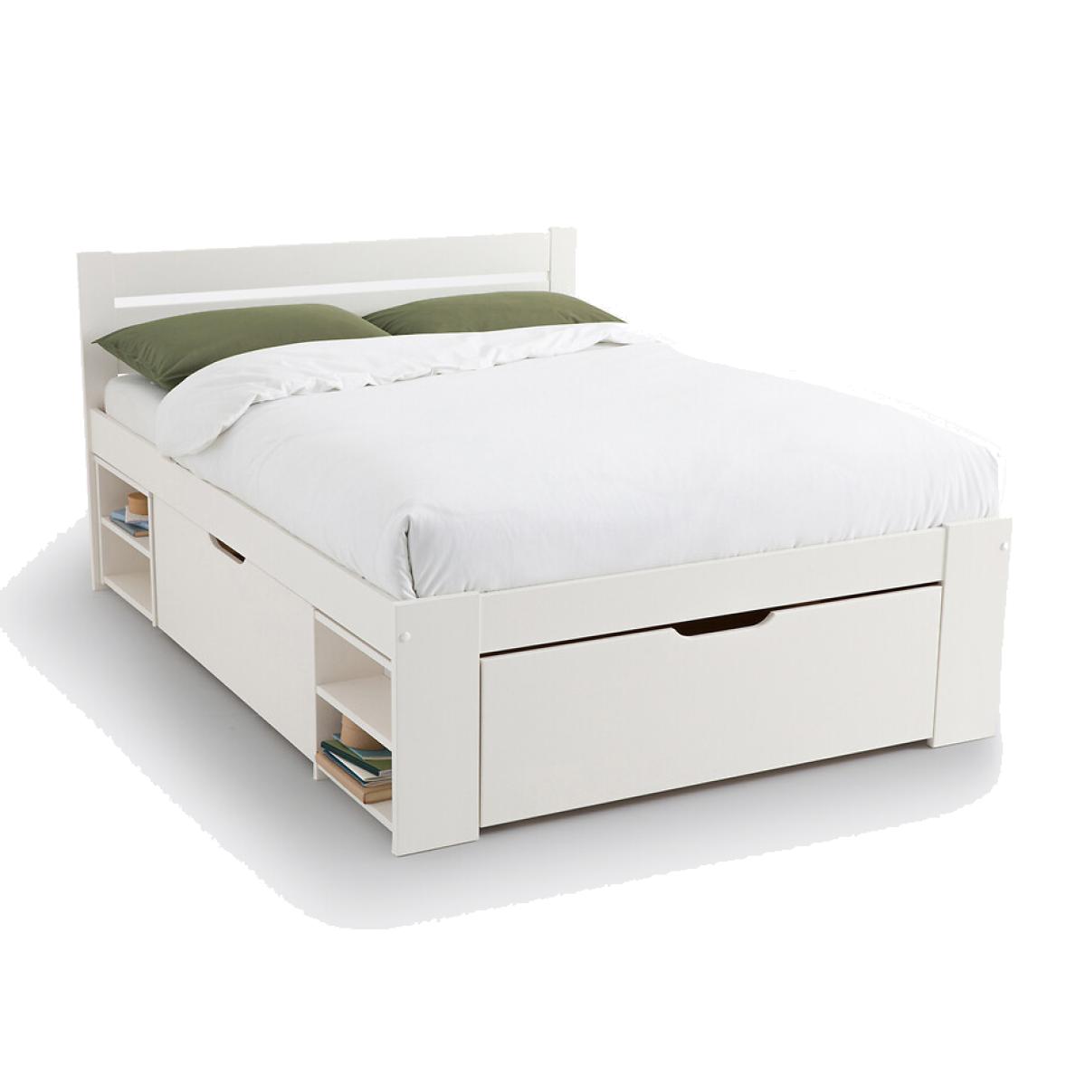 The Konni bed with box spring in FSC® certified solid pine, made in Europe. Clever, compact and contemporary, it offers 2 fixed shelves placed on each side of the bed, 3 storage drawers and 2 bedside tables mounted on easy-to-move casters. Ideal when every square metre counts. Product Details • Structure in solid FSC® pine, acrylic finish • Delivered with raw solid pine slatted base • 2 fixed shelves on each side of the end of the bed in solid FSC® pine lacquered with acrylic finish • 3 drawers mounted on casters in solid FSC® pine, HDF bottoms (1 on each side of the bed + 1 at the end of the bed) • 2 bedside tables with shelf, mounted on casters, in solid FSC® pine lacquered with acrylic finish. To move your bed, we advise you to lift it and not push or pull it. Dimensions Double Size (140 x 190cm)Overall • Width: 146cm • Height: 90cm • Length: 195cm • Height of headboard : 90cm • Height of footboard : 50cm • Weight: 65kg. Usable space • Side drawers: L88.6 x H38 x D48.2cm • Drawer at the end of the bed:L88.6 x H38 x D48.2 cm • 1 shelf compartment: L40 x H14.5 x D15cm • 1 bedside compartment: L40 x H14.5 x D28.6cm. King Size (160 x 200cm)Overall • Width: 166cm • Height: 90cm • Length: 205cm • Height of headboard : 90cm • Height of footboard : 50cm • Weight: 71kg. Usable space • Side drawers: L78.6 x H38 x D48.2cm • Drawer at the end of the bed: L88.6 x H38 x D48.2cm • 1 shelf compartment: L40 x H14.5 x D15cm • 1 bedside compartment: L40 x H14.5 x D28.6cmDelivery:. This product is sold ready to assemble..Note! Please check that all access points are large enough to accommodate your delivery (doors, stairs, lifts). • Made in Europe. • WOOD FROM SUSTAINABLY MANAGED FORESTS. FSC® certified wood comes from forests that are environmentally, socially and economically well managed. Dimensions and weight of parcel4 parcels. Double size • L120 x H14.5 x D36.1cm. 22kg • L204.5 x H9.2 x D25.7cm. 15kg • L149.5 x H13.5 x D25.7cm. 17kg • L104.5 x H5.7 x D61.7cm. 15kg. King size • L140 x H14,5 x P36,1 cm. 24kg • L210 x H9,2 x P25,7 cm. 17kg • L169,5 x H13,5 x P25,7 cm. 20kg • L104,5 x H5,7 x P61,7 cm. 15kg