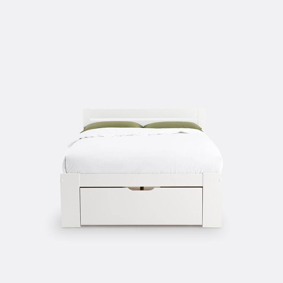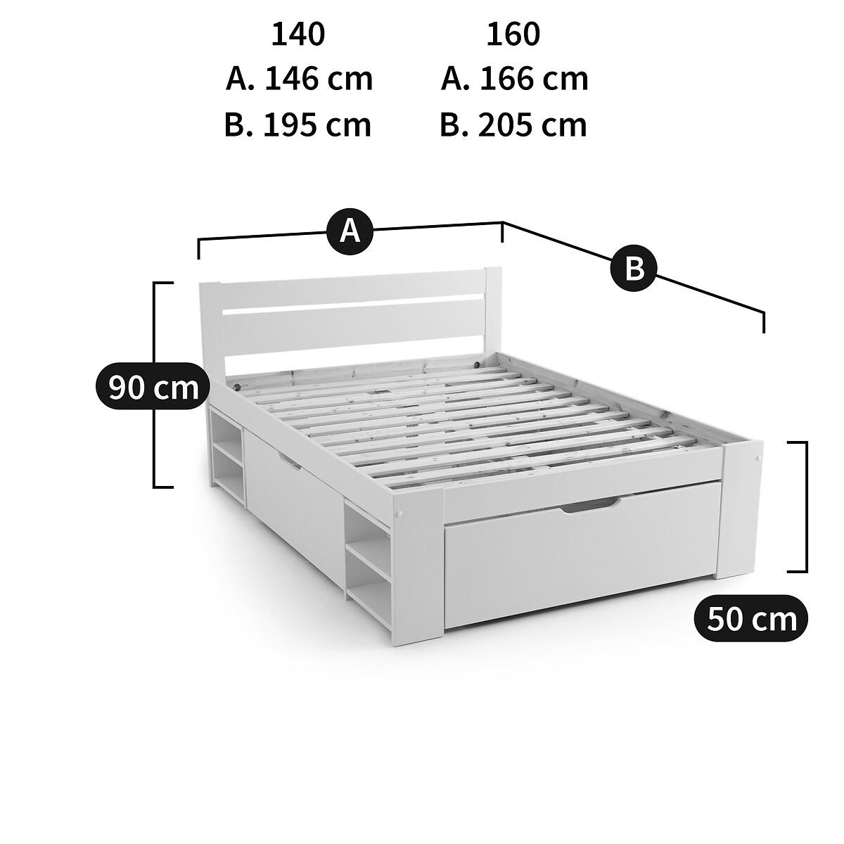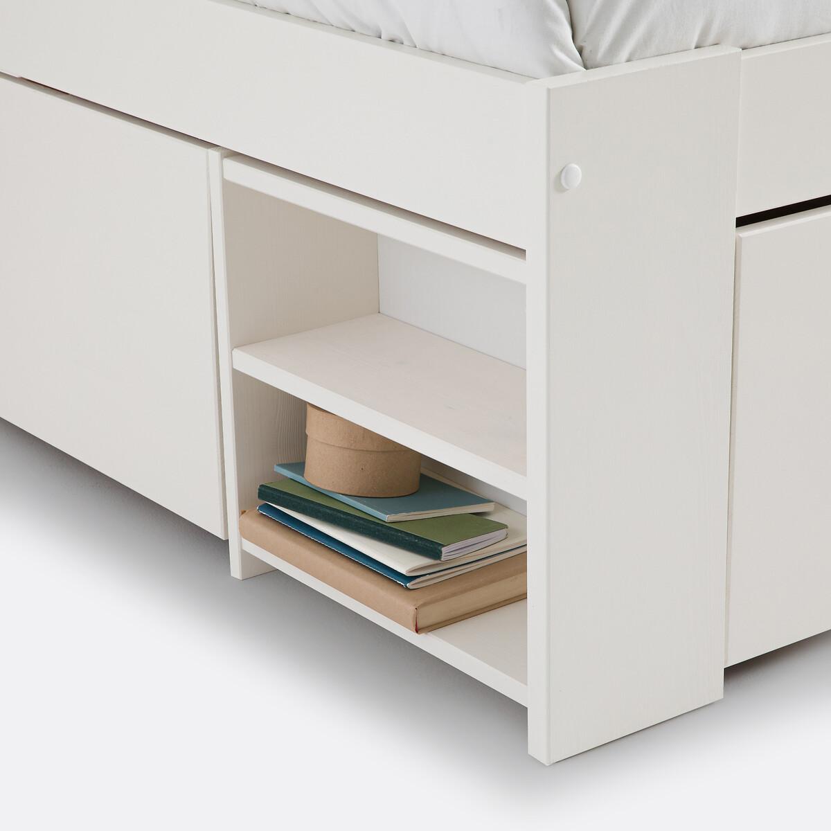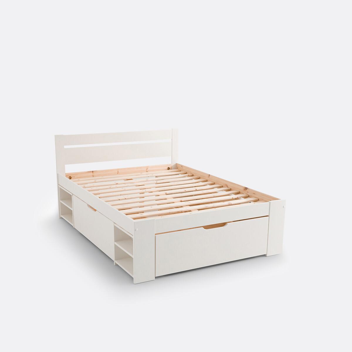 The Konni bed with box spring in FSC® certified solid pine, made in Europe. Clever, compact and contemporary, it offers 2 fixed shelves placed on each side of the bed, 3 storage drawers and 2 bedside tables mounted on easy-to-move casters. Ideal when every square metre counts. Product Details • Structure in solid FSC® pine, acrylic finish • Delivered with raw solid pine slatted base • 2 fixed shelves on each side of the end of the bed in solid FSC® pine lacquered with acrylic finish • 3 drawers mounted on casters in solid FSC® pine, HDF bottoms (1 on each side of the bed + 1 at the end of the bed) • 2 bedside tables with shelf, mounted on casters, in solid FSC® pine lacquered with acrylic finish. To move your bed, we advise you to lift it and not push or pull it. Dimensions Double Size (140 x 190cm)Overall • Width: 146cm • Height: 90cm • Length: 195cm • Height of headboard : 90cm • Height of footboard : 50cm • Weight: 65kg. Usable space • Side drawers: L88.6 x H38 x D48.2cm • Drawer at the end of the bed:L88.6 x H38 x D48.2 cm • 1 shelf compartment: L40 x H14.5 x D15cm • 1 bedside compartment: L40 x H14.5 x D28.6cm. King Size (160 x 200cm)Overall • Width: 166cm • Height: 90cm • Length: 205cm • Height of headboard : 90cm • Height of footboard : 50cm • Weight: 71kg. Usable space • Side drawers: L78.6 x H38 x D48.2cm • Drawer at the end of the bed: L88.6 x H38 x D48.2cm • 1 shelf compartment: L40 x H14.5 x D15cm • 1 bedside compartment: L40 x H14.5 x D28.6cmDelivery:. This product is sold ready to assemble..Note! Please check that all access points are large enough to accommodate your delivery (doors, stairs, lifts). • Made in Europe. • WOOD FROM SUSTAINABLY MANAGED FORESTS. FSC® certified wood comes from forests that are environmentally, socially and economically well managed. Dimensions and weight of parcel4 parcels. Double size • L120 x H14.5 x D36.1cm. 22kg • L204.5 x H9.2 x D25.7cm. 15kg • L149.5 x H13.5 x D25.7cm. 17kg • L104.5 x H5.7 x D61.7cm. 15kg. King size • L140 x H14,5 x P36,1 cm. 24kg • L210 x H9,2 x P25,7 cm. 17kg • L169,5 x H13,5 x P25,7 cm. 20kg • L104,5 x H5,7 x P61,7 cm. 15kg