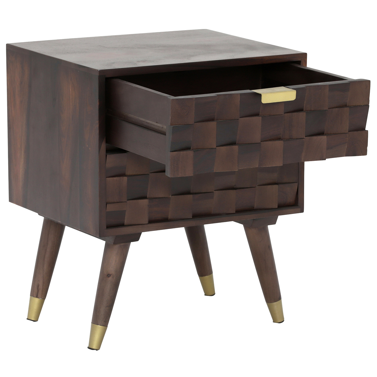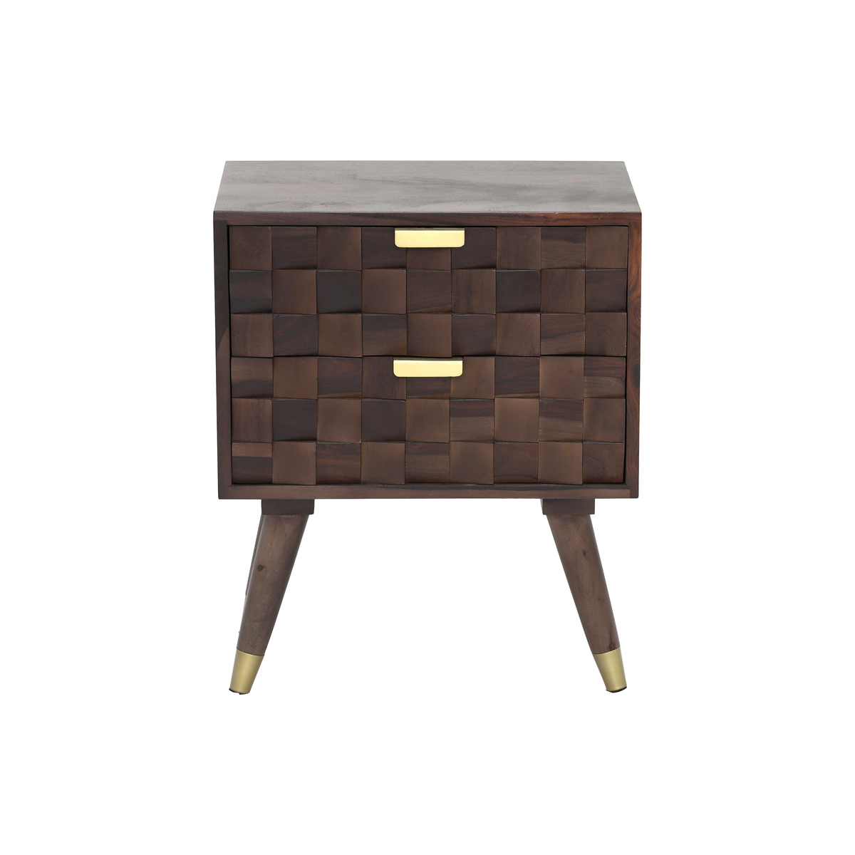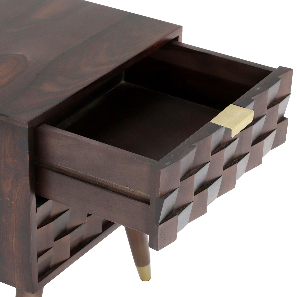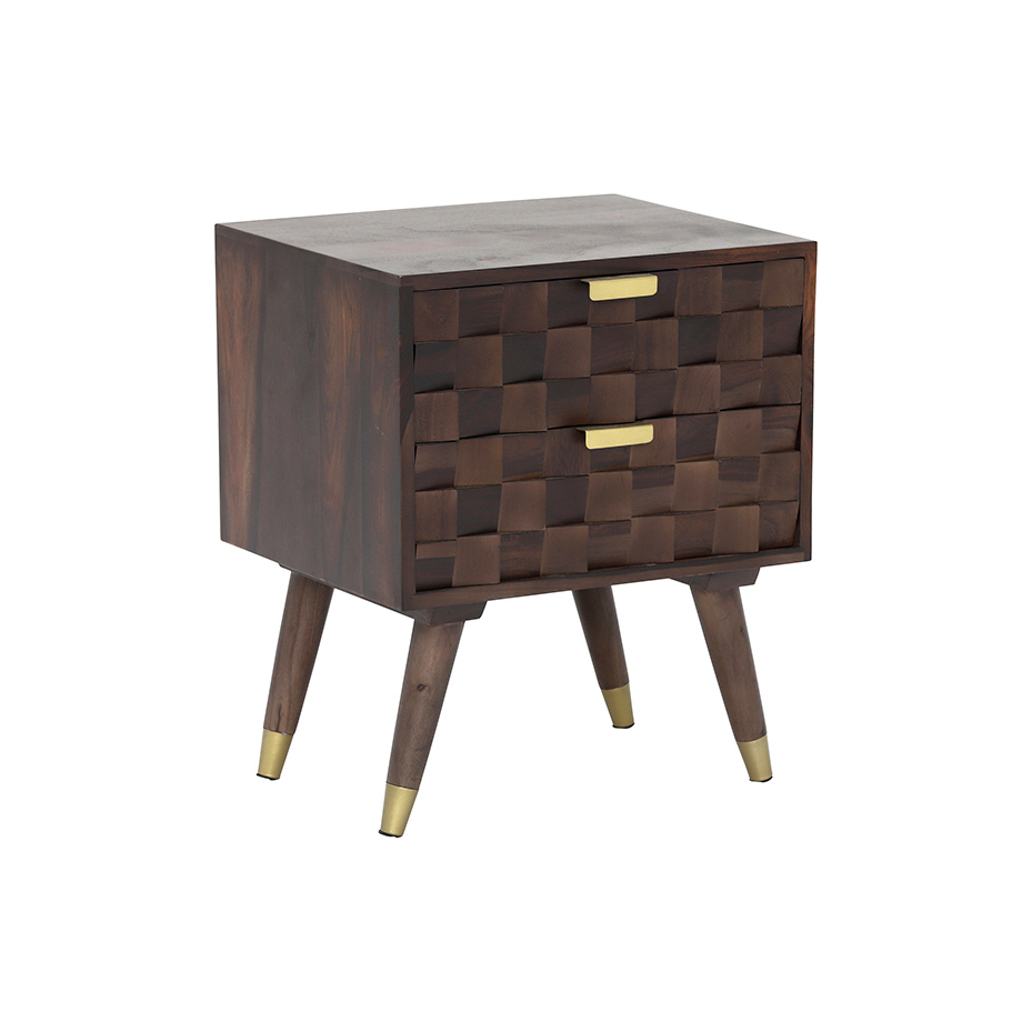 Textured, geometric design and gorgeous natural wood features give the Kora 2 Drawer Bedside its signature statement look, combining 100% solid indian rosewood with stylish brass detailing for a mid-century-modern finish. A practical bedside, but fit for use in living areas and hallways for displaying accessories and decorative lighting, this stunning piece is sure to catch the eye – and including 2 sliding drawers, offers handy storage space too!