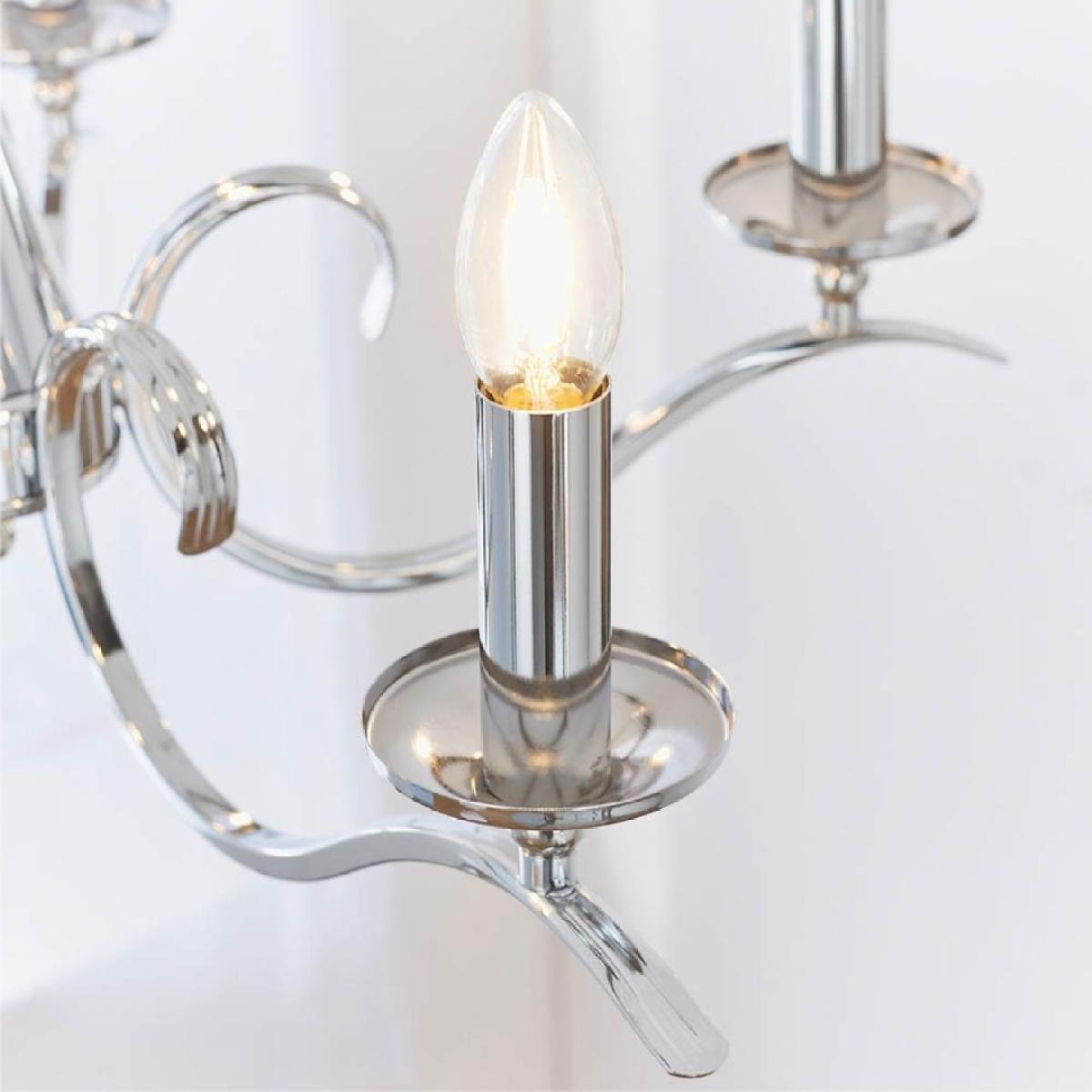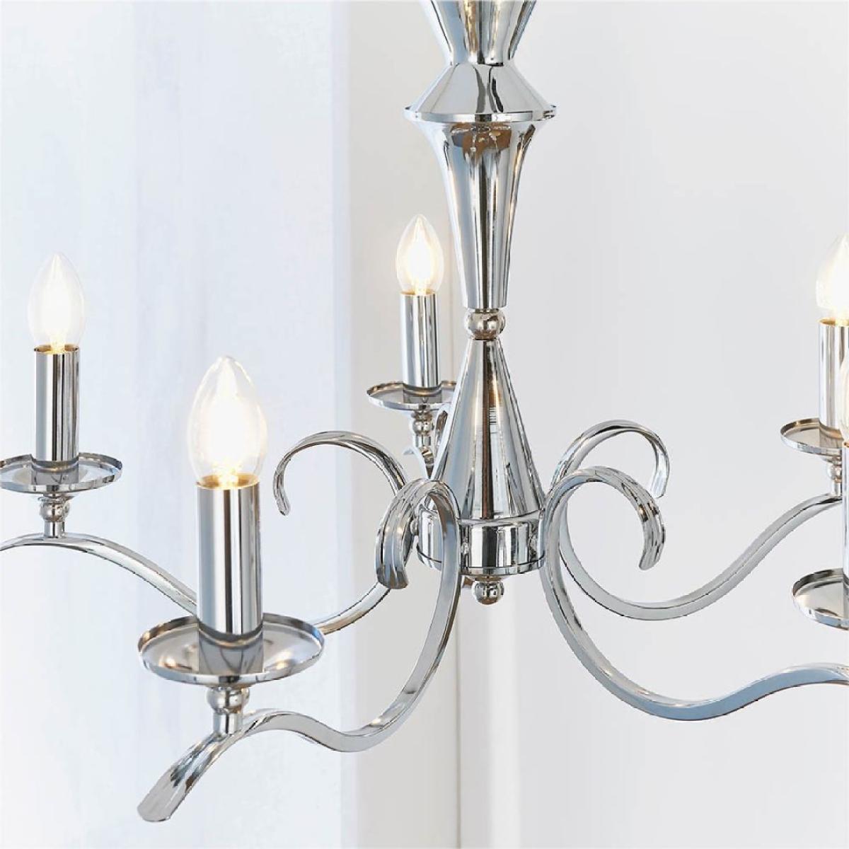 Traditional chandelier boasting a polished chrome finish. An elegant addition to your home, this chandelier is part of the Kora range from Endon. Finished in polished chrome throughout, this height adjustable fitting boasts beautiful curved arms and a metal chain. Each light bulb is supported by a sconce which is positioned at the end of each arm. Best suited to homes boasting traditional home decor, it is perfect for use in hallways, dining rooms, living rooms and bedrooms. Pagazzi recommends using our E14 4w LED Clear Candle bulbs for a crisp, clean light. Traditional chandelier boasting a polished chrome finish. An elegant addition to your home, this chandelier is part of the Kora range from Endon. Finished in polished chrome throughout, this height adjustable fitting boasts beautiful curved arms and a metal chain. Each light bulb is supported by a sconce which is positioned at the end of each arm. Best suited to homes boasting traditional home decor, it is perfect for use in hallways, dining rooms, living rooms and bedrooms. Pagazzi recommends using our E14 4w LED Clear Candle bulbs for a crisp, clean light.