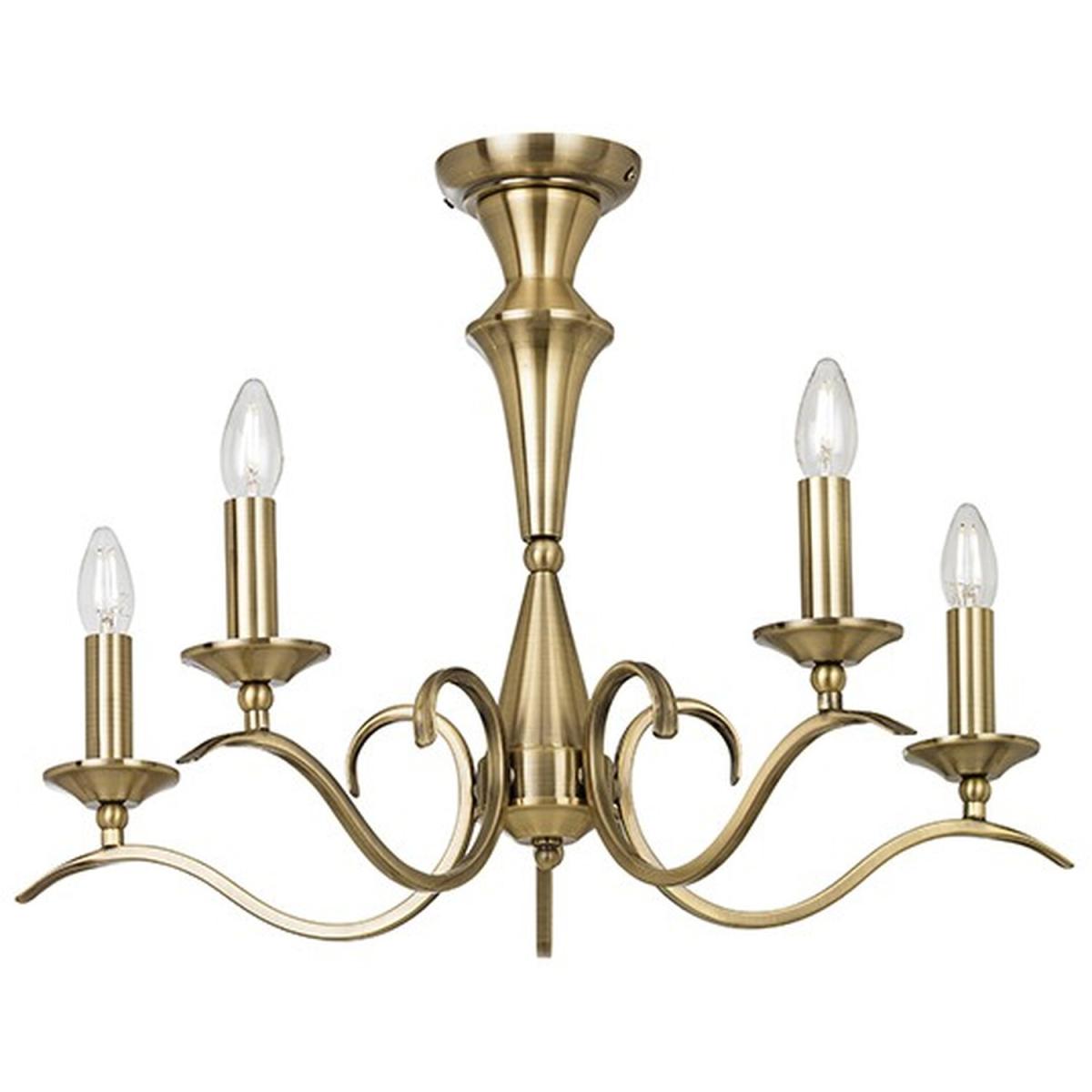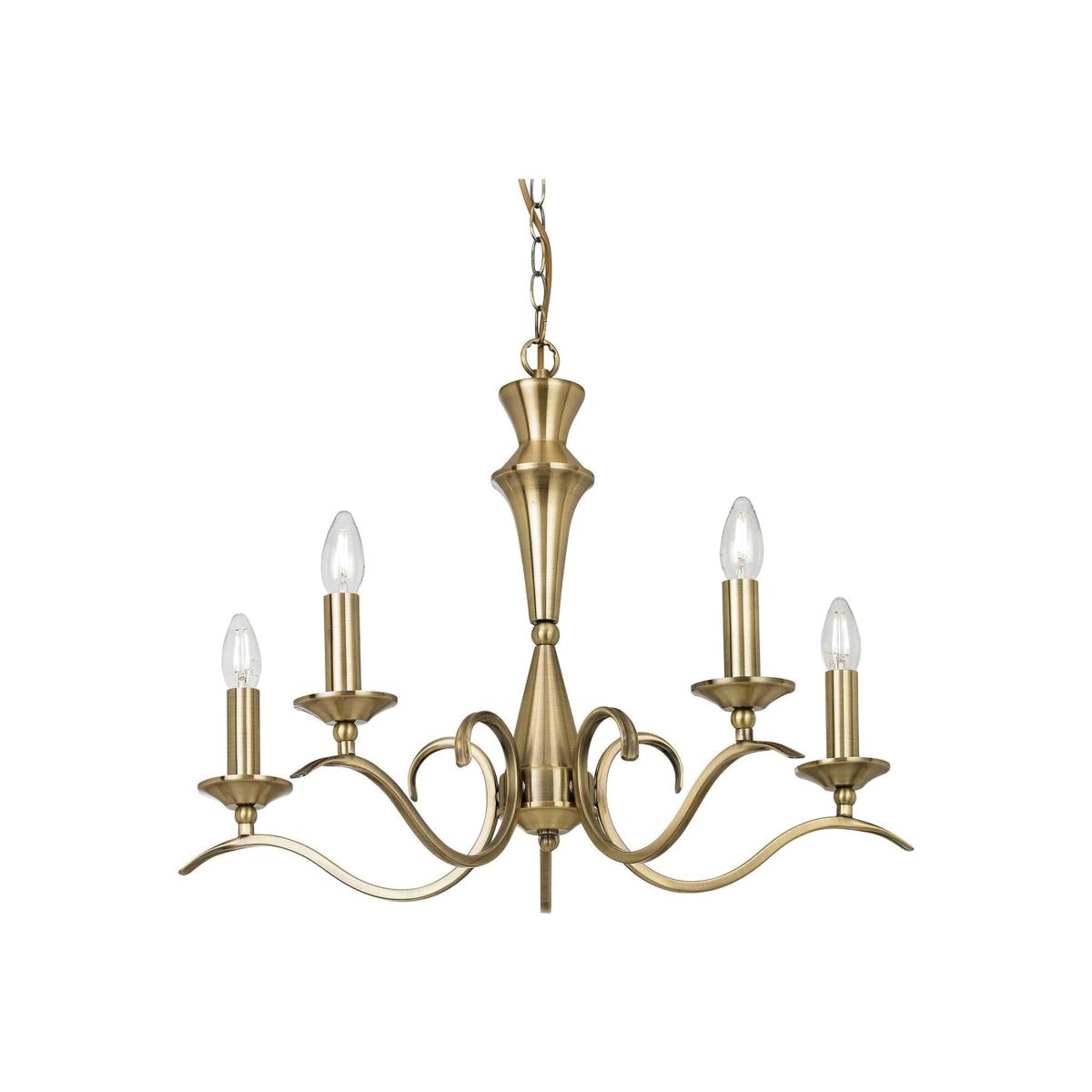 The 5 light chandelier is finished in antique brass effect, this fitting has an adjustable drop and can also convert to a flush fitting, is suitable for use with LED lamps and is dimmable. Also available in alternative finish and 8 light version