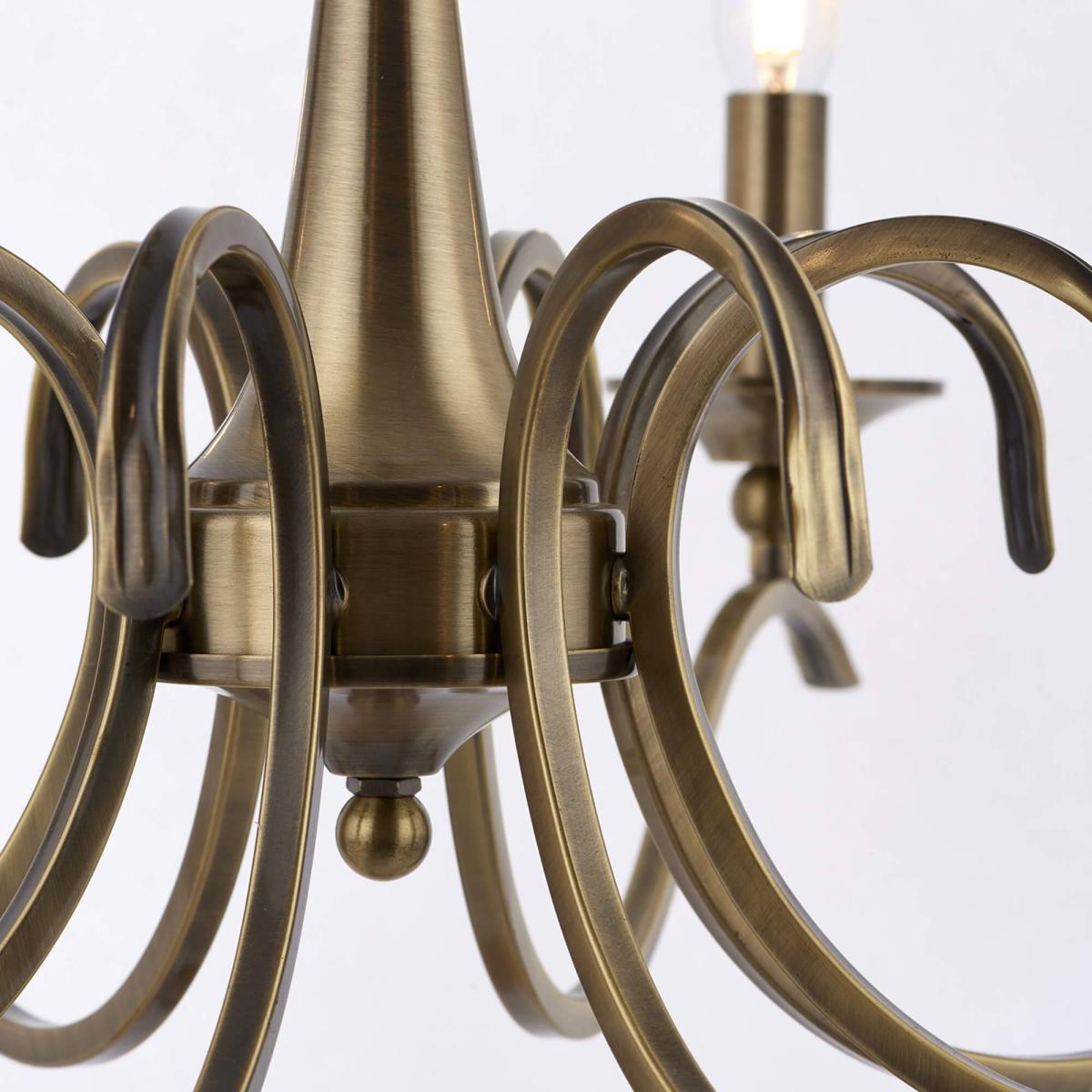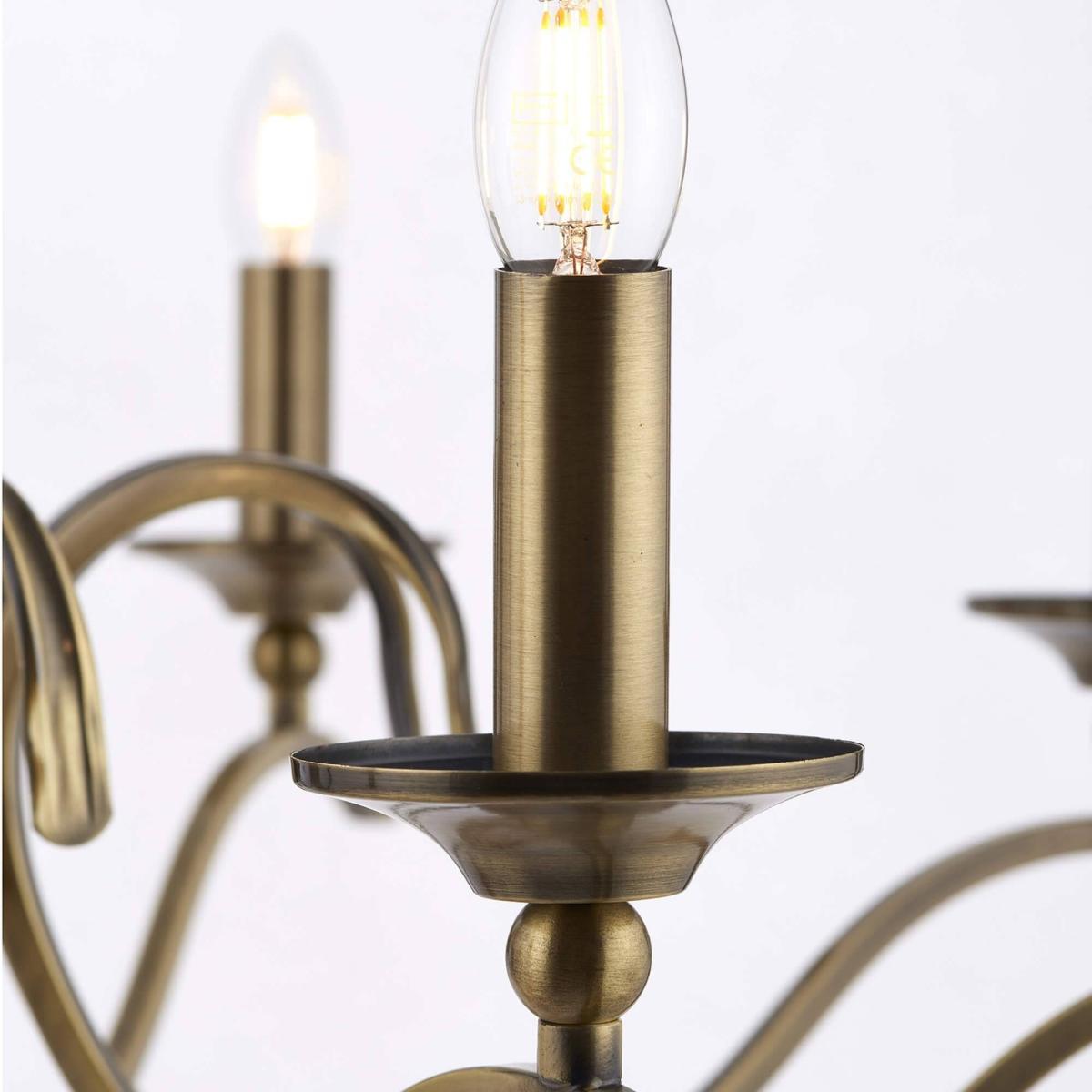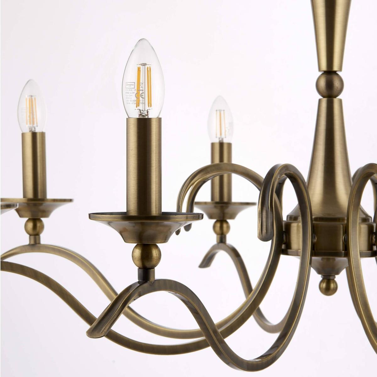 Traditional chandelier boasting an antique brass finish. An elegant addition to your home, this chandelier is part of the Kora range from Endon. Finished in antique brass throughout, this height adjustable fitting boasts beautiful curved arms and a metal chain. Each light bulb is supported by a sconce which is positioned at the end of each arm. Best suited to homes boasting traditional home decor, it is perfect for use in hallways, dining rooms, living rooms and bedrooms. Pagazzi recommends using our E14 4w LED Clear Candle bulbs for a crisp, clean light.