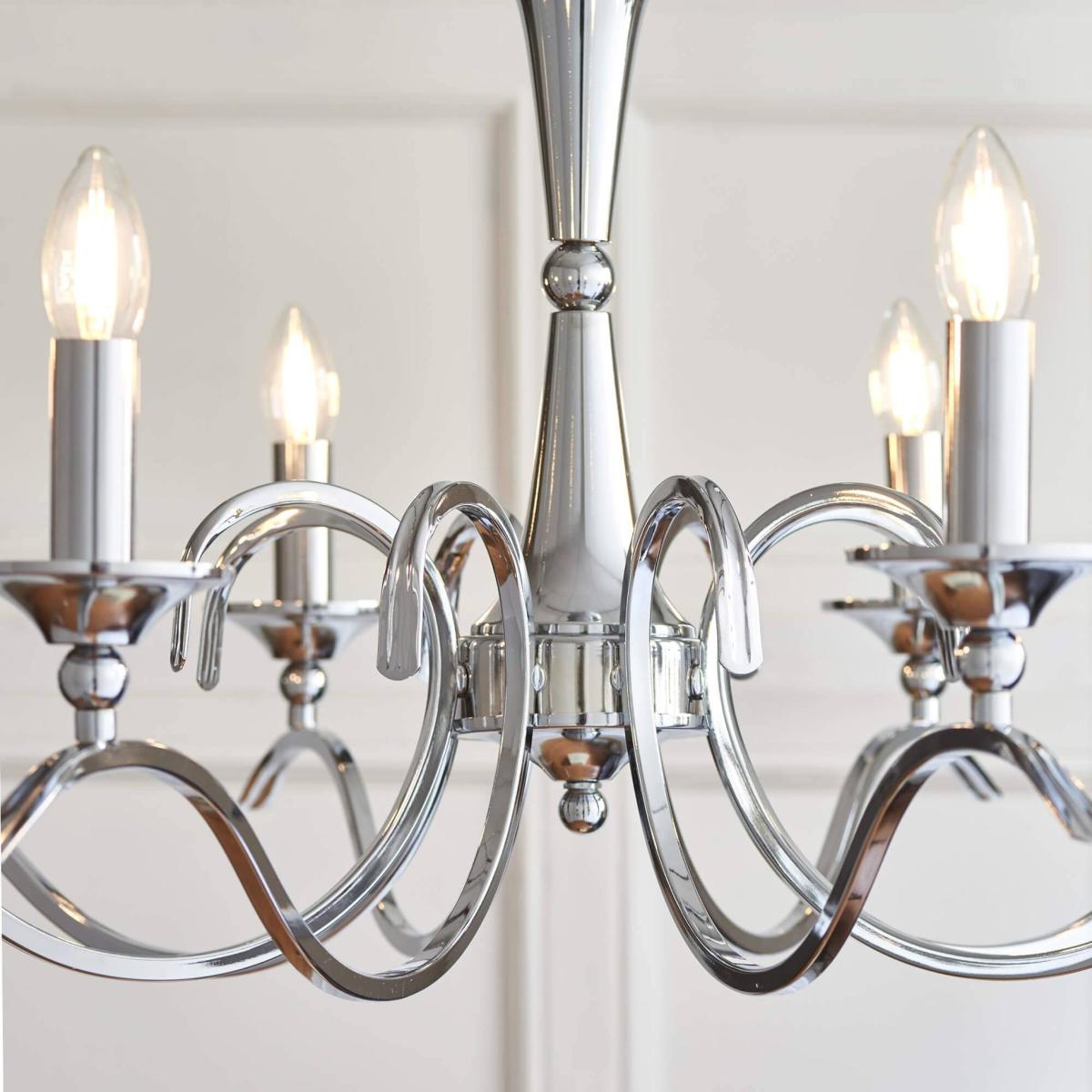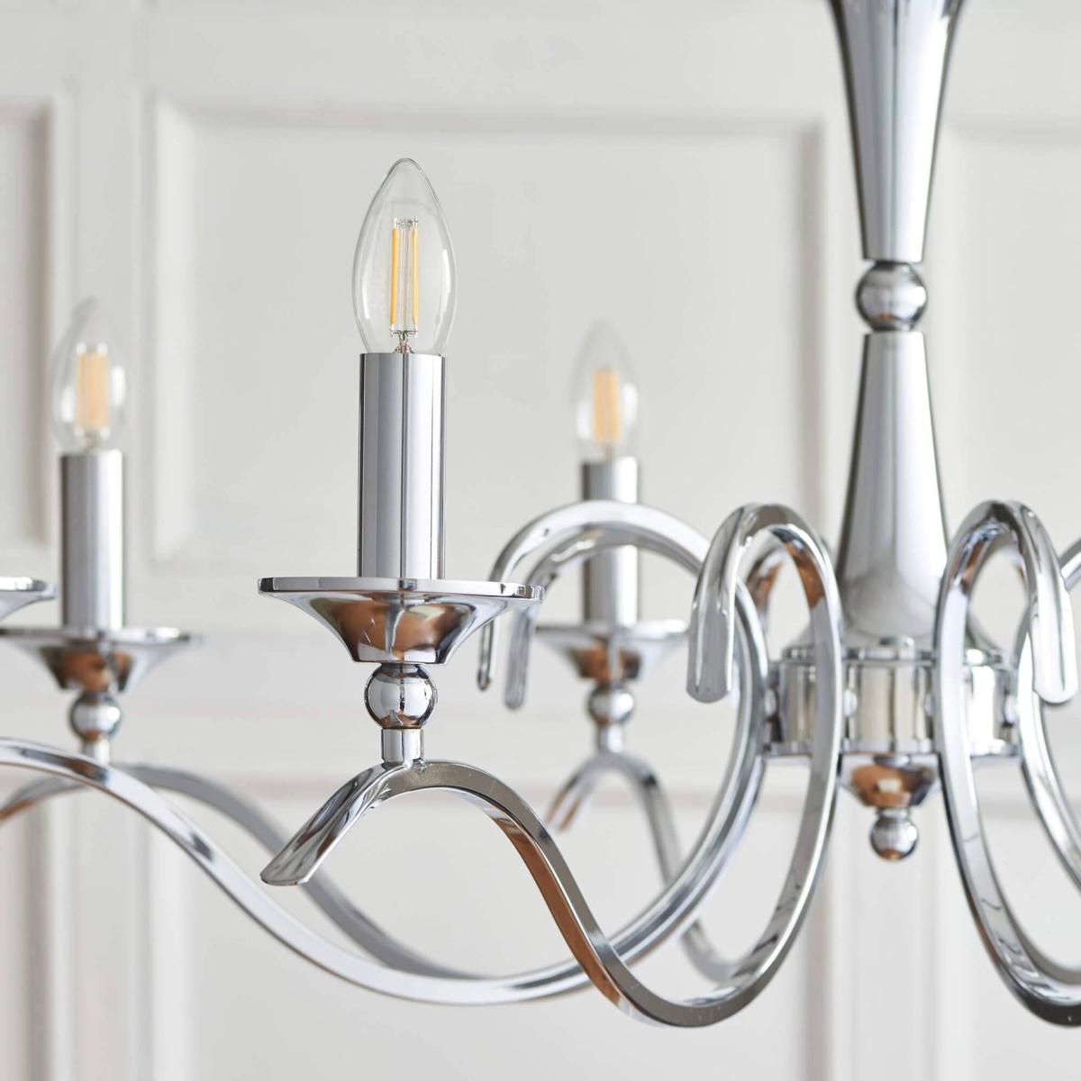 Traditional chandelier boasting a polished chrome finish. An elegant addition to your home, this chandelier is part of the Kora range from Endon. Finished in polished chrome throughout, this height adjustable fitting boasts beautiful curved arms and a metal chain. Each light bulb is supported by a sconce which is porsitioned at the end of each arm. Best suited to homes boasting traditional home decor, it is perfect for use in hallways, dining rooms, living rooms and bedrooms. Pagazzi recommends using our E14 4w LED Clear Candle bulbs for a crisp, clean light. Traditional chandelier boasting a polished chrome finish. An elegant addition to your home, this chandelier is part of the Kora range from Endon. Finished in polished chrome throughout, this height adjustable fitting boasts beautiful curved arms and a metal chain. Each light bulb is supported by a sconce which is porsitioned at the end of each arm. Best suited to homes boasting traditional home decor, it is perfect for use in hallways, dining rooms, living rooms and bedrooms. Pagazzi recommends using our E14 4w LED Clear Candle bulbs for a crisp, clean light.
