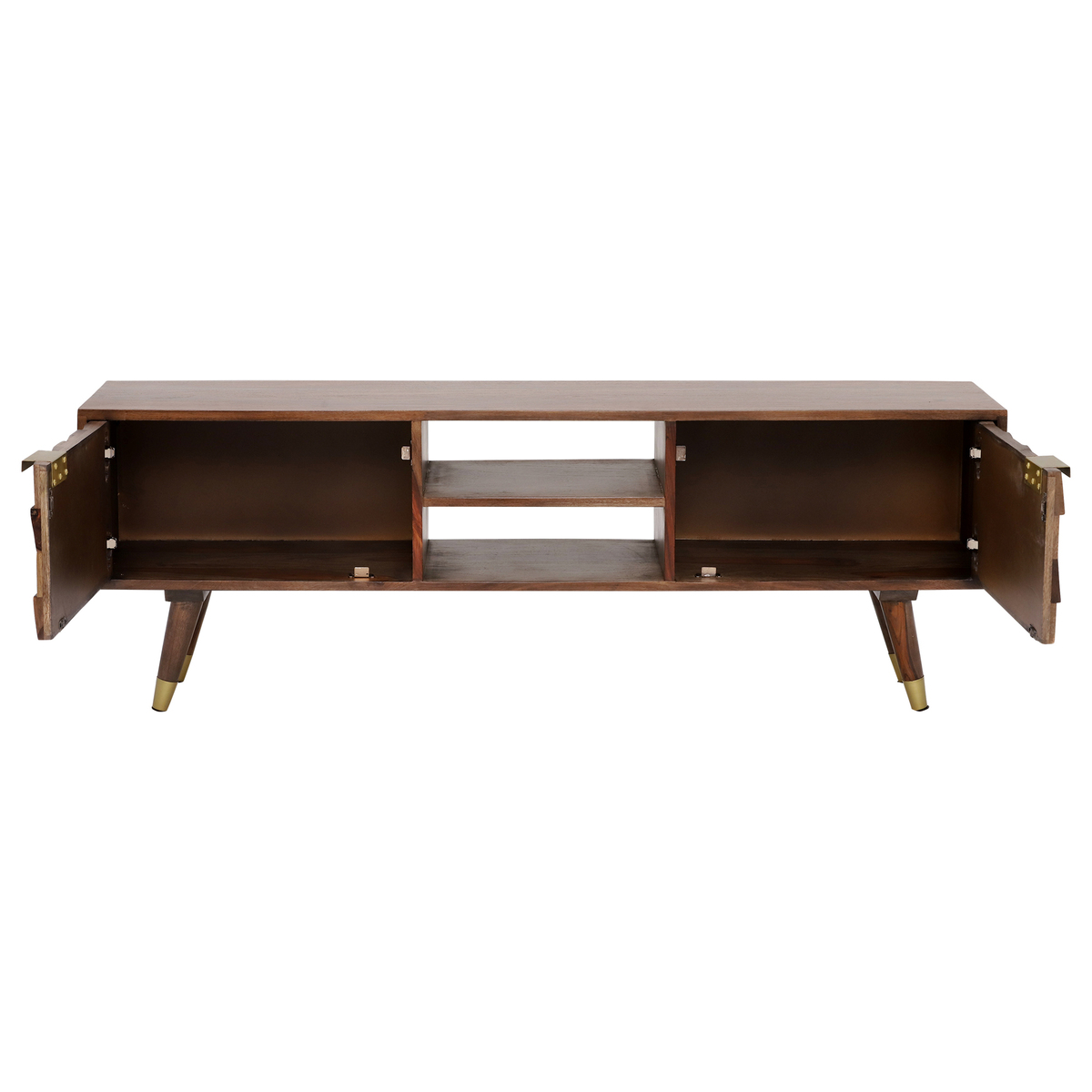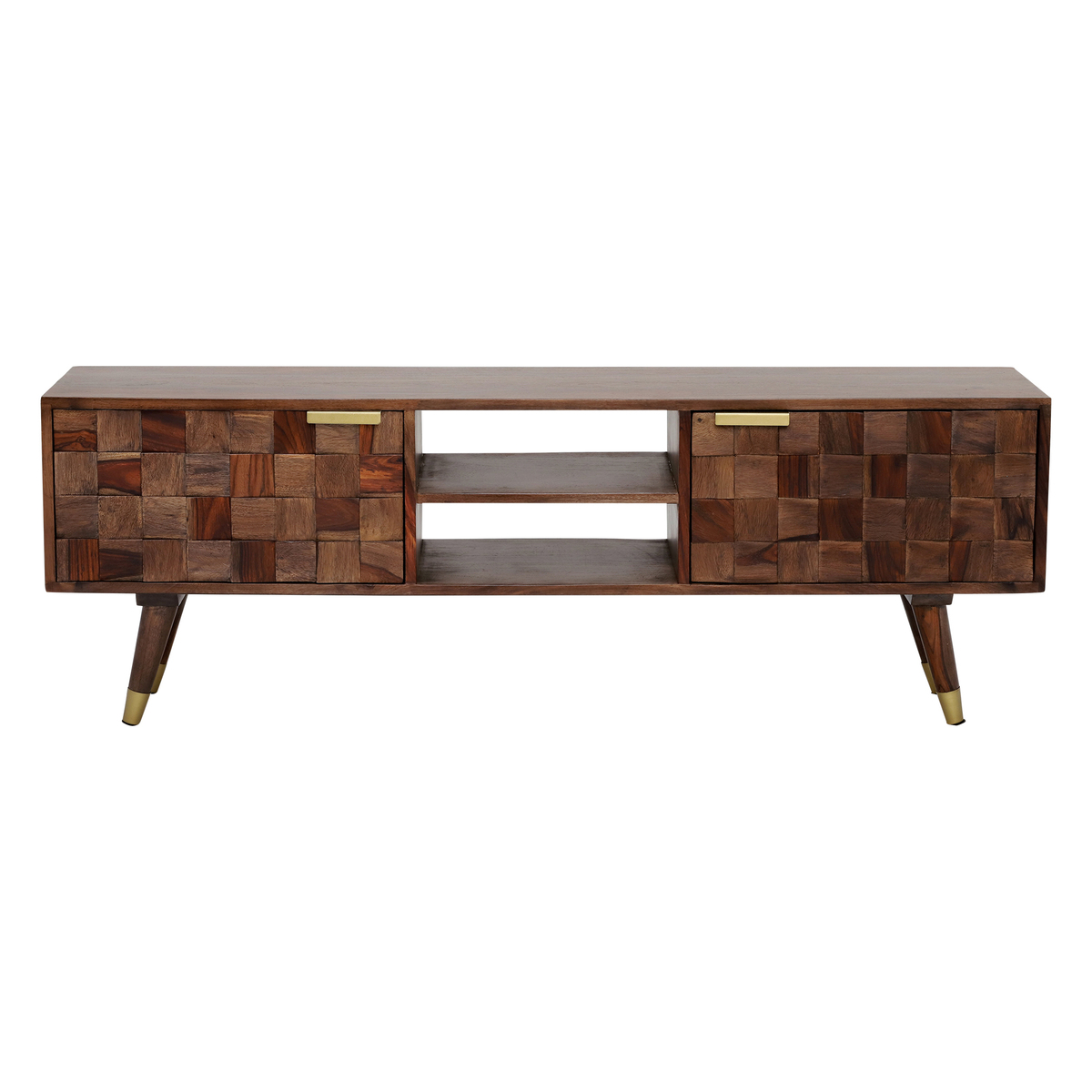 Combining a mid-century silhouette with contemporary detailing, the Kora TV unit oozes vintage glamour with a twist. Stealing the spotlight, its two cupboard doors feature a modern 3D block design, providing unexpected texture, dimension and a unique point of focus. Brass handles and leg tips introduce warmth and elegance, beautifully complementing the rich tones of the solid Sheesham wood.;As functional as it is fabulous, the TV stand contains enough space for media equipment and accessories, with two open shelves in the centre allowing remote access to digital boxes and machines. A grand addition to any living room, it can be combined with the Kora side table and coffee table for a cohesive look.