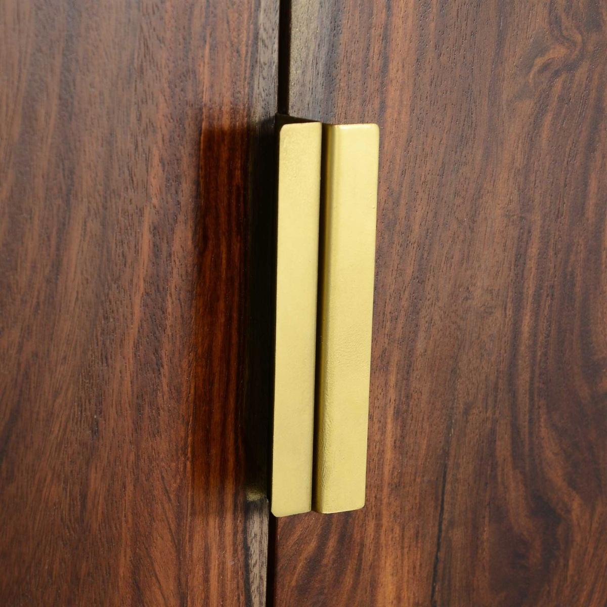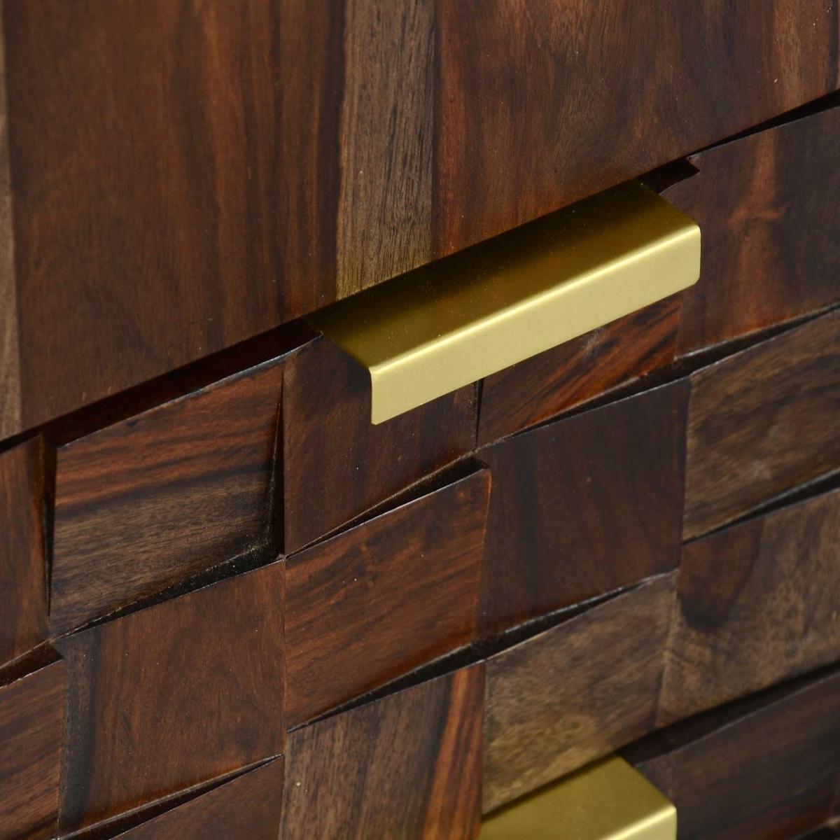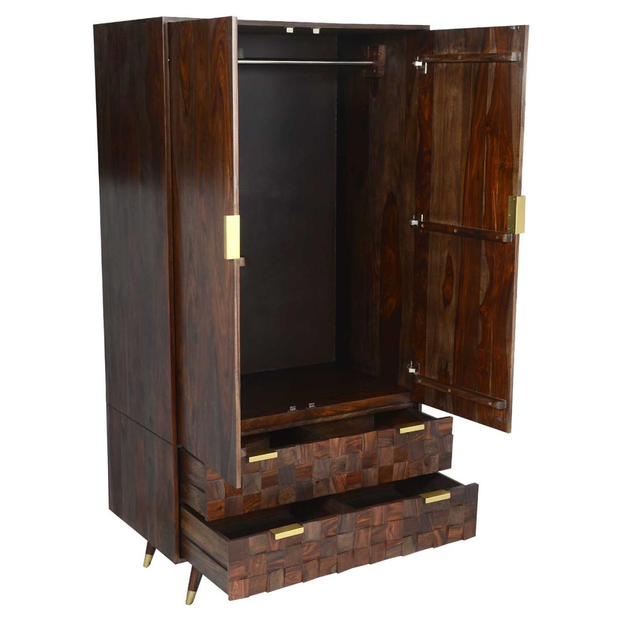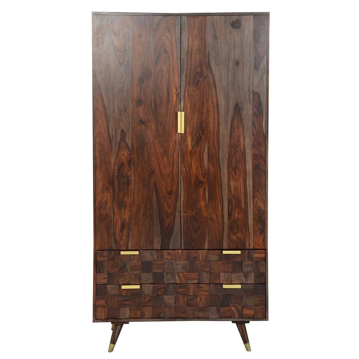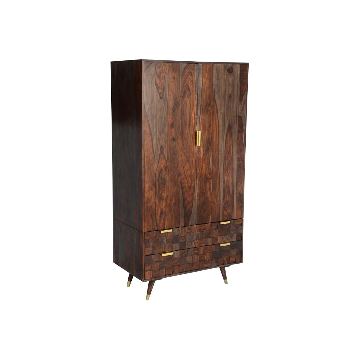 Design. Solid and spacious, the Kora wardrobe will give a sense of fine quality to your bedroom. Richly coloured and complete with beautiful natural markings, the sheesham wood makes a grand statement in style, while brass detailing and blockwork drawer fronts lend a luxurious finishing touch. Partner this stunning dark wood wardrobe with matching pieces from the Kora range for effortless cohesion.