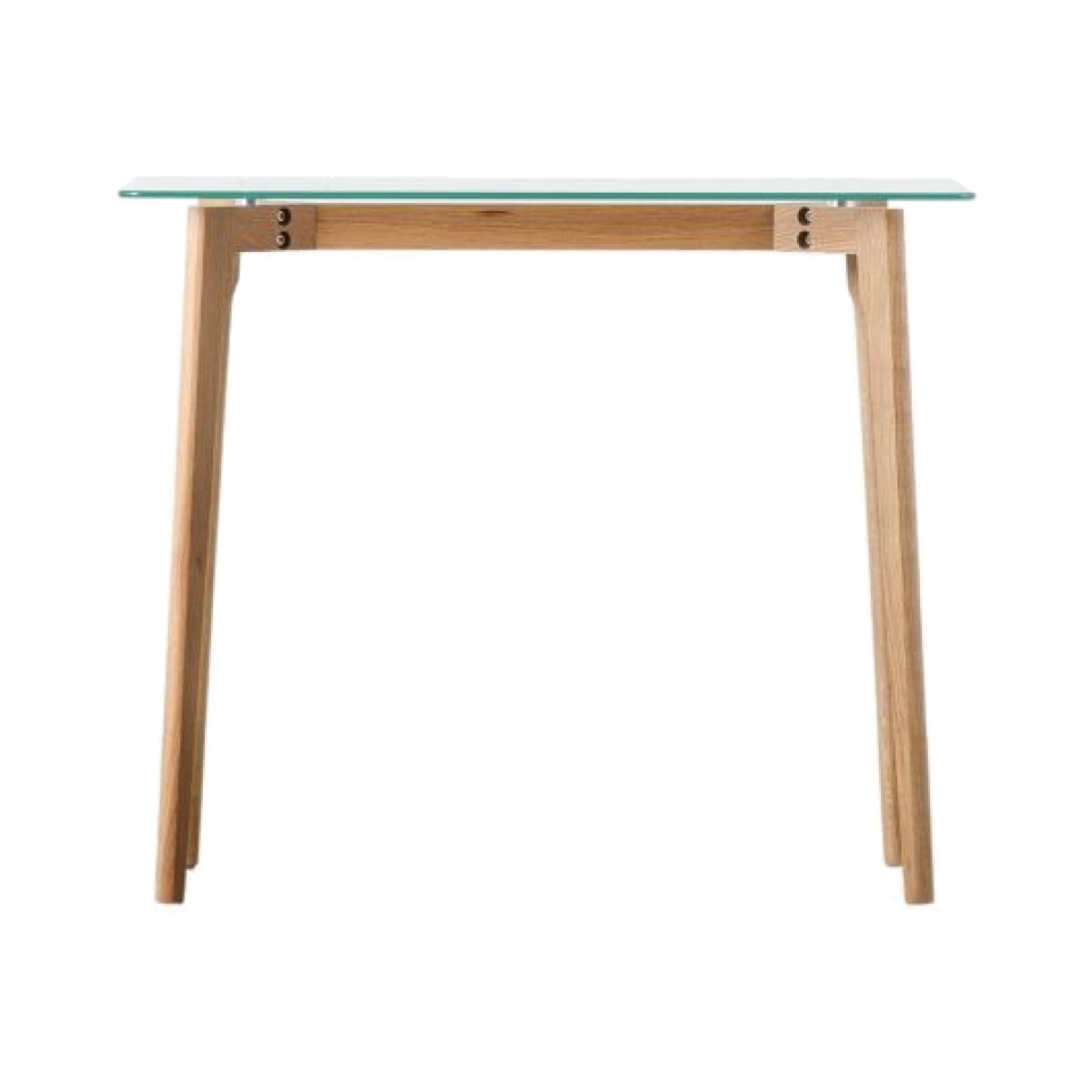 This lovely console table features a beautifully designed solid natural oak base combined with a clear tempered glass top to give a stunning contemporary look. It is part of a collection offering a range of tables, in the natural oak bases paired with clear glass and also with black oak and smoked glass. The tables are part of our Packed-Flat Design Project, offering easy delivery to any room in any property, whilst reducing the packaging needed. Assembly is required, but all the tools needed are supplied. Material: Tempered Glass. Colour/Finish: Natural. Table Shape: Rectangle.