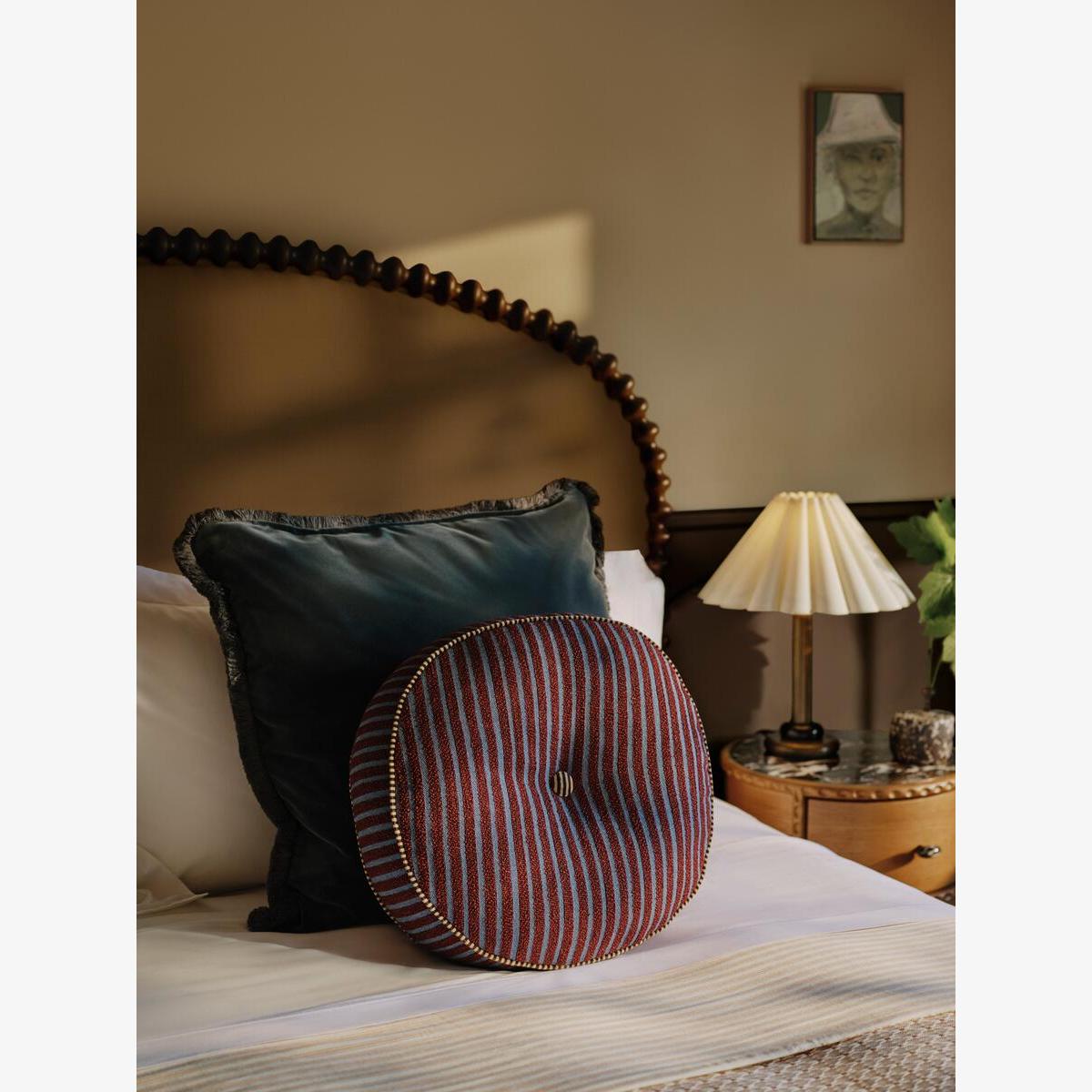 I love this round cushion for its versatile style and understated elegance. Its simple shape and subtle stripe pattern make it suitable for a variety of interiors, from cosy traditional bedrooms to more modern, pared-back spaces. It works particularly well as an accent on a bed or a sofa, adding a pop of colour and texture without overwhelming the overall look. Practical styling tips include pairing it with neutral tones for a layered, inviting feel, or using it as a statement piece with contrasting textiles. Its round shape also softens sharp lines and adds visual interest, making it a handy all-rounder for bringing a touch of sophistication to any scheme.