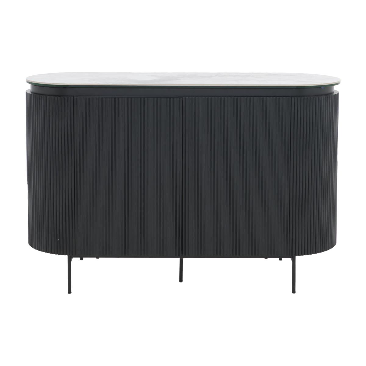 Kos offers cool modern style that's just the right size for smaller dining rooms and living spaces. This statement range features dining tables and occasional tables with gorgeous high-gloss ceramic tops and showstopping metal bases, beautifully upholstered dining chairs that juxtapose curved lines with bold geometric stitching and effortlessly stylish rounded-end sideboards with hidden storage. The dining table is also available as an extendable table with an extra leaf that smoothly slides into place so you can make room for a couple more diners in double quick time. Sleek by design and easy to bring home, the Kos range just fits so well – and in more ways than one. Compact dining room? Make every square inch count with this fabulous storage piece, part of our Kos range. With its curved shape, high-gloss ceramic top and grooved finish it's so very stylish. Why you'll love it Super-stylish ceramic-topped 2-door sideboard has the coolest of curves. Modern style, compact proportions. Luxe high-gloss ceramic finish with a grey and white marble effect. Rounded grooved exterior is right on trend. Roomy cupboard space and 2 hidden drawers. Soft-closing doors and drawers. Ceramic top is hardwearing and easy to clean. Only at Furniture Village. This 2-door sideboard is part of the Kos range. What you need to know Top is made of ceramic on 8 mm tempered glass. Black powder-coated stainless steel legs. 2 compartments each with an adjustable shelf. 2 internal drawers. Ceramic is highly durable, and heat and scratch resistant. WARNING!Furniture can tip over unexpectedly and cause injury. This item must be fixed to a wall using the anti-tip kit provided. Be sure to use the correct wall fixings suitable for the walls in your home. Furniture Village is not able to fix anti-tip devices for you. Seek professional advice if you are unsure.