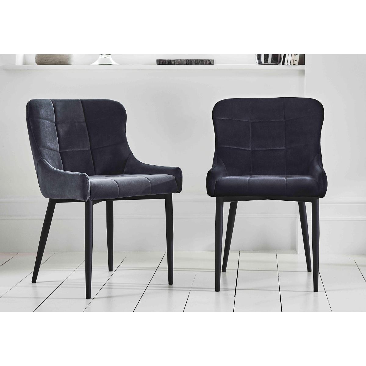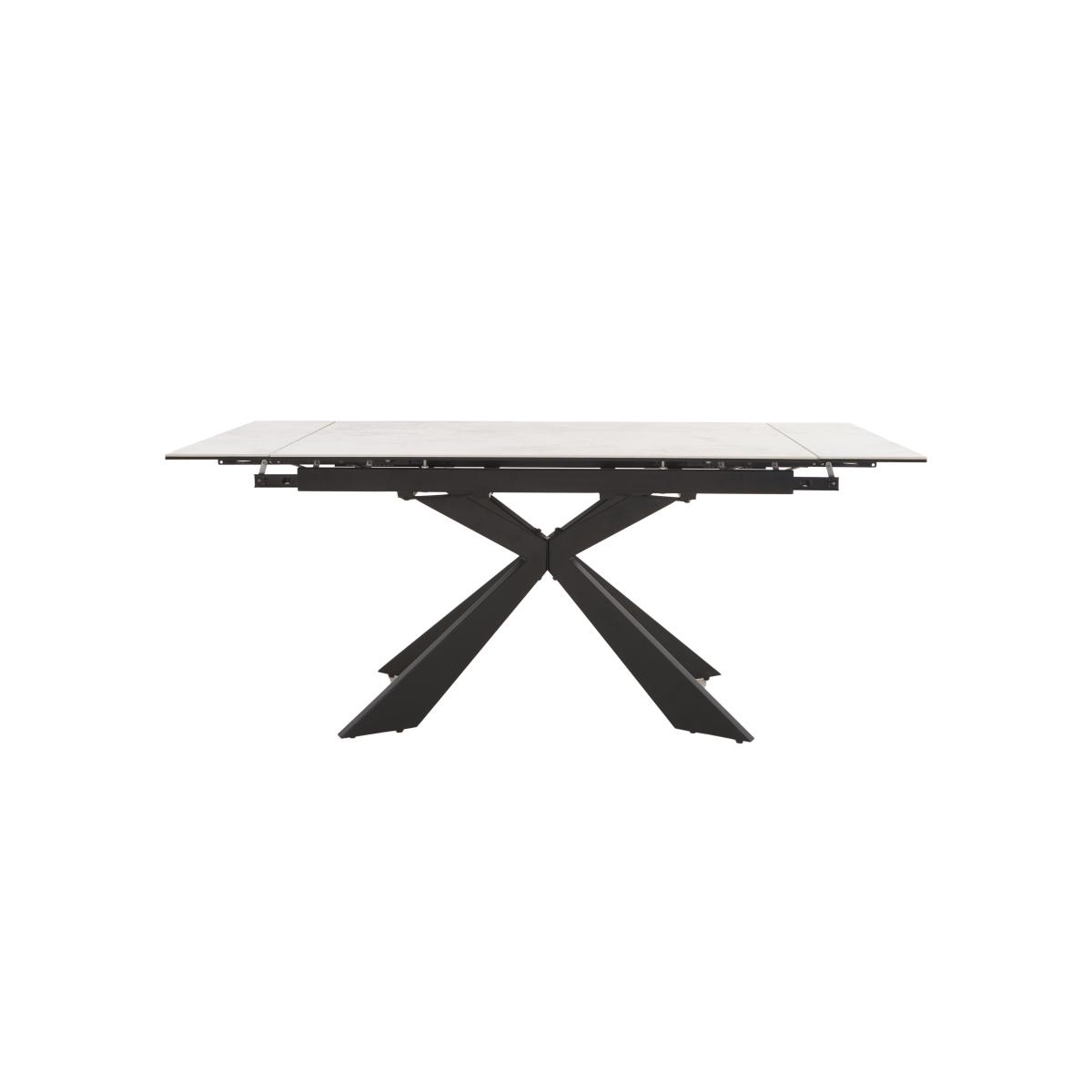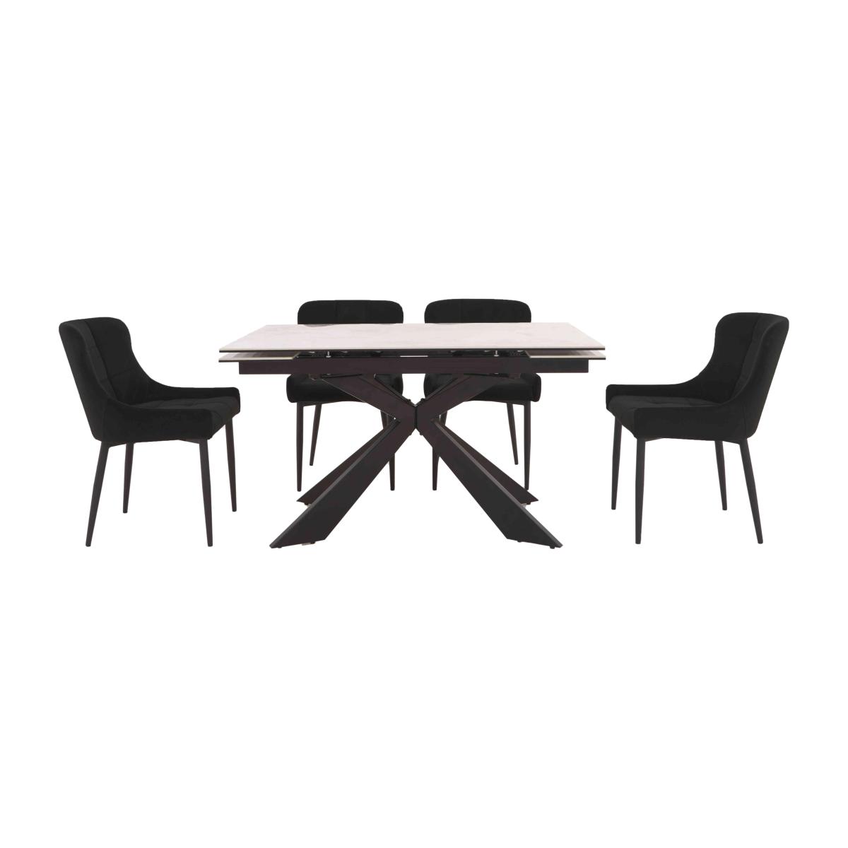 Kos offers cool modern style that's just the right size for smaller dining rooms and living spaces. This statement range features dining tables and occasional tables with gorgeous high-gloss ceramic tops and showstopping metal bases, beautifully upholstered dining chairs that juxtapose curved lines with bold geometric stitching and effortlessly stylish rounded-end sideboards with hidden storage. The dining table is also available as an extendable table with an extra leaf that smoothly slides into place so you can make room for a couple more diners in double quick time. Sleek by design and easy to bring home, the Kos range just fits so well – and in more ways than one. Perfect for everyday dining, this ceramic-topped dining table quickly extends to seat two more. You and your guests will love the sleek ceramic finish. Set includes four beautiful velvet chairs. Why you'll love it On-trend dining set features a ceramic-topped extending dining table with a star-shaped base. Cool modern style, compact proportions. Dining table has a high-gloss ceramic finish with a grey and white marble effect. Extends in seconds with a simple drop leaf mechanism. Ceramic is hardwearing and easy to clean. Dining set includes 4 Kos velvet dining chairs with black metal legs. Stylish curves with geometric stitching and piped edges. In black or granite velvet. Only at Furniture Village. This dining set is part of the Kos range. What you need to know This 130 cm dining table seats 6 and extends to 180 cm to seat 8. Top is made of ceramic on 8 mm tempered glass. Black powder-coated stainless steel base. Ceramic is highly durable, and heat and scratch resistant. Dining chairs have foam seat cushioning and powder-coated stainless steel legs. Some fabrics can show wear on areas of more use or in direct sunlight. Flattening and shading of heavy wear areas on pile fabrics like velvet is unavoidable.