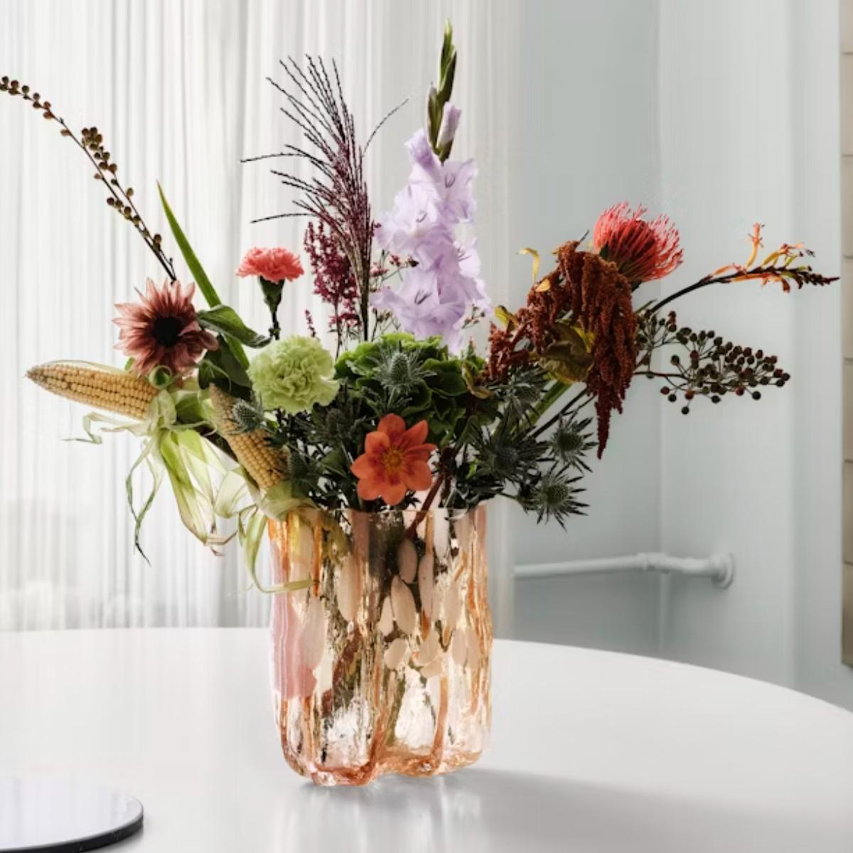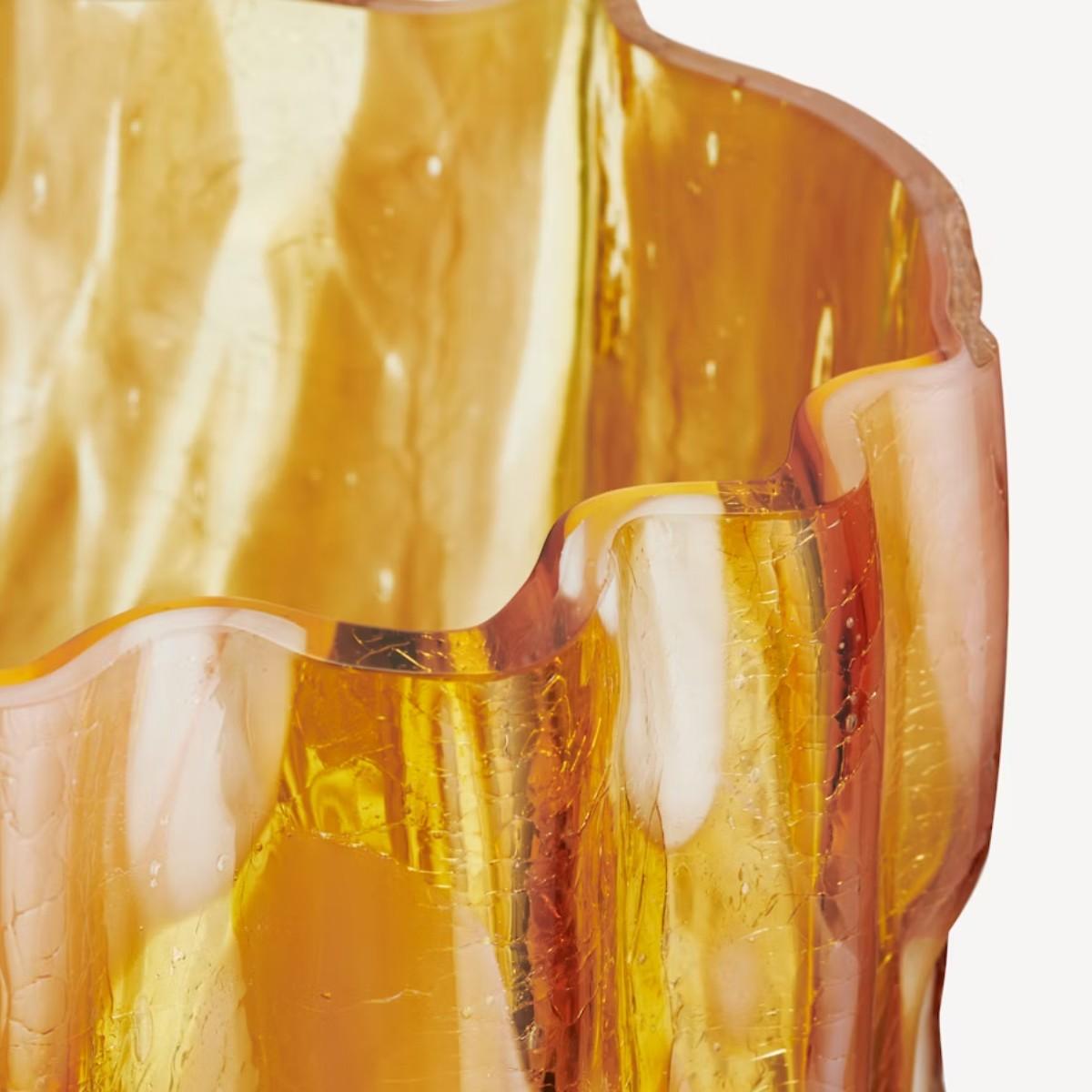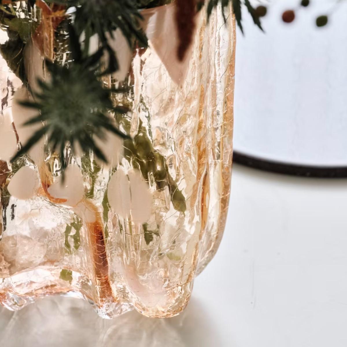 The crackle vase in amber flamingo is a stunning piece that adds textural interest and colour to any space. I love its rich amber hue combined with the intricate crackle glass finish, making it both a functional and artful element. It works brilliantly in contemporary interiors for a pop of colour, but also suits boho or eclectic styles where its organic shape can complement natural textures. For practical styling, I recommend pairing it with minimalist floral arrangements to highlight its colour or leaving it as a sculptural piece on its own. Its rounded, textured form ensures it stands out whether used as a standalone decorative object or filled with seasonal stems for added visual appeal.