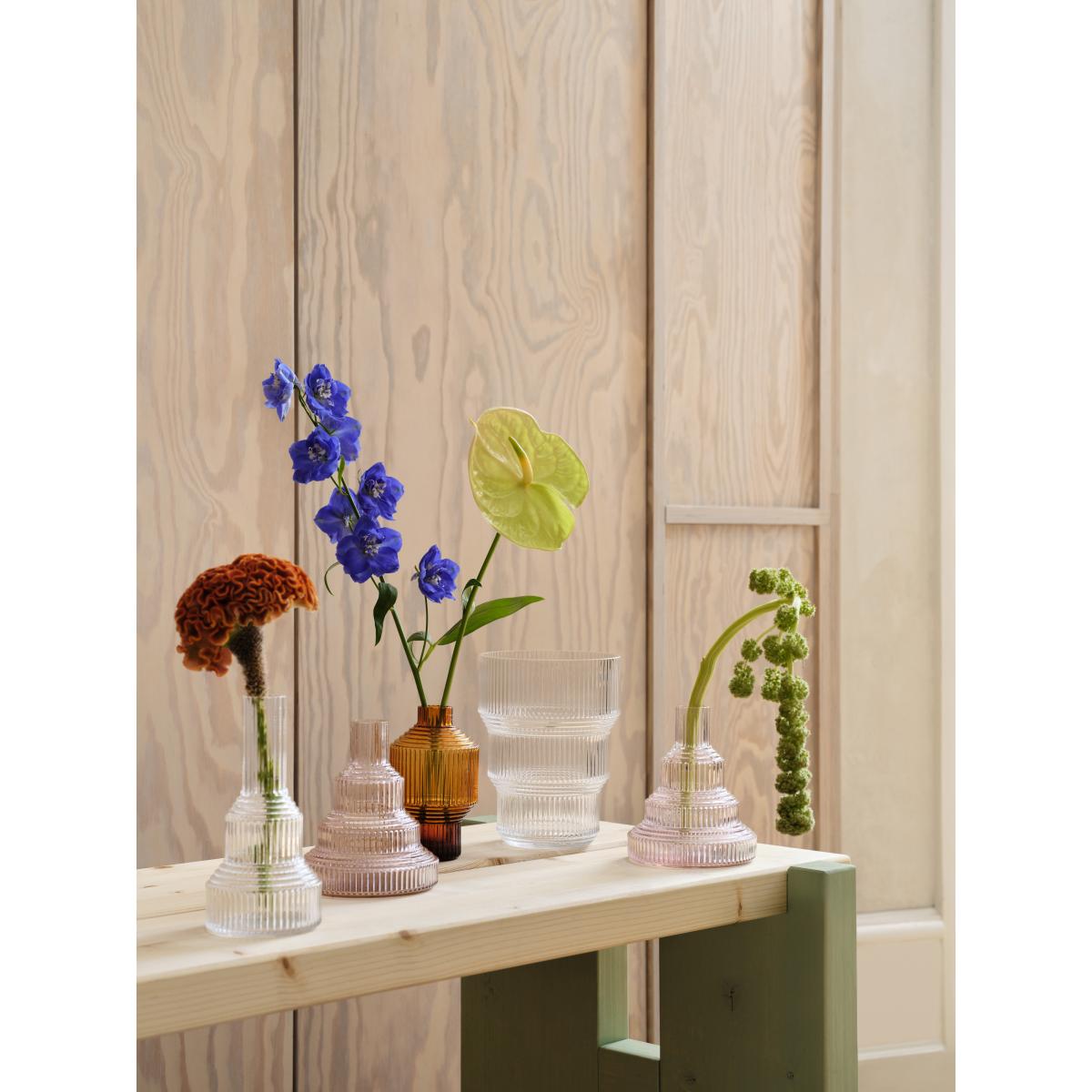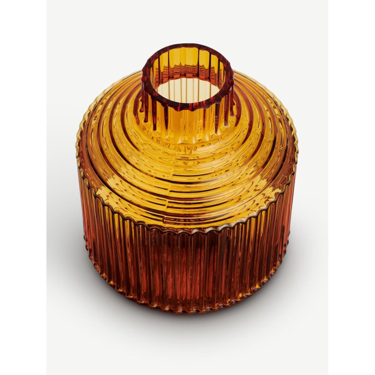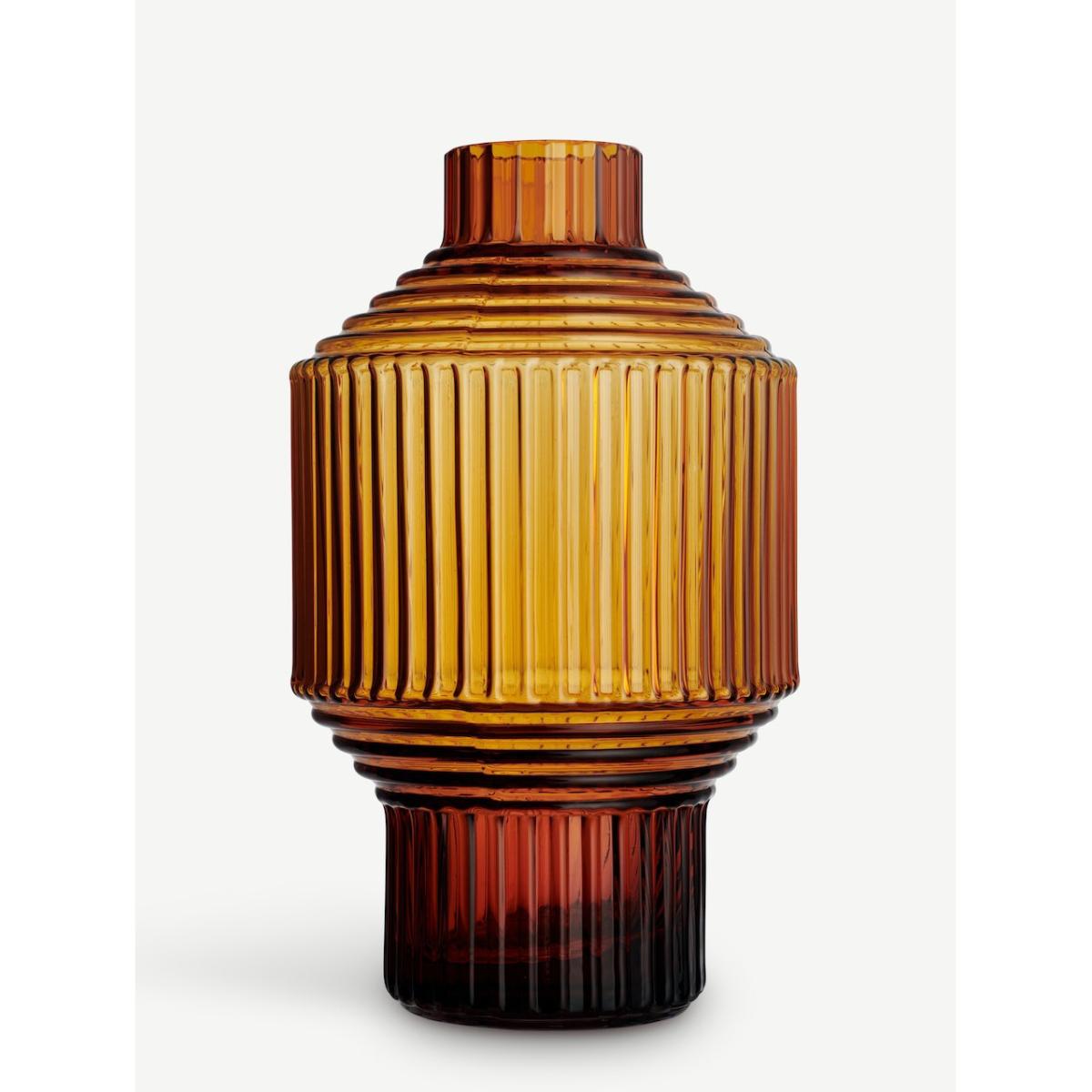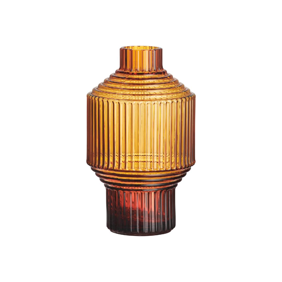 The Kosta Boda Pavilion vase in dark amber is a striking statement piece that works well in contemporary or mid-century inspired interiors. Its textured, ribbed design adds tactile interest and visual depth, making it perfect for displaying a few simple floral arrangements or even on its own as a decorative object. I love pairing it with warm-toned ceramics or metals to enhance its rich amber hue. For practical styling tips, place it on a wooden or glass surface to highlight its colour and texture, and keep floral arrangements minimal to let the vase's design shine. This piece works great in lounges, dining areas, or even as an eye-catching console table accent.