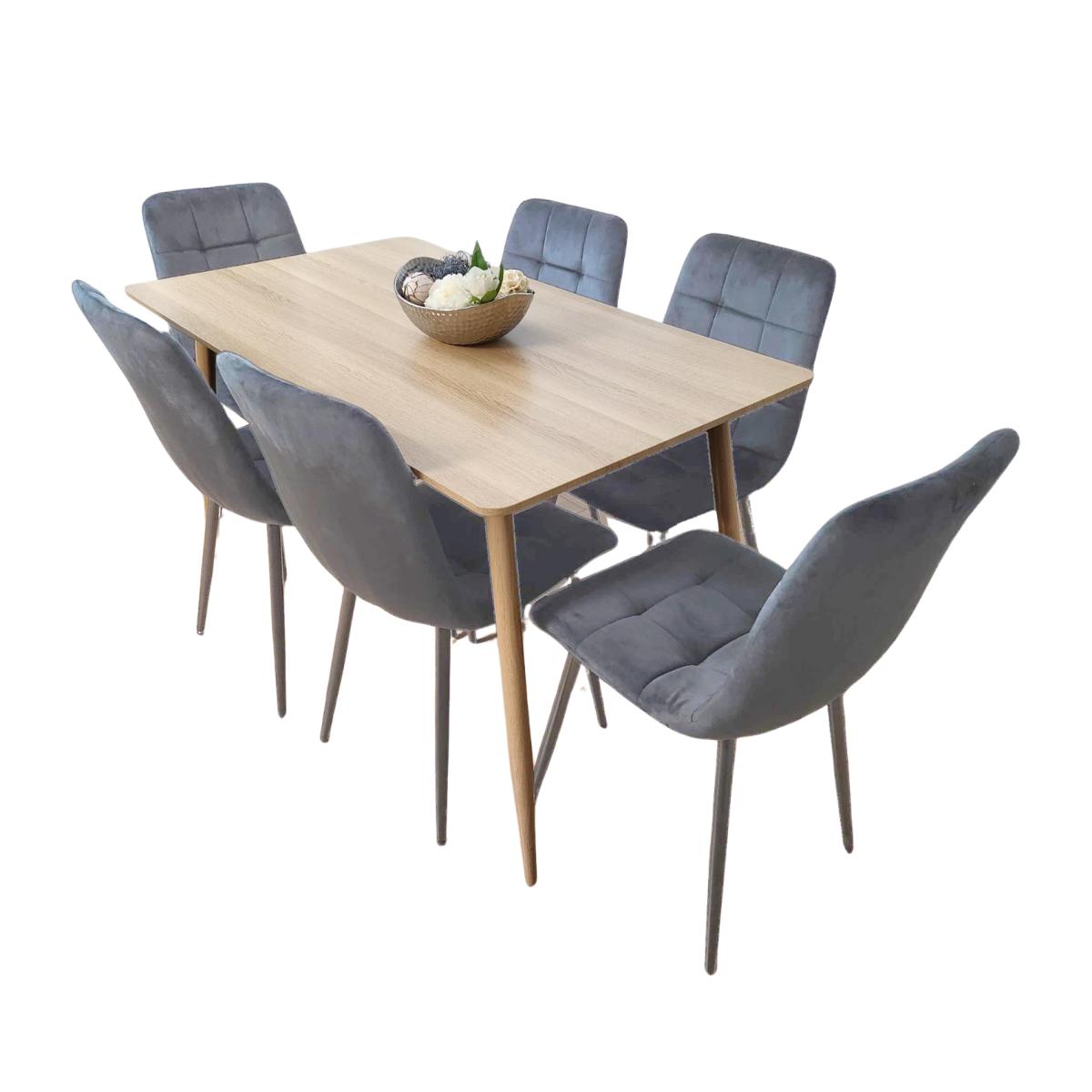 This stunning rectangular dining table set features a beautiful beige oak-effect design and includes six tufted grey velvet Rocco chairs, each with a slightly curved backrest to comfortably support the body. The table is crafted from high-quality MDF with a melamine laminated finish for enhanced durability and is supported by sturdy metal legs wrapped in a decorative wood-effect coating. The chairs are upholstered in premium velvet and fitted with strong metal legs to ensure long-lasting style and comfort. Designed with everyday functionality and elegance in mind, this dining set comes with clear instructions for straightforward assembly.