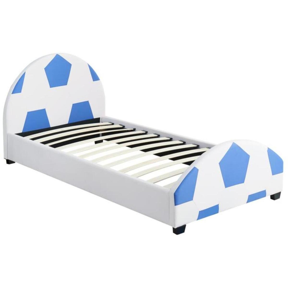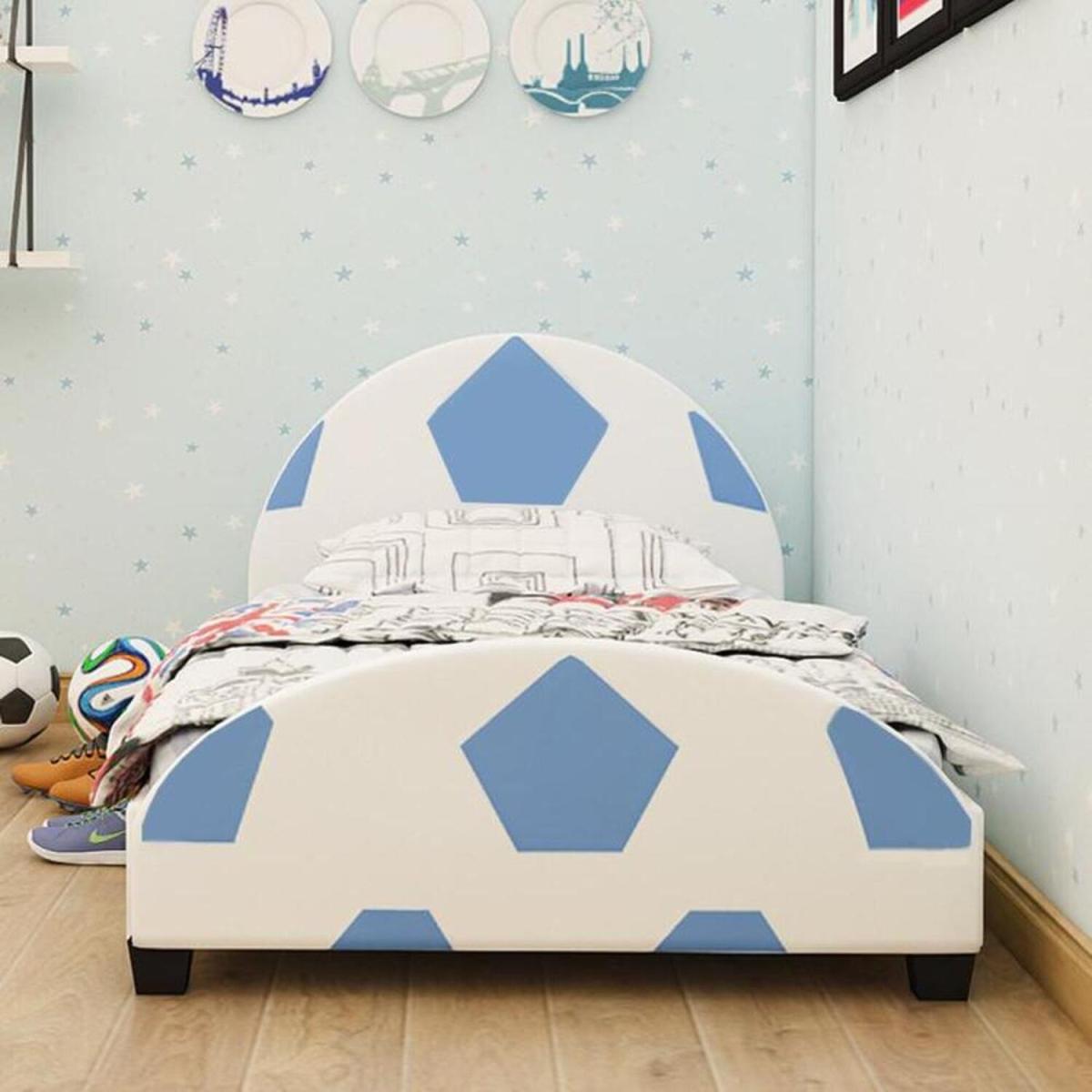 Transform your child's bedroom with this football design faux leather bed, adding such style, fun and practicality. Super vibrant colours to make the bedroom stand out from the crowd. The headboard is stunningly designed in the shape and design of a football and in gorgeous light and bright colours, to suit different football teams. BLUE and white combination, to match a blue themed room, or to support your football team such as Chelsea FC, Manchester City etc.