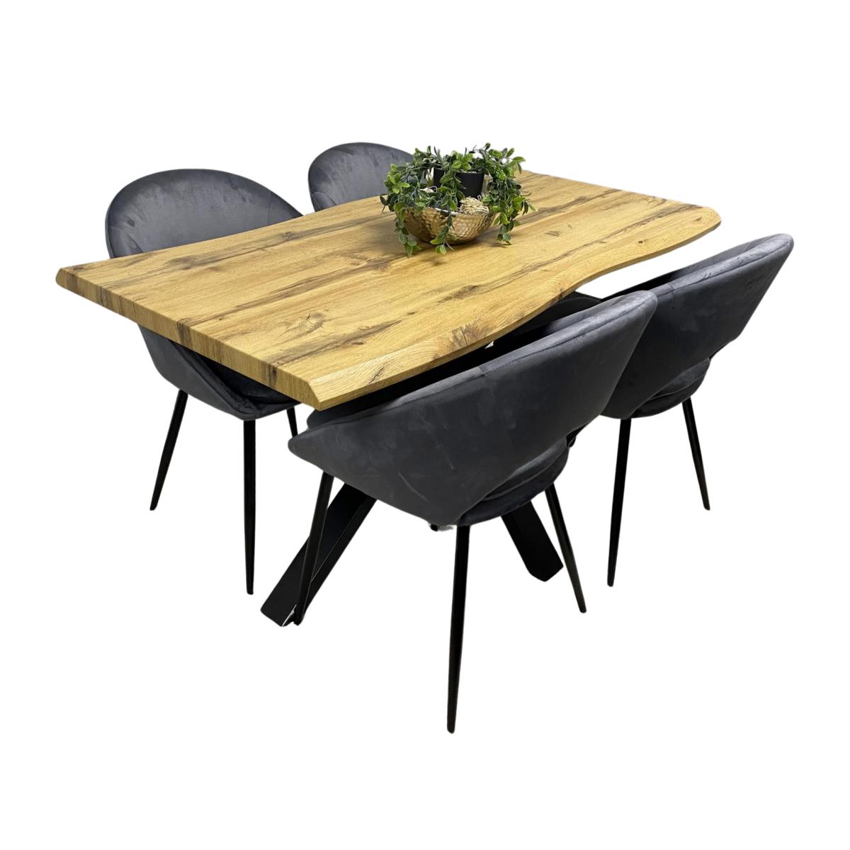 Upgrade your dining space with this elegant and durable dining set, featuring a sturdy wooden dining table with a curved edge and X-shaped iron legs for maximum stability. Designed for both style and functionality, this table offers a spacious surface perfect for dining, work or study. Paired with four plush grey velvet dining chairs, this set brings a touch of luxury and comfort to your home. The chairs feature premium velvet upholstery, ergonomic backrests, and sturdy powder coated metal legs, ensuring both style and support. Whether you're hosting guests or enjoying everyday meals, this versatile dining set is the perfect addition to any kitchen or dining area.