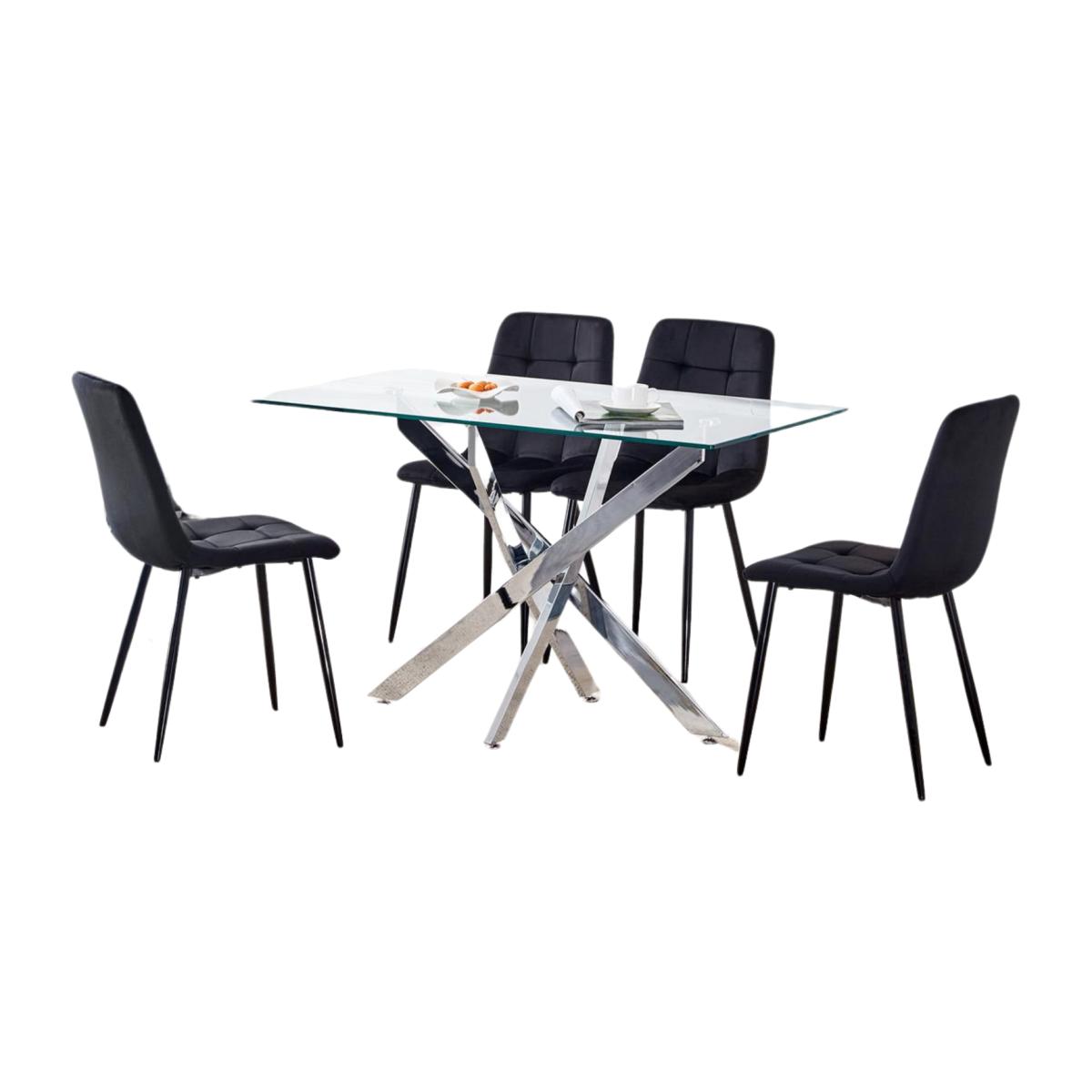 The Kosy Koala dining table set features a modern round design with a durable tempered glass top and sleek chrome legs, accompanied by four high-quality velvet chairs. The chairs are available in black, blue, green and grey colours. The chic design and compact size of the table make it a perfect centrepiece for smaller spaces. The precision-curved armless chairs with padded cushioned seats offer luxurious comfort and sophistication. This set blends seamlessly with various decor styles and is easy to assemble in a flat-pack format, creating a stylish and inviting atmosphere in any modern home. The chairs are made from premium velvet with sturdy metal legs. Sleek chrome legs enhance the contemporary aesthetic of your dining area. The high-quality velvet chairs provide durability and a luxurious feel. The seat height of these chairs is 45 cm, ensuring a cosy and comfortable dining experience. Designed for convenience, the flat-pack format allows for easy assembly