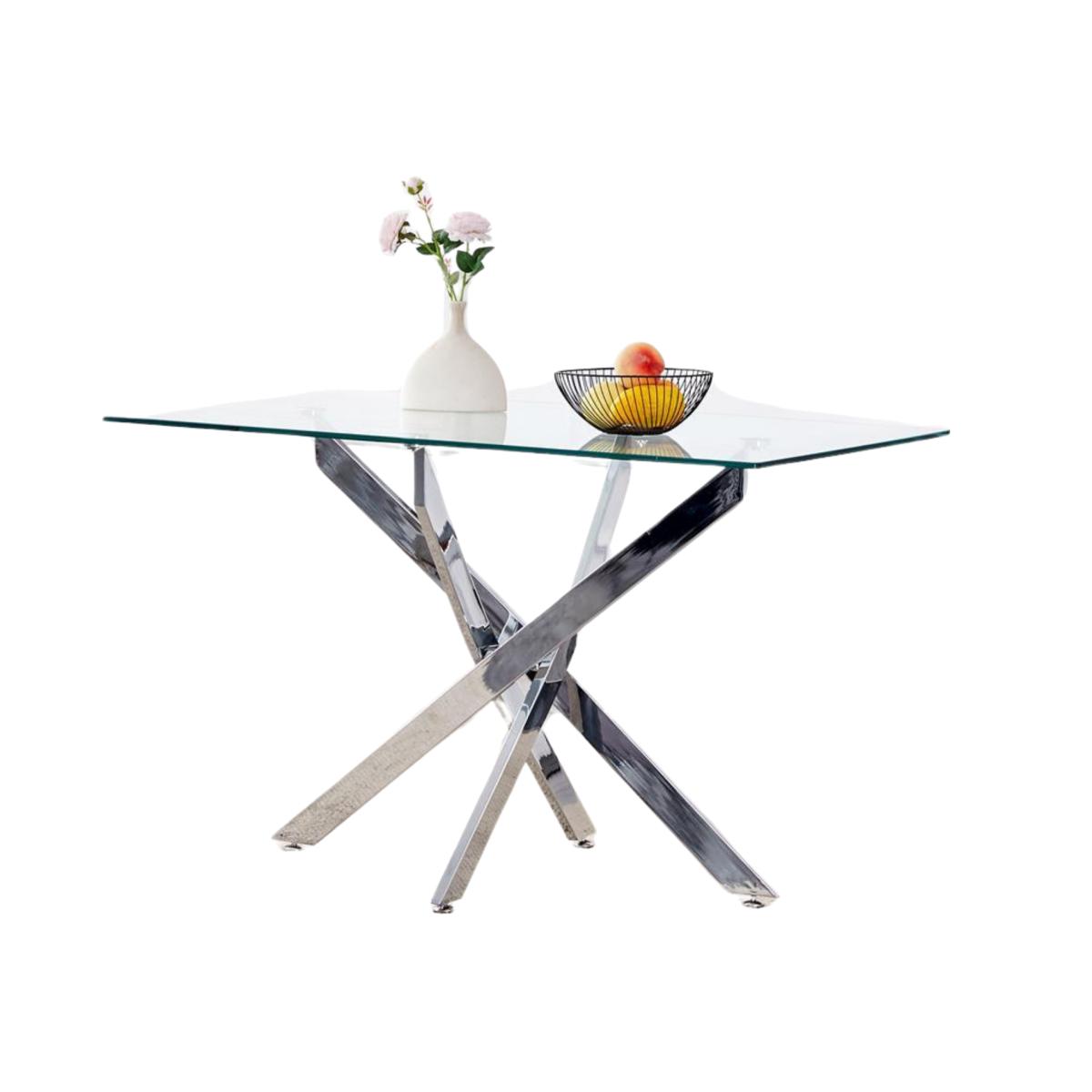 A modern rectangular dining table featuring a durable tempered glass top for long-lasting use. Perfect for adding a touch of elegance while blending seamlessly with your decor. The table has a clear glass top paired with chrome legs creating a chic, contemporary look that enhances any room. Its size is ideal for smaller spaces while still serving as a striking centrepiece. Bring sleek style to your dining area with this modern rectangular glass dining table. Straightforward assembly is made easy with clear instructions. Practical yet space saving, it is ideal for smaller dining areas.