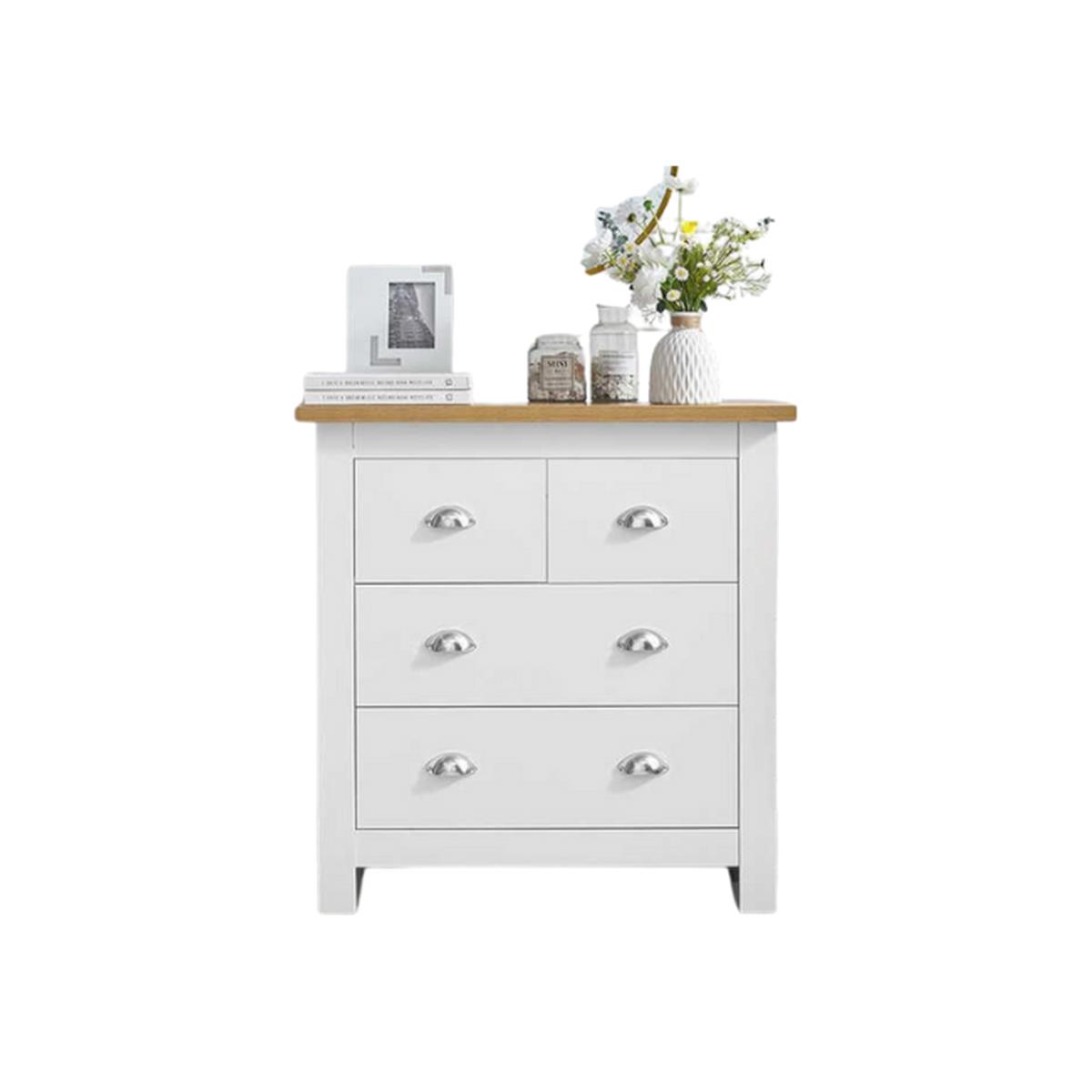 Organise your space with this stylish and practical chest of drawers. Featuring a light wood finish top and a crisp white base, it adds a modern yet timeless touch to any room. With four spacious drawers, it provides ample storage for clothing, linens, or essentials, keeping your home neat and clutter-free. The sturdy construction ensures durability, while the polished silver handles offer a refined touch. This elegant storage solution blends seamlessly with various interior styles and is perfect for bedrooms, living rooms, or hallways. Simple to assemble with clear instructions, it is both functional and visually appealing.