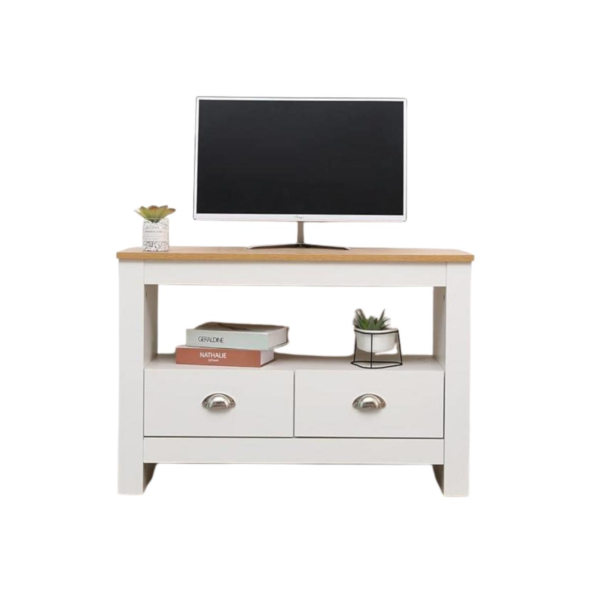 Upgrade your living space with this stylish TV cabinet, featuring a natural wooden top and a white base for a modern touch. Its open shelf and two spacious drawers offer a perfect mix of display and concealed storage, keeping your media area neat and organised. Designed for durability and elegance, it fits most TVs while complementing various decor styles. Easy to assemble with clear instructions.