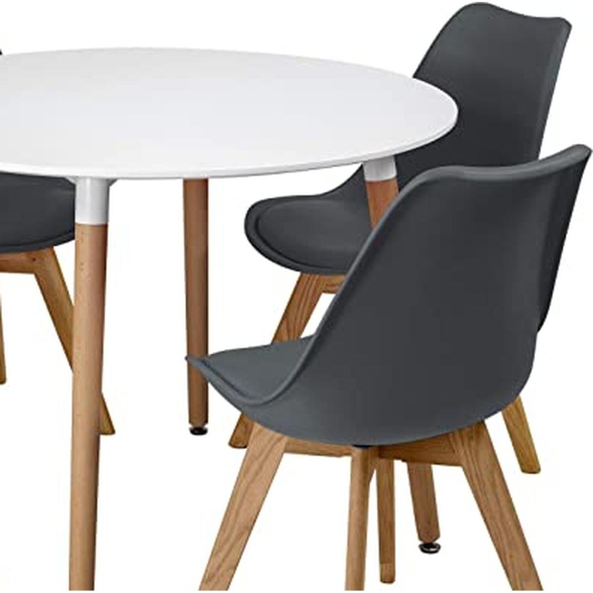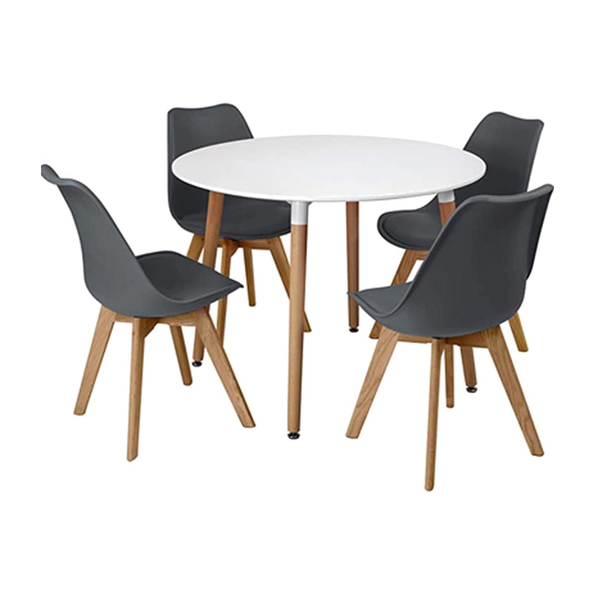 Transform your dining room or kitchen with this stunning and sophisticated Round White Table and Dark Grey 4 chairs. A great addition to your dining room or kitchen that is both modern and eye-catching. The chairs are of a classic design, the plastic curved so sophisticatedly and it has a cushioned seat for that extra comfort. Polypropylene matte finish for the table and rubber pads under the feet protect your floor from scratches. This gorgeous table and chairs come in a range of colours to compliment your dining room. The table and chairs come flat packed and require some home assembly.
