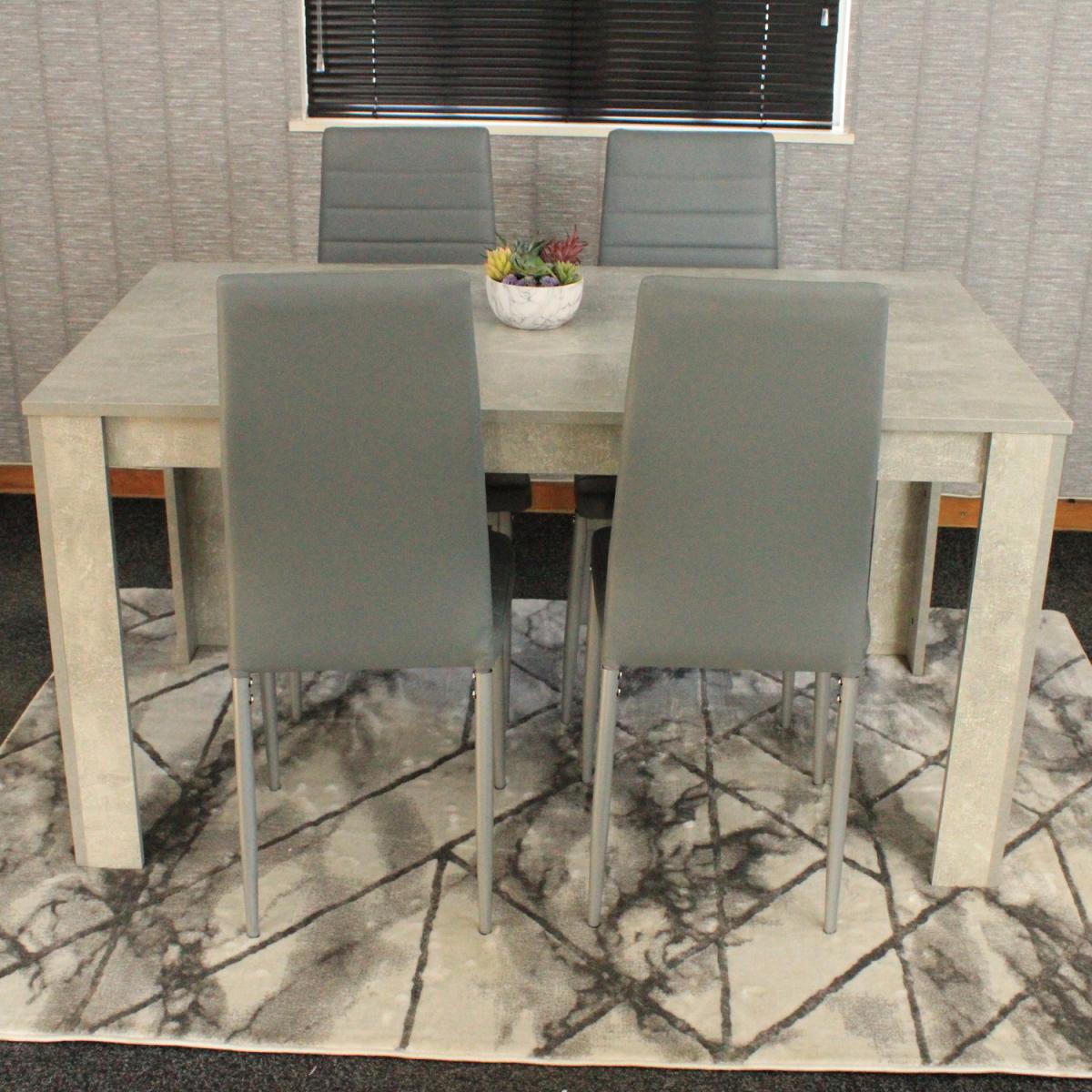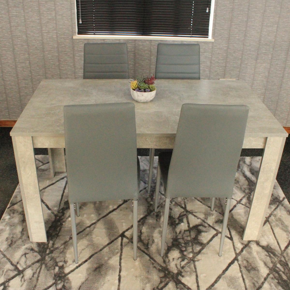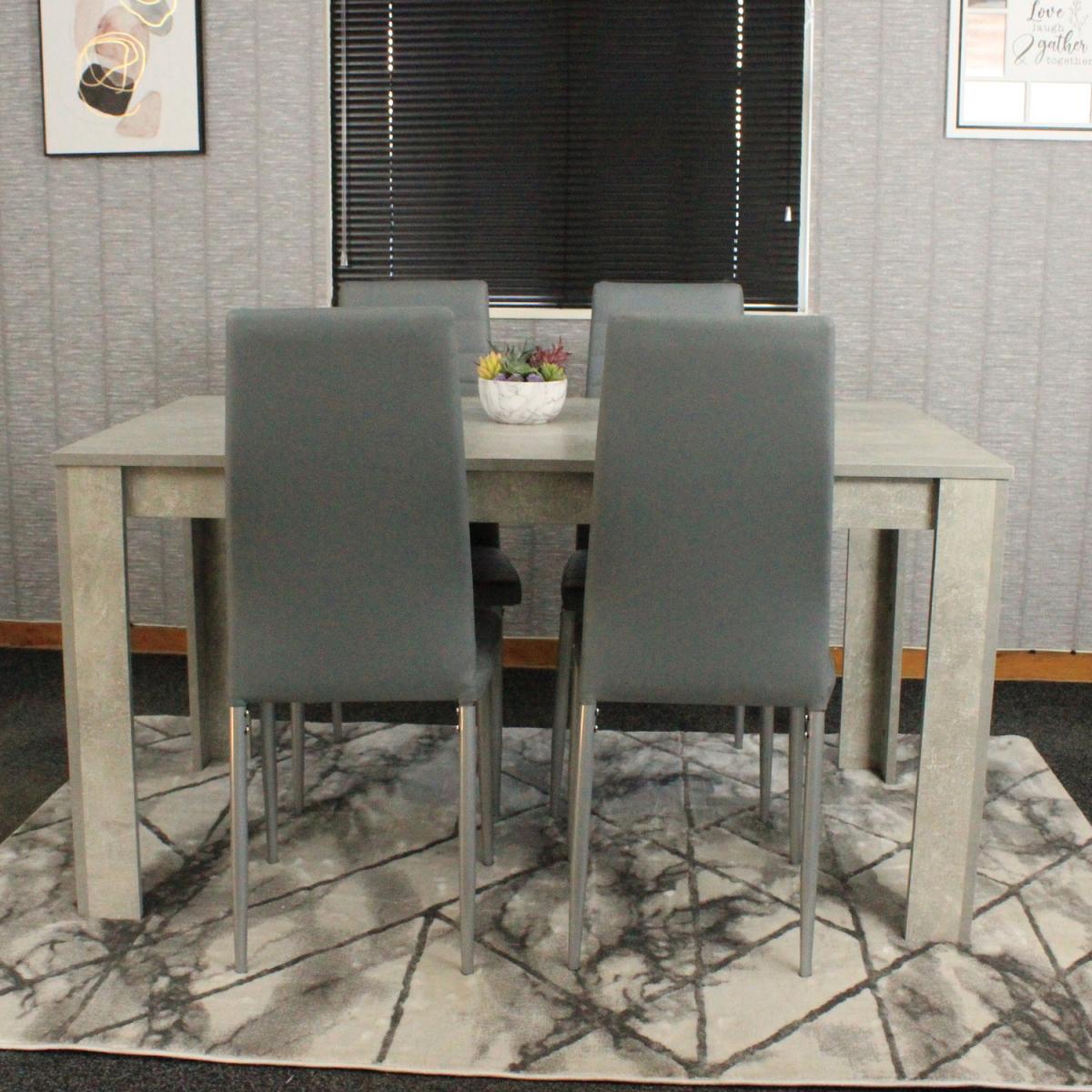 This dining set strikes a great balance between contemporary style and practicality. I love the neutral stone grey tone of the table - it’s versatile enough to slot into both modern and more relaxed interiors, such as minimalist, industrial, or Scandi schemes. The matching grey chairs add cohesion while maintaining a sleek look. For styling, I recommend pairing this set with colourful or textured tableware to create visual interest or keeping it simple with monochrome accessories for a refined feel. It works well in open-plan kitchens, dining rooms, or even as a statement piece in a more eclectic space. To keep it looking its best, consider coasters or placemats to prevent scratches on the stone surface and complement the grey palette with soft textiles like plush throws or cushions around the room for added comfort.